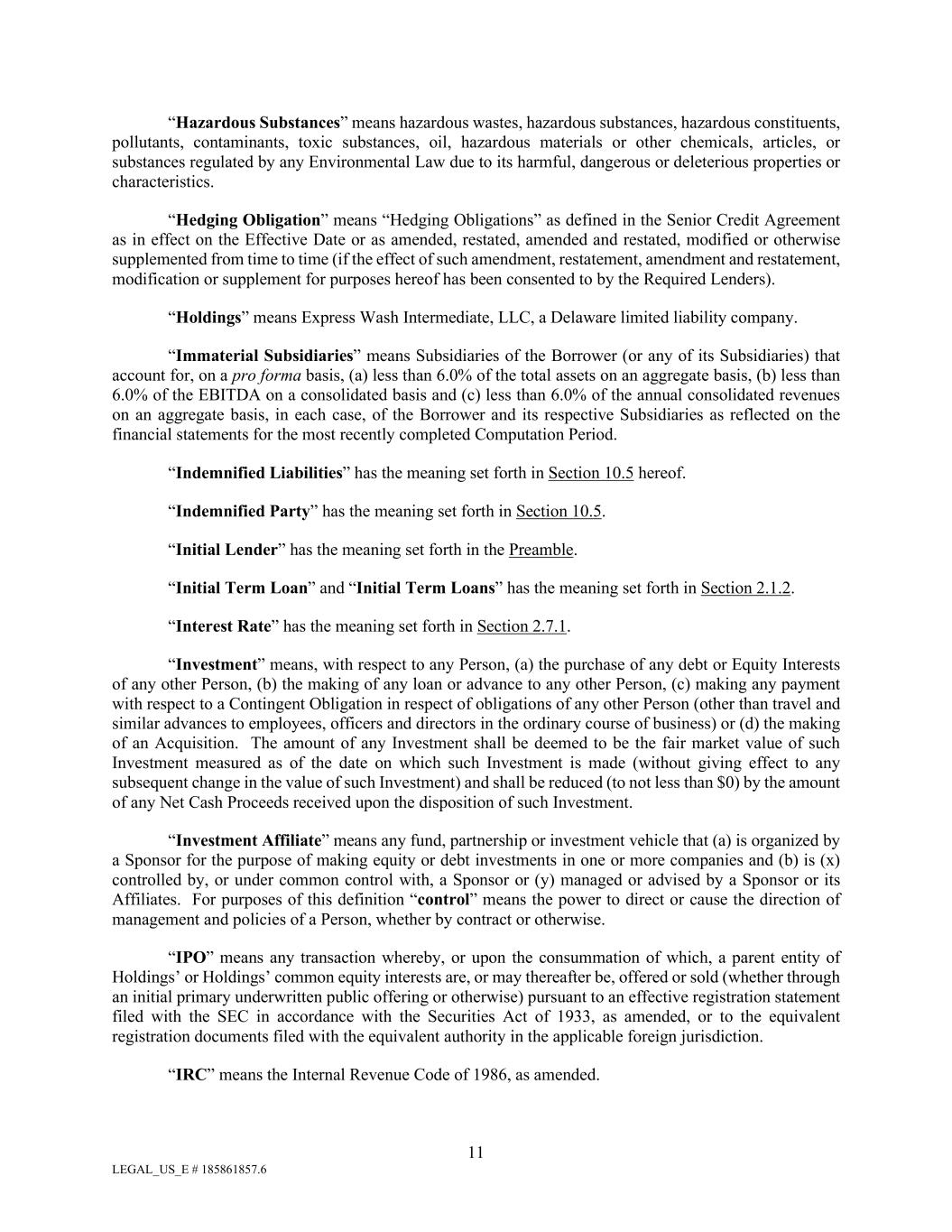 11 LEGAL_US_E # 185861857.6 “Hazardous Substances” means hazardous wastes, hazardous substances, hazardous constituents, pollutants, contaminants, toxic substances, oil, hazardous materials or other chemicals, articles, or substances regulated by any Environmental Law due to its harmful, dangerous or deleterious properties or characteristics. “Hedging Obligation” means “Hedging Obligations” as defined in the Senior Credit Agreement as in effect on the Effective Date or as amended, restated, amended and restated, modified or otherwise supplemented from time to time (if the effect of such amendment, restatement, amendment and restatement, modification or supplement for purposes hereof has been consented to by the Required Lenders). “Holdings” means Express Wash Intermediate, LLC, a Delaware limited liability company. “Immaterial Subsidiaries” means Subsidiaries of the Borrower (or any of its Subsidiaries) that account for, on a pro forma basis, (a) less than 6.0% of the total assets on an aggregate basis, (b) less than 6.0% of the EBITDA on a consolidated basis and (c) less than 6.0% of the annual consolidated revenues on an aggregate basis, in each case, of the Borrower and its respective Subsidiaries as reflected on the financial statements for the most recently completed Computation Period. “Indemnified Liabilities” has the meaning set forth in Section 10.5 hereof. “Indemnified Party” has the meaning set forth in Section 10.5. “Initial Lender” has the meaning set forth in the Preamble. “Initial Term Loan” and “Initial Term Loans” has the meaning set forth in Section 2.1.2. “Interest Rate” has the meaning set forth in Section 2.7.1. “Investment” means, with respect to any Person, (a) the purchase of any debt or Equity Interests of any other Person, (b) the making of any loan or advance to any other Person, (c) making any payment with respect to a Contingent Obligation in respect of obligations of any other Person (other than travel and similar advances to employees, officers and directors in the ordinary course of business) or (d) the making of an Acquisition. The amount of any Investment shall be deemed to be the fair market value of such Investment measured as of the date on which such Investment is made (without giving effect to any subsequent change in the value of such Investment) and shall be reduced (to not less than $0) by the amount of any Net Cash Proceeds received upon the disposition of such Investment. “Investment Affiliate” means any fund, partnership or investment vehicle that (a) is organized by a Sponsor for the purpose of making equity or debt investments in one or more companies and (b) is (x) controlled by, or under common control with, a Sponsor or (y) managed or advised by a Sponsor or its Affiliates. For purposes of this definition “control” means the power to direct or cause the direction of management and policies of a Person, whether by contract or otherwise. “IPO” means any transaction whereby, or upon the consummation of which, a parent entity of Holdings’ or Holdings’ common equity interests are, or may thereafter be, offered or sold (whether through an initial primary underwritten public offering or otherwise) pursuant to an effective registration statement filed with the SEC in accordance with the Securities Act of 1933, as amended, or to the equivalent registration documents filed with the equivalent authority in the applicable foreign jurisdiction. “IRC” means the Internal Revenue Code of 1986, as amended.