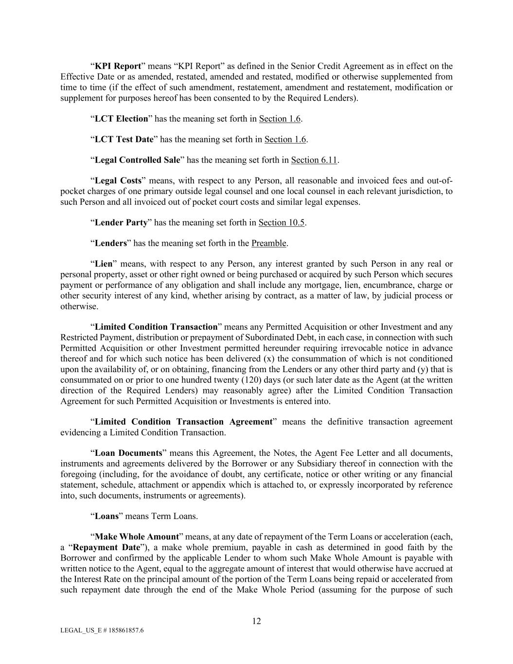 12 LEGAL_US_E # 185861857.6 “KPI Report” means “KPI Report” as defined in the Senior Credit Agreement as in effect on the Effective Date or as amended, restated, amended and restated, modified or otherwise supplemented from time to time (if the effect of such amendment, restatement, amendment and restatement, modification or supplement for purposes hereof has been consented to by the Required Lenders). “LCT Election” has the meaning set forth in Section 1.6. “LCT Test Date” has the meaning set forth in Section 1.6. “Legal Controlled Sale” has the meaning set forth in Section 6.11. “Legal Costs” means, with respect to any Person, all reasonable and invoiced fees and out-of- pocket charges of one primary outside legal counsel and one local counsel in each relevant jurisdiction, to such Person and all invoiced out of pocket court costs and similar legal expenses. “Lender Party” has the meaning set forth in Section 10.5. “Lenders” has the meaning set forth in the Preamble. “Lien” means, with respect to any Person, any interest granted by such Person in any real or personal property, asset or other right owned or being purchased or acquired by such Person which secures payment or performance of any obligation and shall include any mortgage, lien, encumbrance, charge or other security interest of any kind, whether arising by contract, as a matter of law, by judicial process or otherwise. “Limited Condition Transaction” means any Permitted Acquisition or other Investment and any Restricted Payment, distribution or prepayment of Subordinated Debt, in each case, in connection with such Permitted Acquisition or other Investment permitted hereunder requiring irrevocable notice in advance thereof and for which such notice has been delivered (x) the consummation of which is not conditioned upon the availability of, or on obtaining, financing from the Lenders or any other third party and (y) that is consummated on or prior to one hundred twenty (120) days (or such later date as the Agent (at the written direction of the Required Lenders) may reasonably agree) after the Limited Condition Transaction Agreement for such Permitted Acquisition or Investments is entered into. “Limited Condition Transaction Agreement” means the definitive transaction agreement evidencing a Limited Condition Transaction. “Loan Documents” means this Agreement, the Notes, the Agent Fee Letter and all documents, instruments and agreements delivered by the Borrower or any Subsidiary thereof in connection with the foregoing (including, for the avoidance of doubt, any certificate, notice or other writing or any financial statement, schedule, attachment or appendix which is attached to, or expressly incorporated by reference into, such documents, instruments or agreements). “Loans” means Term Loans. “Make Whole Amount” means, at any date of repayment of the Term Loans or acceleration (each, a “Repayment Date”), a make whole premium, payable in cash as determined in good faith by the Borrower and confirmed by the applicable Lender to whom such Make Whole Amount is payable with written notice to the Agent, equal to the aggregate amount of interest that would otherwise have accrued at the Interest Rate on the principal amount of the portion of the Term Loans being repaid or accelerated from such repayment date through the end of the Make Whole Period (assuming for the purpose of such