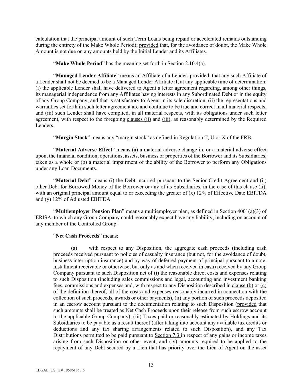 13 LEGAL_US_E # 185861857.6 calculation that the principal amount of such Term Loans being repaid or accelerated remains outstanding during the entirety of the Make Whole Period); provided that, for the avoidance of doubt, the Make Whole Amount is not due on any amounts held by the Initial Lender and its Affiliates. “Make Whole Period” has the meaning set forth in Section 2.10.4(a). “Managed Lender Affiliate” means an Affiliate of a Lender, provided, that any such Affiliate of a Lender shall not be deemed to be a Managed Lender Affiliate if, at any applicable time of determination: (i) the applicable Lender shall have delivered to Agent a letter agreement regarding, among other things, its managerial independence from any Affiliates having interests in any Subordinated Debt or in the equity of any Group Company, and that is satisfactory to Agent in its sole discretion, (ii) the representations and warranties set forth in such letter agreement are and continue to be true and correct in all material respects, and (iii) such Lender shall have complied, in all material respects, with its obligations under such letter agreement, with respect to the foregoing clauses (ii) and (iii), as reasonably determined by the Required Lenders. “Margin Stock” means any “margin stock” as defined in Regulation T, U or X of the FRB. “Material Adverse Effect” means (a) a material adverse change in, or a material adverse effect upon, the financial condition, operations, assets, business or properties of the Borrower and its Subsidiaries, taken as a whole or (b) a material impairment of the ability of the Borrower to perform any Obligations under any Loan Documents. “Material Debt” means (i) the Debt incurred pursuant to the Senior Credit Agreement and (ii) other Debt for Borrowed Money of the Borrower or any of its Subsidiaries, in the case of this clause (ii), with an original principal amount equal to or exceeding the greater of (x) 12% of Effective Date EBITDA and (y) 12% of Adjusted EBITDA. “Multiemployer Pension Plan” means a multiemployer plan, as defined in Section 4001(a)(3) of ERISA, to which any Group Company could reasonably expect have any liability, including on account of any member of the Controlled Group. “Net Cash Proceeds” means: (a) with respect to any Disposition, the aggregate cash proceeds (including cash proceeds received pursuant to policies of casualty insurance (but not, for the avoidance of doubt, business interruption insurance) and by way of deferred payment of principal pursuant to a note, installment receivable or otherwise, but only as and when received in cash) received by any Group Company pursuant to such Disposition net of (i) the reasonable direct costs and expenses relating to such Disposition (including sales commissions and legal, accounting and investment banking fees, commissions and expenses and, with respect to any Disposition described in clause (b) or (c) of the definition thereof, all of the costs and expenses reasonably incurred in connection with the collection of such proceeds, awards or other payments), (ii) any portion of such proceeds deposited in an escrow account pursuant to the documentation relating to such Disposition (provided that such amounts shall be treated as Net Cash Proceeds upon their release from such escrow account to the applicable Group Company), (iii) Taxes paid or reasonably estimated by Holdings and its Subsidiaries to be payable as a result thereof (after taking into account any available tax credits or deductions and any tax sharing arrangements related to such Disposition), and any Tax Distributions permitted to be paid pursuant to Section 7.3 in respect of any gains or income taxes arising from such Disposition or other event, and (iv) amounts required to be applied to the repayment of any Debt secured by a Lien that has priority over the Lien of Agent on the asset