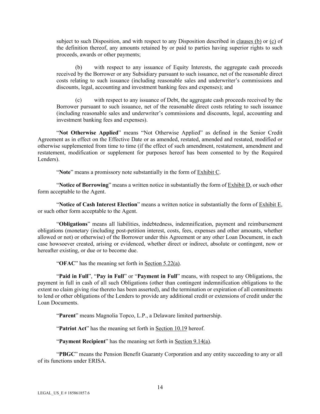 14 LEGAL_US_E # 185861857.6 subject to such Disposition, and with respect to any Disposition described in clauses (b) or (c) of the definition thereof, any amounts retained by or paid to parties having superior rights to such proceeds, awards or other payments; (b) with respect to any issuance of Equity Interests, the aggregate cash proceeds received by the Borrower or any Subsidiary pursuant to such issuance, net of the reasonable direct costs relating to such issuance (including reasonable sales and underwriter’s commissions and discounts, legal, accounting and investment banking fees and expenses); and (c) with respect to any issuance of Debt, the aggregate cash proceeds received by the Borrower pursuant to such issuance, net of the reasonable direct costs relating to such issuance (including reasonable sales and underwriter’s commissions and discounts, legal, accounting and investment banking fees and expenses). “Not Otherwise Applied” means “Not Otherwise Applied” as defined in the Senior Credit Agreement as in effect on the Effective Date or as amended, restated, amended and restated, modified or otherwise supplemented from time to time (if the effect of such amendment, restatement, amendment and restatement, modification or supplement for purposes hereof has been consented to by the Required Lenders). “Note” means a promissory note substantially in the form of Exhibit C. “Notice of Borrowing” means a written notice in substantially the form of Exhibit D, or such other form acceptable to the Agent. “Notice of Cash Interest Election” means a written notice in substantially the form of Exhibit E, or such other form acceptable to the Agent. “Obligations” means all liabilities, indebtedness, indemnification, payment and reimbursement obligations (monetary (including post-petition interest, costs, fees, expenses and other amounts, whether allowed or not) or otherwise) of the Borrower under this Agreement or any other Loan Document, in each case howsoever created, arising or evidenced, whether direct or indirect, absolute or contingent, now or hereafter existing, or due or to become due. “OFAC” has the meaning set forth in Section 5.22(a). “Paid in Full”, “Pay in Full” or “Payment in Full” means, with respect to any Obligations, the payment in full in cash of all such Obligations (other than contingent indemnification obligations to the extent no claim giving rise thereto has been asserted), and the termination or expiration of all commitments to lend or other obligations of the Lenders to provide any additional credit or extensions of credit under the Loan Documents. “Parent” means Magnolia Topco, L.P., a Delaware limited partnership. “Patriot Act” has the meaning set forth in Section 10.19 hereof. “Payment Recipient” has the meaning set forth in Section 9.14(a). “PBGC” means the Pension Benefit Guaranty Corporation and any entity succeeding to any or all of its functions under ERISA.
