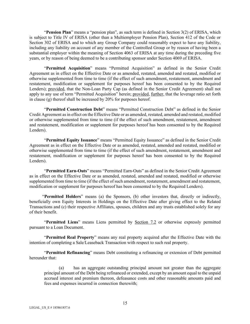 15 LEGAL_US_E # 185861857.6 “Pension Plan” means a “pension plan”, as such term is defined in Section 3(2) of ERISA, which is subject to Title IV of ERISA (other than a Multiemployer Pension Plan), Section 412 of the Code or Section 302 of ERISA and to which any Group Company could reasonably expect to have any liability, including any liability on account of any member of the Controlled Group or by reason of having been a substantial employer within the meaning of Section 4063 of ERISA at any time during the preceding five years, or by reason of being deemed to be a contributing sponsor under Section 4069 of ERISA. “Permitted Acquisition” means “Permitted Acquisition” as defined in the Senior Credit Agreement as in effect on the Effective Date or as amended, restated, amended and restated, modified or otherwise supplemented from time to time (if the effect of such amendment, restatement, amendment and restatement, modification or supplement for purposes hereof has been consented to by the Required Lenders); provided, that the Non-Loan Party Cap (as defined in the Senior Credit Agreement) shall not apply to any use of term “Permitted Acquisition” herein; provided, further, that the leverage ratio set forth in clause (g) thereof shall be increased by 20% for purposes hereof. “Permitted Construction Debt” means “Permitted Construction Debt” as defined in the Senior Credit Agreement as in effect on the Effective Date or as amended, restated, amended and restated, modified or otherwise supplemented from time to time (if the effect of such amendment, restatement, amendment and restatement, modification or supplement for purposes hereof has been consented to by the Required Lenders). “Permitted Equity Issuance” means “Permitted Equity Issuance” as defined in the Senior Credit Agreement as in effect on the Effective Date or as amended, restated, amended and restated, modified or otherwise supplemented from time to time (if the effect of such amendment, restatement, amendment and restatement, modification or supplement for purposes hereof has been consented to by the Required Lenders). “Permitted Earn-Outs” means “Permitted Earn-Outs” as defined in the Senior Credit Agreement as in effect on the Effective Date or as amended, restated, amended and restated, modified or otherwise supplemented from time to time (if the effect of such amendment, restatement, amendment and restatement, modification or supplement for purposes hereof has been consented to by the Required Lenders). “Permitted Holders” means (a) the Sponsors, (b) other investors that, directly or indirectly, beneficially own Equity Interests in Holdings on the Effective Date after giving effect to the Related Transactions and (c) their respective Affiliates, spouses, children and any trusts established solely for any of their benefit. “Permitted Liens” means Liens permitted by Section 7.2 or otherwise expressly permitted pursuant to a Loan Document. “Permitted Real Property” means any real property acquired after the Effective Date with the intention of completing a Sale/Leaseback Transaction with respect to such real property. “Permitted Refinancing” means Debt constituting a refinancing or extension of Debt permitted hereunder that: (a) has an aggregate outstanding principal amount not greater than the aggregate principal amount of the Debt being refinanced or extended, except by an amount equal to the unpaid accrued interest and premium thereon, defeasance costs and other reasonable amounts paid and fees and expenses incurred in connection therewith;