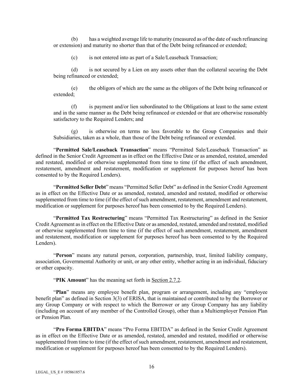 16 LEGAL_US_E # 185861857.6 (b) has a weighted average life to maturity (measured as of the date of such refinancing or extension) and maturity no shorter than that of the Debt being refinanced or extended; (c) is not entered into as part of a Sale/Leaseback Transaction; (d) is not secured by a Lien on any assets other than the collateral securing the Debt being refinanced or extended; (e) the obligors of which are the same as the obligors of the Debt being refinanced or extended; (f) is payment and/or lien subordinated to the Obligations at least to the same extent and in the same manner as the Debt being refinanced or extended or that are otherwise reasonably satisfactory to the Required Lenders; and (g) is otherwise on terms no less favorable to the Group Companies and their Subsidiaries, taken as a whole, than those of the Debt being refinanced or extended. “Permitted Sale/Leaseback Transaction” means “Permitted Sale/Leaseback Transaction” as defined in the Senior Credit Agreement as in effect on the Effective Date or as amended, restated, amended and restated, modified or otherwise supplemented from time to time (if the effect of such amendment, restatement, amendment and restatement, modification or supplement for purposes hereof has been consented to by the Required Lenders). “Permitted Seller Debt” means “Permitted Seller Debt” as defined in the Senior Credit Agreement as in effect on the Effective Date or as amended, restated, amended and restated, modified or otherwise supplemented from time to time (if the effect of such amendment, restatement, amendment and restatement, modification or supplement for purposes hereof has been consented to by the Required Lenders). “Permitted Tax Restructuring” means “Permitted Tax Restructuring” as defined in the Senior Credit Agreement as in effect on the Effective Date or as amended, restated, amended and restated, modified or otherwise supplemented from time to time (if the effect of such amendment, restatement, amendment and restatement, modification or supplement for purposes hereof has been consented to by the Required Lenders). “Person” means any natural person, corporation, partnership, trust, limited liability company, association, Governmental Authority or unit, or any other entity, whether acting in an individual, fiduciary or other capacity. “PIK Amount” has the meaning set forth in Section 2.7.2. “Plan” means any employee benefit plan, program or arrangement, including any “employee benefit plan” as defined in Section 3(3) of ERISA, that is maintained or contributed to by the Borrower or any Group Company or with respect to which the Borrower or any Group Company has any liability (including on account of any member of the Controlled Group), other than a Multiemployer Pension Plan or Pension Plan. “Pro Forma EBITDA” means “Pro Forma EBITDA” as defined in the Senior Credit Agreement as in effect on the Effective Date or as amended, restated, amended and restated, modified or otherwise supplemented from time to time (if the effect of such amendment, restatement, amendment and restatement, modification or supplement for purposes hereof has been consented to by the Required Lenders).