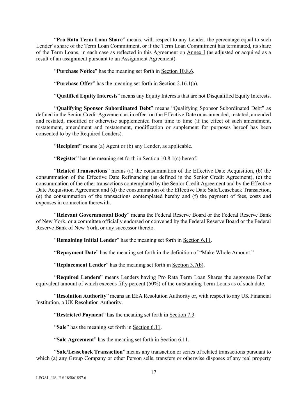 17 LEGAL_US_E # 185861857.6 “Pro Rata Term Loan Share” means, with respect to any Lender, the percentage equal to such Lender’s share of the Term Loan Commitment, or if the Term Loan Commitment has terminated, its share of the Term Loans, in each case as reflected in this Agreement on Annex I (as adjusted or acquired as a result of an assignment pursuant to an Assignment Agreement). “Purchase Notice” has the meaning set forth in Section 10.8.6. “Purchase Offer” has the meaning set forth in Section 2.16.1(a). “Qualified Equity Interests” means any Equity Interests that are not Disqualified Equity Interests. “Qualifying Sponsor Subordinated Debt” means “Qualifying Sponsor Subordinated Debt” as defined in the Senior Credit Agreement as in effect on the Effective Date or as amended, restated, amended and restated, modified or otherwise supplemented from time to time (if the effect of such amendment, restatement, amendment and restatement, modification or supplement for purposes hereof has been consented to by the Required Lenders). “Recipient” means (a) Agent or (b) any Lender, as applicable. “Register” has the meaning set forth in Section 10.8.1(c) hereof. “Related Transactions” means (a) the consummation of the Effective Date Acquisition, (b) the consummation of the Effective Date Refinancing (as defined in the Senior Credit Agreement), (c) the consummation of the other transactions contemplated by the Senior Credit Agreement and by the Effective Date Acquisition Agreement and (d) the consummation of the Effective Date Sale/Leaseback Transaction, (e) the consummation of the transactions contemplated hereby and (f) the payment of fees, costs and expenses in connection therewith. “Relevant Governmental Body” means the Federal Reserve Board or the Federal Reserve Bank of New York, or a committee officially endorsed or convened by the Federal Reserve Board or the Federal Reserve Bank of New York, or any successor thereto. “Remaining Initial Lender” has the meaning set forth in Section 6.11. “Repayment Date” has the meaning set forth in the definition of “Make Whole Amount.” “Replacement Lender” has the meaning set forth in Section 3.7(b). “Required Lenders” means Lenders having Pro Rata Term Loan Shares the aggregate Dollar equivalent amount of which exceeds fifty percent (50%) of the outstanding Term Loans as of such date. “Resolution Authority” means an EEA Resolution Authority or, with respect to any UK Financial Institution, a UK Resolution Authority. “Restricted Payment” has the meaning set forth in Section 7.3. “Sale” has the meaning set forth in Section 6.11. “Sale Agreement” has the meaning set forth in Section 6.11. “Sale/Leaseback Transaction” means any transaction or series of related transactions pursuant to which (a) any Group Company or other Person sells, transfers or otherwise disposes of any real property