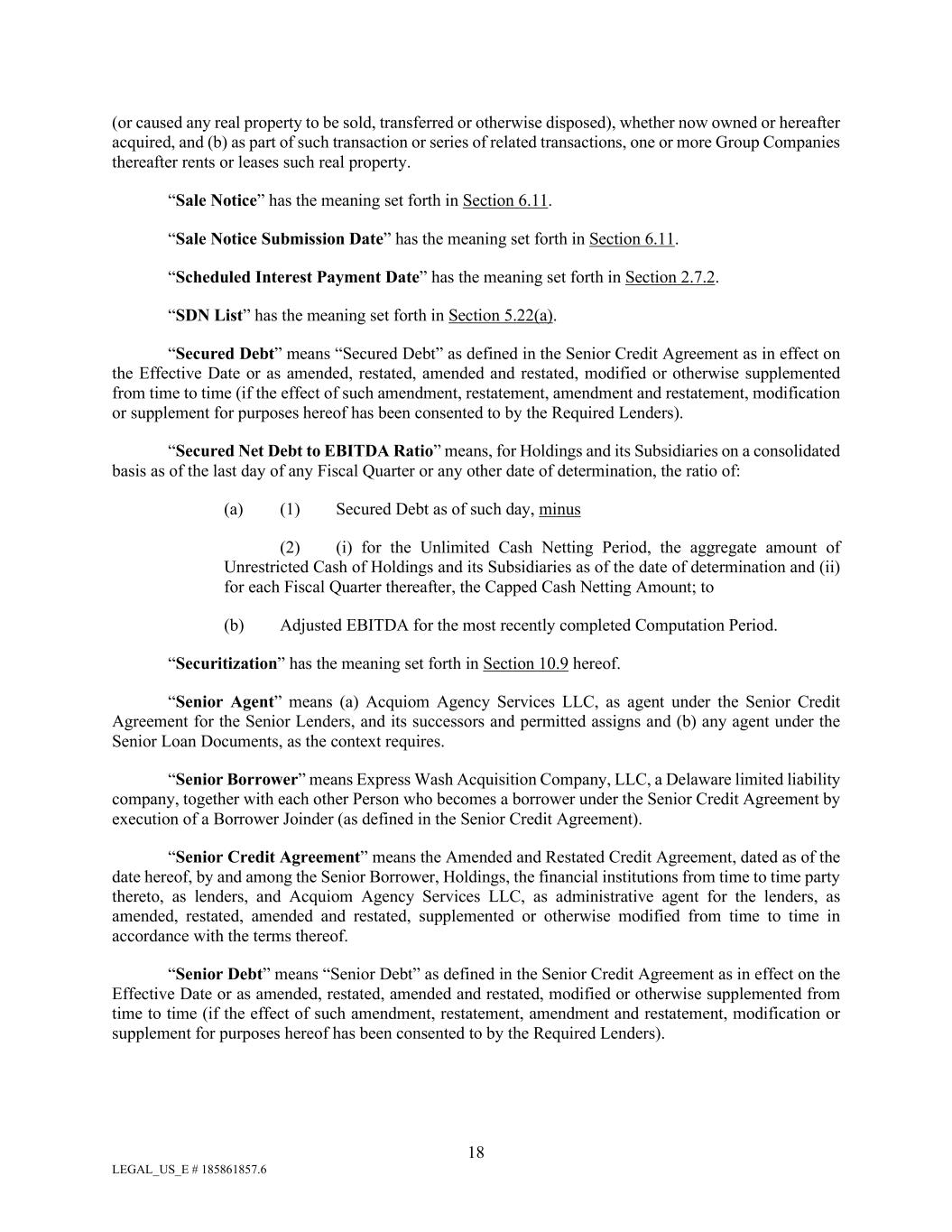 18 LEGAL_US_E # 185861857.6 (or caused any real property to be sold, transferred or otherwise disposed), whether now owned or hereafter acquired, and (b) as part of such transaction or series of related transactions, one or more Group Companies thereafter rents or leases such real property. “Sale Notice” has the meaning set forth in Section 6.11. “Sale Notice Submission Date” has the meaning set forth in Section 6.11. “Scheduled Interest Payment Date” has the meaning set forth in Section 2.7.2. “SDN List” has the meaning set forth in Section 5.22(a). “Secured Debt” means “Secured Debt” as defined in the Senior Credit Agreement as in effect on the Effective Date or as amended, restated, amended and restated, modified or otherwise supplemented from time to time (if the effect of such amendment, restatement, amendment and restatement, modification or supplement for purposes hereof has been consented to by the Required Lenders). “Secured Net Debt to EBITDA Ratio” means, for Holdings and its Subsidiaries on a consolidated basis as of the last day of any Fiscal Quarter or any other date of determination, the ratio of: (a) (1) Secured Debt as of such day, minus (2) (i) for the Unlimited Cash Netting Period, the aggregate amount of Unrestricted Cash of Holdings and its Subsidiaries as of the date of determination and (ii) for each Fiscal Quarter thereafter, the Capped Cash Netting Amount; to (b) Adjusted EBITDA for the most recently completed Computation Period. “Securitization” has the meaning set forth in Section 10.9 hereof. “Senior Agent” means (a) Acquiom Agency Services LLC, as agent under the Senior Credit Agreement for the Senior Lenders, and its successors and permitted assigns and (b) any agent under the Senior Loan Documents, as the context requires. “Senior Borrower” means Express Wash Acquisition Company, LLC, a Delaware limited liability company, together with each other Person who becomes a borrower under the Senior Credit Agreement by execution of a Borrower Joinder (as defined in the Senior Credit Agreement). “Senior Credit Agreement” means the Amended and Restated Credit Agreement, dated as of the date hereof, by and among the Senior Borrower, Holdings, the financial institutions from time to time party thereto, as lenders, and Acquiom Agency Services LLC, as administrative agent for the lenders, as amended, restated, amended and restated, supplemented or otherwise modified from time to time in accordance with the terms thereof. “Senior Debt” means “Senior Debt” as defined in the Senior Credit Agreement as in effect on the Effective Date or as amended, restated, amended and restated, modified or otherwise supplemented from time to time (if the effect of such amendment, restatement, amendment and restatement, modification or supplement for purposes hereof has been consented to by the Required Lenders).