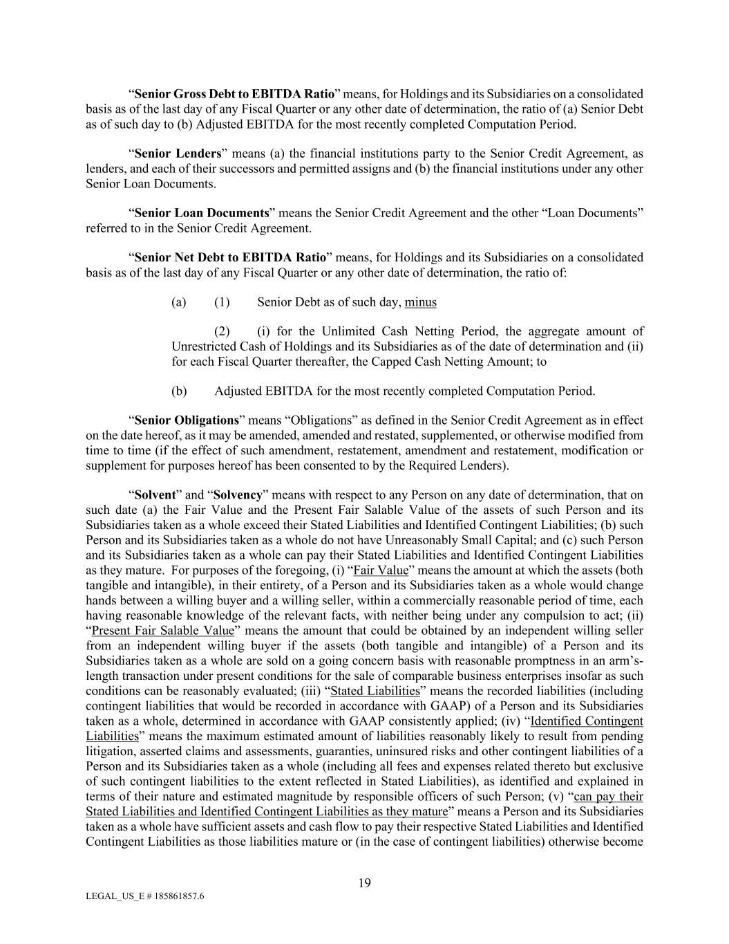 19 LEGAL_US_E # 185861857.6 “Senior Gross Debt to EBITDA Ratio” means, for Holdings and its Subsidiaries on a consolidated basis as of the last day of any Fiscal Quarter or any other date of determination, the ratio of (a) Senior Debt as of such day to (b) Adjusted EBITDA for the most recently completed Computation Period. “Senior Lenders” means (a) the financial institutions party to the Senior Credit Agreement, as lenders, and each of their successors and permitted assigns and (b) the financial institutions under any other Senior Loan Documents. “Senior Loan Documents” means the Senior Credit Agreement and the other “Loan Documents” referred to in the Senior Credit Agreement. “Senior Net Debt to EBITDA Ratio” means, for Holdings and its Subsidiaries on a consolidated basis as of the last day of any Fiscal Quarter or any other date of determination, the ratio of: (a) (1) Senior Debt as of such day, minus (2) (i) for the Unlimited Cash Netting Period, the aggregate amount of Unrestricted Cash of Holdings and its Subsidiaries as of the date of determination and (ii) for each Fiscal Quarter thereafter, the Capped Cash Netting Amount; to (b) Adjusted EBITDA for the most recently completed Computation Period. “Senior Obligations” means “Obligations” as defined in the Senior Credit Agreement as in effect on the date hereof, as it may be amended, amended and restated, supplemented, or otherwise modified from time to time (if the effect of such amendment, restatement, amendment and restatement, modification or supplement for purposes hereof has been consented to by the Required Lenders). “Solvent” and “Solvency” means with respect to any Person on any date of determination, that on such date (a) the Fair Value and the Present Fair Salable Value of the assets of such Person and its Subsidiaries taken as a whole exceed their Stated Liabilities and Identified Contingent Liabilities; (b) such Person and its Subsidiaries taken as a whole do not have Unreasonably Small Capital; and (c) such Person and its Subsidiaries taken as a whole can pay their Stated Liabilities and Identified Contingent Liabilities as they mature. For purposes of the foregoing, (i) “Fair Value” means the amount at which the assets (both tangible and intangible), in their entirety, of a Person and its Subsidiaries taken as a whole would change hands between a willing buyer and a willing seller, within a commercially reasonable period of time, each having reasonable knowledge of the relevant facts, with neither being under any compulsion to act; (ii) “Present Fair Salable Value” means the amount that could be obtained by an independent willing seller from an independent willing buyer if the assets (both tangible and intangible) of a Person and its Subsidiaries taken as a whole are sold on a going concern basis with reasonable promptness in an arm’s- length transaction under present conditions for the sale of comparable business enterprises insofar as such conditions can be reasonably evaluated; (iii) “Stated Liabilities” means the recorded liabilities (including contingent liabilities that would be recorded in accordance with GAAP) of a Person and its Subsidiaries taken as a whole, determined in accordance with GAAP consistently applied; (iv) “Identified Contingent Liabilities” means the maximum estimated amount of liabilities reasonably likely to result from pending litigation, asserted claims and assessments, guaranties, uninsured risks and other contingent liabilities of a Person and its Subsidiaries taken as a whole (including all fees and expenses related thereto but exclusive of such contingent liabilities to the extent reflected in Stated Liabilities), as identified and explained in terms of their nature and estimated magnitude by responsible officers of such Person; (v) “can pay their Stated Liabilities and Identified Contingent Liabilities as they mature” means a Person and its Subsidiaries taken as a whole have sufficient assets and cash flow to pay their respective Stated Liabilities and Identified Contingent Liabilities as those liabilities mature or (in the case of contingent liabilities) otherwise become