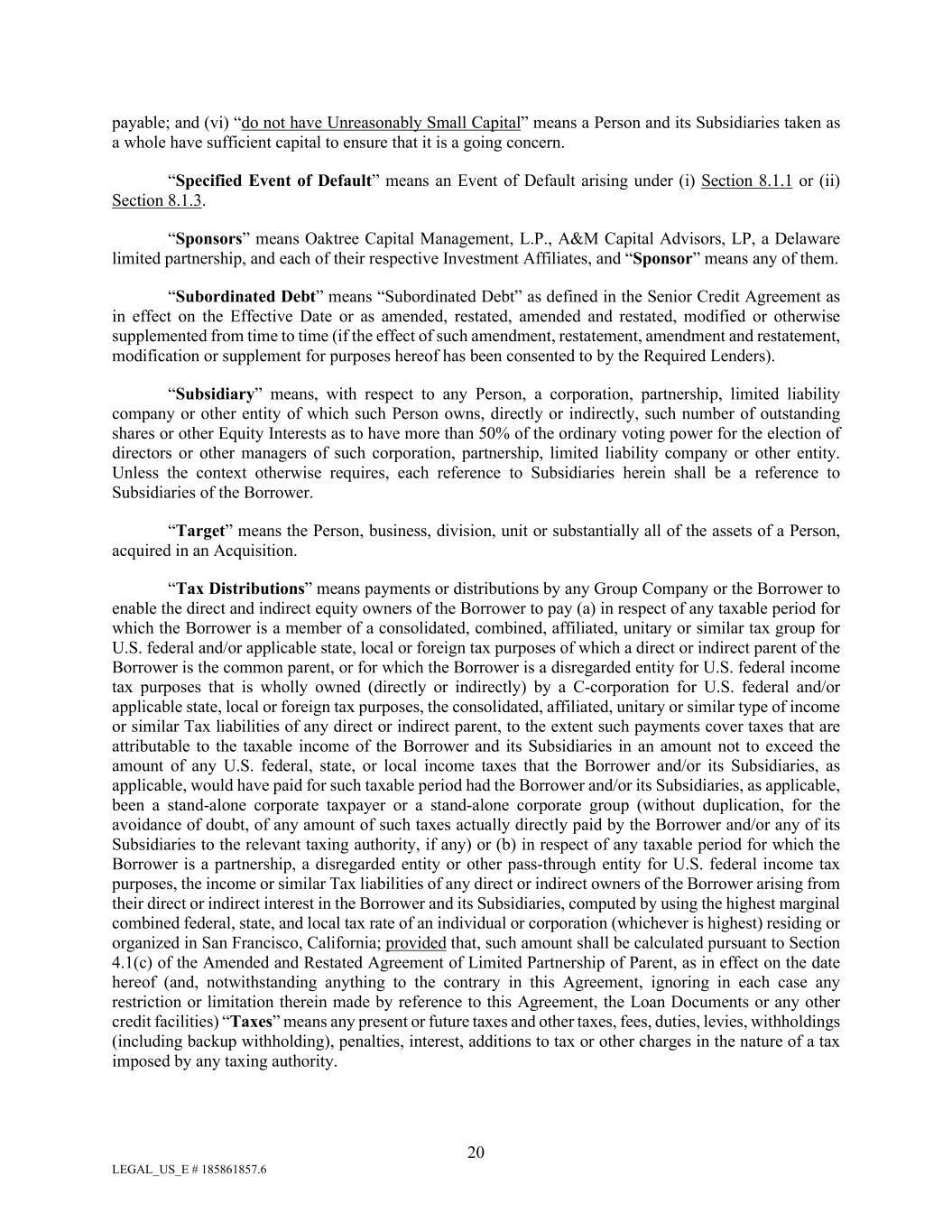 20 LEGAL_US_E # 185861857.6 payable; and (vi) “do not have Unreasonably Small Capital” means a Person and its Subsidiaries taken as a whole have sufficient capital to ensure that it is a going concern. “Specified Event of Default” means an Event of Default arising under (i) Section 8.1.1 or (ii) Section 8.1.3. “Sponsors” means Oaktree Capital Management, L.P., A&M Capital Advisors, LP, a Delaware limited partnership, and each of their respective Investment Affiliates, and “Sponsor” means any of them. “Subordinated Debt” means “Subordinated Debt” as defined in the Senior Credit Agreement as in effect on the Effective Date or as amended, restated, amended and restated, modified or otherwise supplemented from time to time (if the effect of such amendment, restatement, amendment and restatement, modification or supplement for purposes hereof has been consented to by the Required Lenders). “Subsidiary” means, with respect to any Person, a corporation, partnership, limited liability company or other entity of which such Person owns, directly or indirectly, such number of outstanding shares or other Equity Interests as to have more than 50% of the ordinary voting power for the election of directors or other managers of such corporation, partnership, limited liability company or other entity. Unless the context otherwise requires, each reference to Subsidiaries herein shall be a reference to Subsidiaries of the Borrower. “Target” means the Person, business, division, unit or substantially all of the assets of a Person, acquired in an Acquisition. “Tax Distributions” means payments or distributions by any Group Company or the Borrower to enable the direct and indirect equity owners of the Borrower to pay (a) in respect of any taxable period for which the Borrower is a member of a consolidated, combined, affiliated, unitary or similar tax group for U.S. federal and/or applicable state, local or foreign tax purposes of which a direct or indirect parent of the Borrower is the common parent, or for which the Borrower is a disregarded entity for U.S. federal income tax purposes that is wholly owned (directly or indirectly) by a C-corporation for U.S. federal and/or applicable state, local or foreign tax purposes, the consolidated, affiliated, unitary or similar type of income or similar Tax liabilities of any direct or indirect parent, to the extent such payments cover taxes that are attributable to the taxable income of the Borrower and its Subsidiaries in an amount not to exceed the amount of any U.S. federal, state, or local income taxes that the Borrower and/or its Subsidiaries, as applicable, would have paid for such taxable period had the Borrower and/or its Subsidiaries, as applicable, been a stand-alone corporate taxpayer or a stand-alone corporate group (without duplication, for the avoidance of doubt, of any amount of such taxes actually directly paid by the Borrower and/or any of its Subsidiaries to the relevant taxing authority, if any) or (b) in respect of any taxable period for which the Borrower is a partnership, a disregarded entity or other pass-through entity for U.S. federal income tax purposes, the income or similar Tax liabilities of any direct or indirect owners of the Borrower arising from their direct or indirect interest in the Borrower and its Subsidiaries, computed by using the highest marginal combined federal, state, and local tax rate of an individual or corporation (whichever is highest) residing or organized in San Francisco, California; provided that, such amount shall be calculated pursuant to Section 4.1(c) of the Amended and Restated Agreement of Limited Partnership of Parent, as in effect on the date hereof (and, notwithstanding anything to the contrary in this Agreement, ignoring in each case any restriction or limitation therein made by reference to this Agreement, the Loan Documents or any other credit facilities) “Taxes” means any present or future taxes and other taxes, fees, duties, levies, withholdings (including backup withholding), penalties, interest, additions to tax or other charges in the nature of a tax imposed by any taxing authority.
