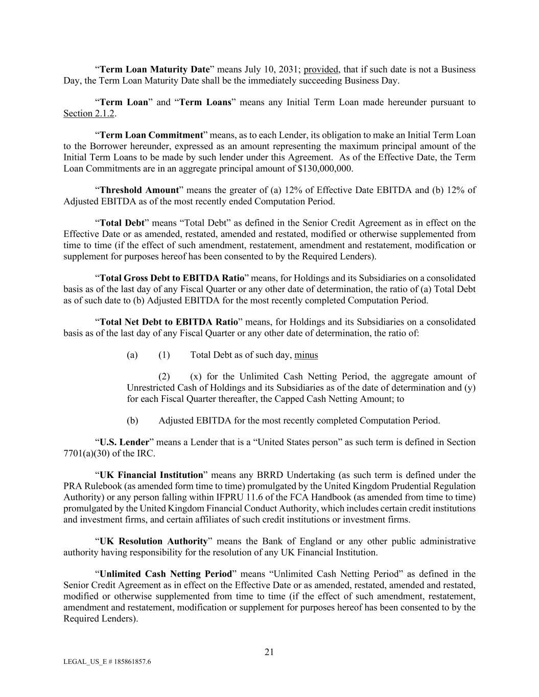21 LEGAL_US_E # 185861857.6 “Term Loan Maturity Date” means July 10, 2031; provided, that if such date is not a Business Day, the Term Loan Maturity Date shall be the immediately succeeding Business Day. “Term Loan” and “Term Loans” means any Initial Term Loan made hereunder pursuant to Section 2.1.2. “Term Loan Commitment” means, as to each Lender, its obligation to make an Initial Term Loan to the Borrower hereunder, expressed as an amount representing the maximum principal amount of the Initial Term Loans to be made by such lender under this Agreement. As of the Effective Date, the Term Loan Commitments are in an aggregate principal amount of $130,000,000. “Threshold Amount” means the greater of (a) 12% of Effective Date EBITDA and (b) 12% of Adjusted EBITDA as of the most recently ended Computation Period. “Total Debt” means “Total Debt” as defined in the Senior Credit Agreement as in effect on the Effective Date or as amended, restated, amended and restated, modified or otherwise supplemented from time to time (if the effect of such amendment, restatement, amendment and restatement, modification or supplement for purposes hereof has been consented to by the Required Lenders). “Total Gross Debt to EBITDA Ratio” means, for Holdings and its Subsidiaries on a consolidated basis as of the last day of any Fiscal Quarter or any other date of determination, the ratio of (a) Total Debt as of such date to (b) Adjusted EBITDA for the most recently completed Computation Period. “Total Net Debt to EBITDA Ratio” means, for Holdings and its Subsidiaries on a consolidated basis as of the last day of any Fiscal Quarter or any other date of determination, the ratio of: (a) (1) Total Debt as of such day, minus (2) (x) for the Unlimited Cash Netting Period, the aggregate amount of Unrestricted Cash of Holdings and its Subsidiaries as of the date of determination and (y) for each Fiscal Quarter thereafter, the Capped Cash Netting Amount; to (b) Adjusted EBITDA for the most recently completed Computation Period. “U.S. Lender” means a Lender that is a “United States person” as such term is defined in Section 7701(a)(30) of the IRC. “UK Financial Institution” means any BRRD Undertaking (as such term is defined under the PRA Rulebook (as amended form time to time) promulgated by the United Kingdom Prudential Regulation Authority) or any person falling within IFPRU 11.6 of the FCA Handbook (as amended from time to time) promulgated by the United Kingdom Financial Conduct Authority, which includes certain credit institutions and investment firms, and certain affiliates of such credit institutions or investment firms. “UK Resolution Authority” means the Bank of England or any other public administrative authority having responsibility for the resolution of any UK Financial Institution. “Unlimited Cash Netting Period” means “Unlimited Cash Netting Period” as defined in the Senior Credit Agreement as in effect on the Effective Date or as amended, restated, amended and restated, modified or otherwise supplemented from time to time (if the effect of such amendment, restatement, amendment and restatement, modification or supplement for purposes hereof has been consented to by the Required Lenders).