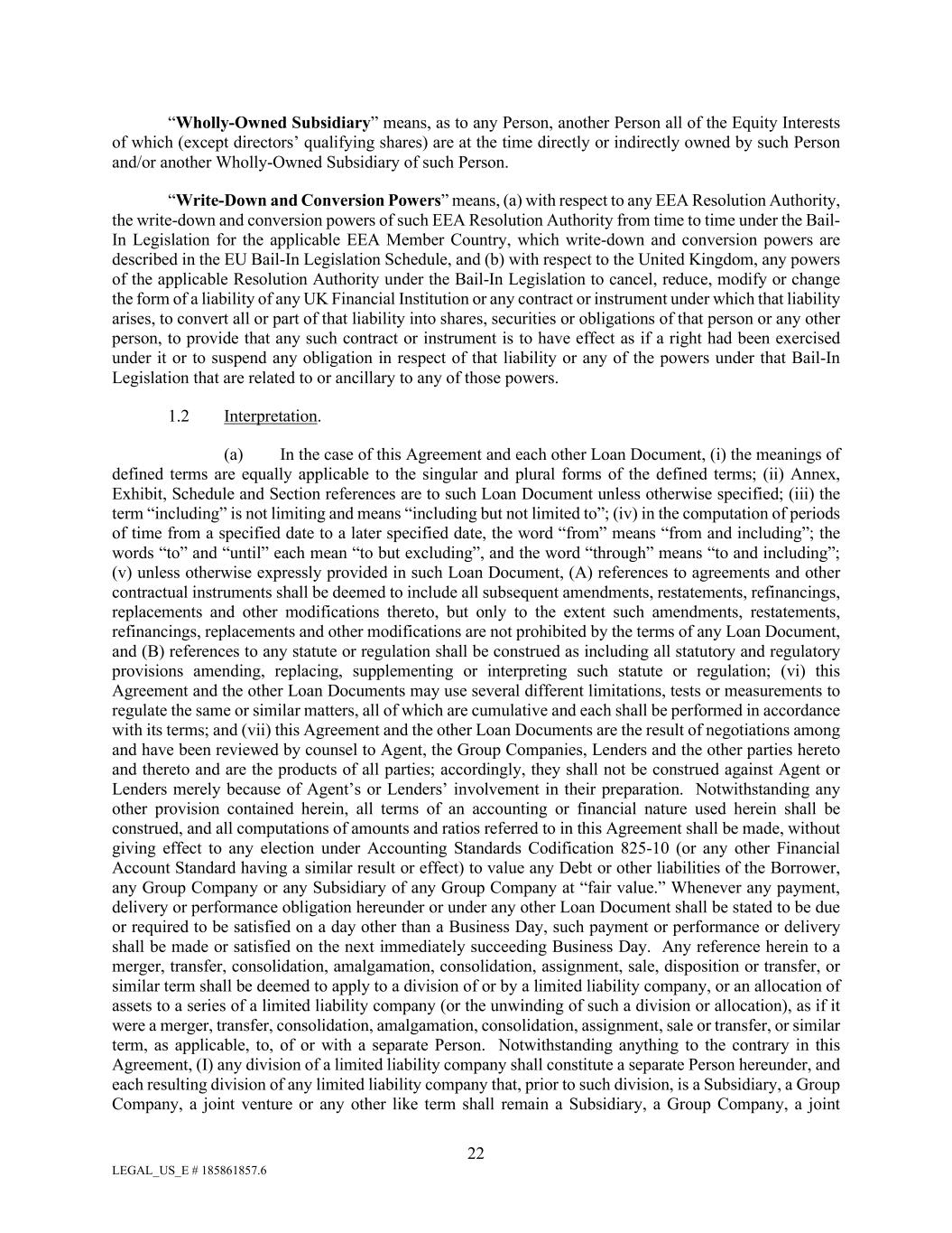 22 LEGAL_US_E # 185861857.6 “Wholly-Owned Subsidiary” means, as to any Person, another Person all of the Equity Interests of which (except directors’ qualifying shares) are at the time directly or indirectly owned by such Person and/or another Wholly-Owned Subsidiary of such Person. “Write-Down and Conversion Powers” means, (a) with respect to any EEA Resolution Authority, the write-down and conversion powers of such EEA Resolution Authority from time to time under the Bail- In Legislation for the applicable EEA Member Country, which write-down and conversion powers are described in the EU Bail-In Legislation Schedule, and (b) with respect to the United Kingdom, any powers of the applicable Resolution Authority under the Bail-In Legislation to cancel, reduce, modify or change the form of a liability of any UK Financial Institution or any contract or instrument under which that liability arises, to convert all or part of that liability into shares, securities or obligations of that person or any other person, to provide that any such contract or instrument is to have effect as if a right had been exercised under it or to suspend any obligation in respect of that liability or any of the powers under that Bail-In Legislation that are related to or ancillary to any of those powers. 1.2 Interpretation. (a) In the case of this Agreement and each other Loan Document, (i) the meanings of defined terms are equally applicable to the singular and plural forms of the defined terms; (ii) Annex, Exhibit, Schedule and Section references are to such Loan Document unless otherwise specified; (iii) the term “including” is not limiting and means “including but not limited to”; (iv) in the computation of periods of time from a specified date to a later specified date, the word “from” means “from and including”; the words “to” and “until” each mean “to but excluding”, and the word “through” means “to and including”; (v) unless otherwise expressly provided in such Loan Document, (A) references to agreements and other contractual instruments shall be deemed to include all subsequent amendments, restatements, refinancings, replacements and other modifications thereto, but only to the extent such amendments, restatements, refinancings, replacements and other modifications are not prohibited by the terms of any Loan Document, and (B) references to any statute or regulation shall be construed as including all statutory and regulatory provisions amending, replacing, supplementing or interpreting such statute or regulation; (vi) this Agreement and the other Loan Documents may use several different limitations, tests or measurements to regulate the same or similar matters, all of which are cumulative and each shall be performed in accordance with its terms; and (vii) this Agreement and the other Loan Documents are the result of negotiations among and have been reviewed by counsel to Agent, the Group Companies, Lenders and the other parties hereto and thereto and are the products of all parties; accordingly, they shall not be construed against Agent or Lenders merely because of Agent’s or Lenders’ involvement in their preparation. Notwithstanding any other provision contained herein, all terms of an accounting or financial nature used herein shall be construed, and all computations of amounts and ratios referred to in this Agreement shall be made, without giving effect to any election under Accounting Standards Codification 825-10 (or any other Financial Account Standard having a similar result or effect) to value any Debt or other liabilities of the Borrower, any Group Company or any Subsidiary of any Group Company at “fair value.” Whenever any payment, delivery or performance obligation hereunder or under any other Loan Document shall be stated to be due or required to be satisfied on a day other than a Business Day, such payment or performance or delivery shall be made or satisfied on the next immediately succeeding Business Day. Any reference herein to a merger, transfer, consolidation, amalgamation, consolidation, assignment, sale, disposition or transfer, or similar term shall be deemed to apply to a division of or by a limited liability company, or an allocation of assets to a series of a limited liability company (or the unwinding of such a division or allocation), as if it were a merger, transfer, consolidation, amalgamation, consolidation, assignment, sale or transfer, or similar term, as applicable, to, of or with a separate Person. Notwithstanding anything to the contrary in this Agreement, (I) any division of a limited liability company shall constitute a separate Person hereunder, and each resulting division of any limited liability company that, prior to such division, is a Subsidiary, a Group Company, a joint venture or any other like term shall remain a Subsidiary, a Group Company, a joint