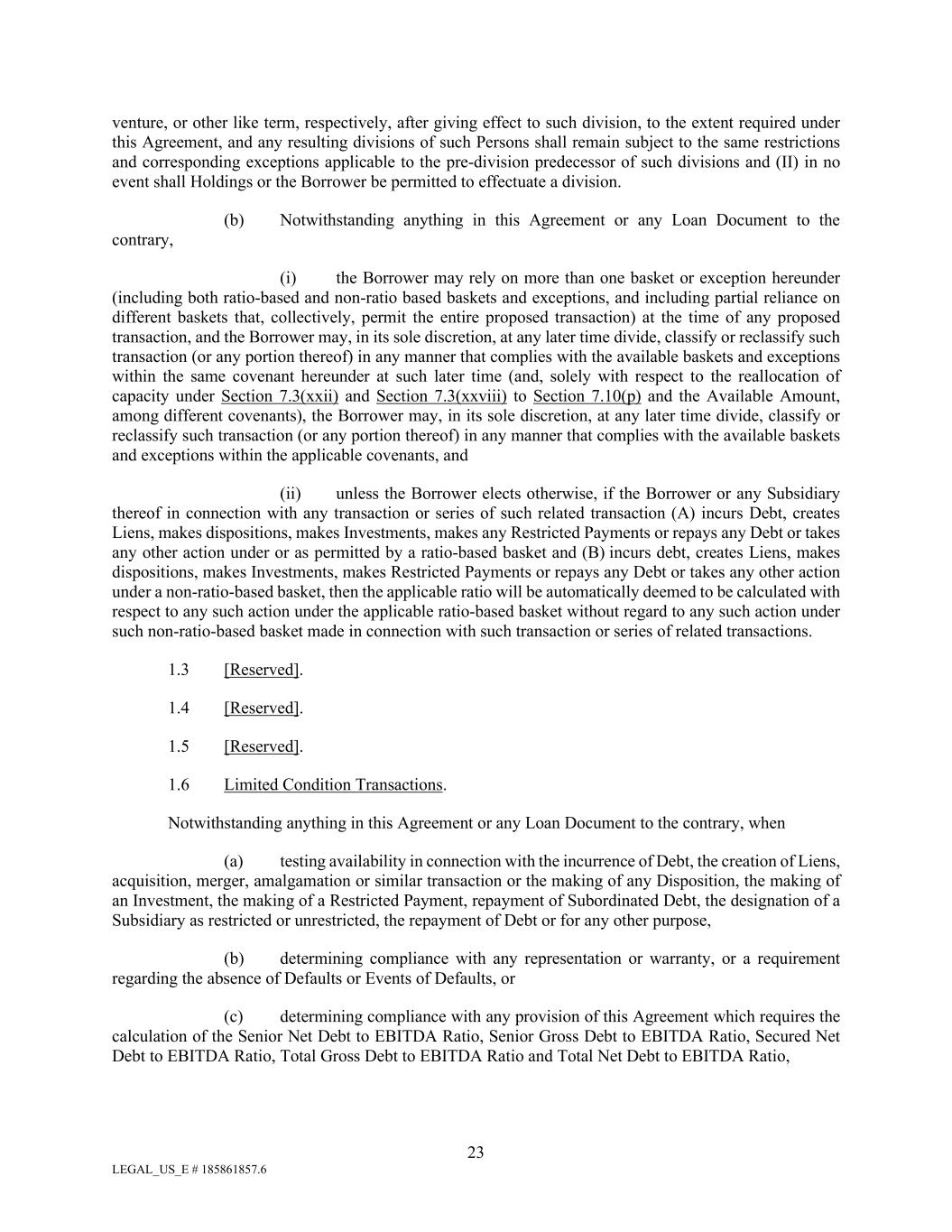 23 LEGAL_US_E # 185861857.6 venture, or other like term, respectively, after giving effect to such division, to the extent required under this Agreement, and any resulting divisions of such Persons shall remain subject to the same restrictions and corresponding exceptions applicable to the pre-division predecessor of such divisions and (II) in no event shall Holdings or the Borrower be permitted to effectuate a division. (b) Notwithstanding anything in this Agreement or any Loan Document to the contrary, (i) the Borrower may rely on more than one basket or exception hereunder (including both ratio-based and non-ratio based baskets and exceptions, and including partial reliance on different baskets that, collectively, permit the entire proposed transaction) at the time of any proposed transaction, and the Borrower may, in its sole discretion, at any later time divide, classify or reclassify such transaction (or any portion thereof) in any manner that complies with the available baskets and exceptions within the same covenant hereunder at such later time (and, solely with respect to the reallocation of capacity under Section 7.3(xxii) and Section 7.3(xxviii) to Section 7.10(p) and the Available Amount, among different covenants), the Borrower may, in its sole discretion, at any later time divide, classify or reclassify such transaction (or any portion thereof) in any manner that complies with the available baskets and exceptions within the applicable covenants, and (ii) unless the Borrower elects otherwise, if the Borrower or any Subsidiary thereof in connection with any transaction or series of such related transaction (A) incurs Debt, creates Liens, makes dispositions, makes Investments, makes any Restricted Payments or repays any Debt or takes any other action under or as permitted by a ratio-based basket and (B) incurs debt, creates Liens, makes dispositions, makes Investments, makes Restricted Payments or repays any Debt or takes any other action under a non-ratio-based basket, then the applicable ratio will be automatically deemed to be calculated with respect to any such action under the applicable ratio-based basket without regard to any such action under such non-ratio-based basket made in connection with such transaction or series of related transactions. 1.3 [Reserved]. 1.4 [Reserved]. 1.5 [Reserved]. 1.6 Limited Condition Transactions. Notwithstanding anything in this Agreement or any Loan Document to the contrary, when (a) testing availability in connection with the incurrence of Debt, the creation of Liens, acquisition, merger, amalgamation or similar transaction or the making of any Disposition, the making of an Investment, the making of a Restricted Payment, repayment of Subordinated Debt, the designation of a Subsidiary as restricted or unrestricted, the repayment of Debt or for any other purpose, (b) determining compliance with any representation or warranty, or a requirement regarding the absence of Defaults or Events of Defaults, or (c) determining compliance with any provision of this Agreement which requires the calculation of the Senior Net Debt to EBITDA Ratio, Senior Gross Debt to EBITDA Ratio, Secured Net Debt to EBITDA Ratio, Total Gross Debt to EBITDA Ratio and Total Net Debt to EBITDA Ratio,