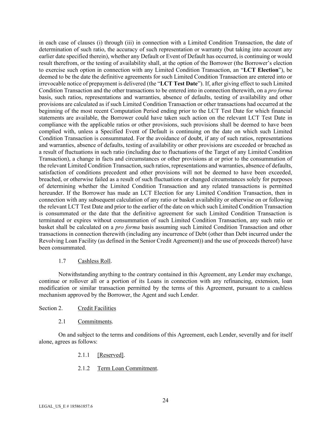 24 LEGAL_US_E # 185861857.6 in each case of clauses (i) through (iii) in connection with a Limited Condition Transaction, the date of determination of such ratio, the accuracy of such representation or warranty (but taking into account any earlier date specified therein), whether any Default or Event of Default has occurred, is continuing or would result therefrom, or the testing of availability shall, at the option of the Borrower (the Borrower’s election to exercise such option in connection with any Limited Condition Transaction, an “LCT Election”), be deemed to be the date the definitive agreements for such Limited Condition Transaction are entered into or irrevocable notice of prepayment is delivered (the “LCT Test Date”). If, after giving effect to such Limited Condition Transaction and the other transactions to be entered into in connection therewith, on a pro forma basis, such ratios, representations and warranties, absence of defaults, testing of availability and other provisions are calculated as if such Limited Condition Transaction or other transactions had occurred at the beginning of the most recent Computation Period ending prior to the LCT Test Date for which financial statements are available, the Borrower could have taken such action on the relevant LCT Test Date in compliance with the applicable ratios or other provisions, such provisions shall be deemed to have been complied with, unless a Specified Event of Default is continuing on the date on which such Limited Condition Transaction is consummated. For the avoidance of doubt, if any of such ratios, representations and warranties, absence of defaults, testing of availability or other provisions are exceeded or breached as a result of fluctuations in such ratio (including due to fluctuations of the Target of any Limited Condition Transaction), a change in facts and circumstances or other provisions at or prior to the consummation of the relevant Limited Condition Transaction, such ratios, representations and warranties, absence of defaults, satisfaction of conditions precedent and other provisions will not be deemed to have been exceeded, breached, or otherwise failed as a result of such fluctuations or changed circumstances solely for purposes of determining whether the Limited Condition Transaction and any related transactions is permitted hereunder. If the Borrower has made an LCT Election for any Limited Condition Transaction, then in connection with any subsequent calculation of any ratio or basket availability or otherwise on or following the relevant LCT Test Date and prior to the earlier of the date on which such Limited Condition Transaction is consummated or the date that the definitive agreement for such Limited Condition Transaction is terminated or expires without consummation of such Limited Condition Transaction, any such ratio or basket shall be calculated on a pro forma basis assuming such Limited Condition Transaction and other transactions in connection therewith (including any incurrence of Debt (other than Debt incurred under the Revolving Loan Facility (as defined in the Senior Credit Agreement)) and the use of proceeds thereof) have been consummated. 1.7 Cashless Roll. Notwithstanding anything to the contrary contained in this Agreement, any Lender may exchange, continue or rollover all or a portion of its Loans in connection with any refinancing, extension, loan modification or similar transaction permitted by the terms of this Agreement, pursuant to a cashless mechanism approved by the Borrower, the Agent and such Lender. Section 2. Credit Facilities 2.1 Commitments. On and subject to the terms and conditions of this Agreement, each Lender, severally and for itself alone, agrees as follows: 2.1.1 [Reserved]. 2.1.2 Term Loan Commitment.