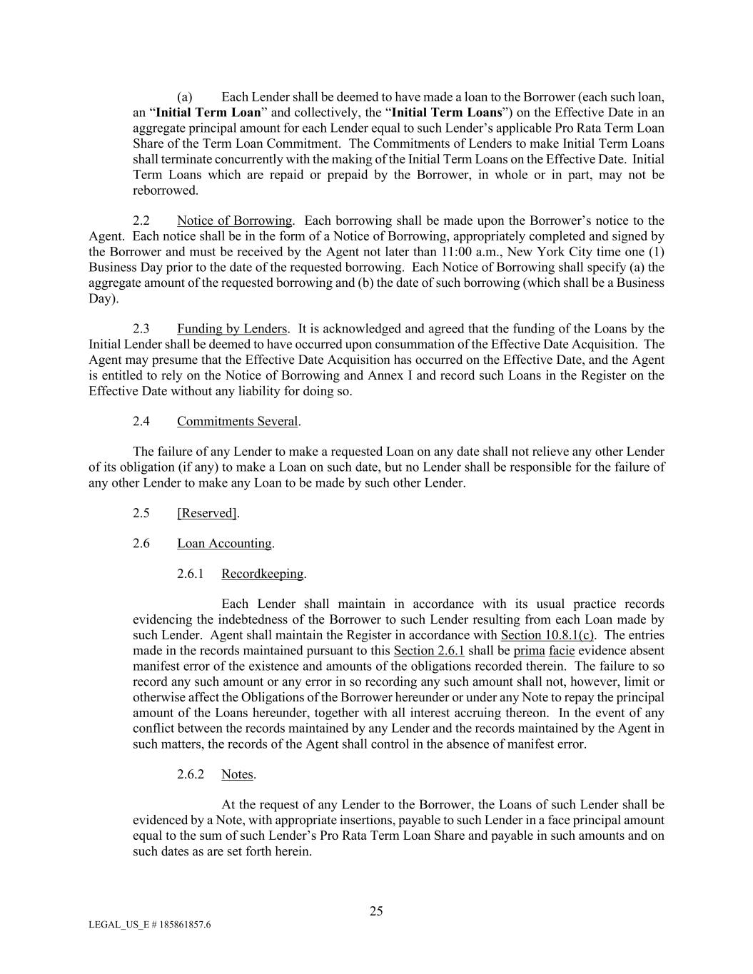 25 LEGAL_US_E # 185861857.6 (a) Each Lender shall be deemed to have made a loan to the Borrower (each such loan, an “Initial Term Loan” and collectively, the “Initial Term Loans”) on the Effective Date in an aggregate principal amount for each Lender equal to such Lender’s applicable Pro Rata Term Loan Share of the Term Loan Commitment. The Commitments of Lenders to make Initial Term Loans shall terminate concurrently with the making of the Initial Term Loans on the Effective Date. Initial Term Loans which are repaid or prepaid by the Borrower, in whole or in part, may not be reborrowed. 2.2 Notice of Borrowing. Each borrowing shall be made upon the Borrower’s notice to the Agent. Each notice shall be in the form of a Notice of Borrowing, appropriately completed and signed by the Borrower and must be received by the Agent not later than 11:00 a.m., New York City time one (1) Business Day prior to the date of the requested borrowing. Each Notice of Borrowing shall specify (a) the aggregate amount of the requested borrowing and (b) the date of such borrowing (which shall be a Business Day). 2.3 Funding by Lenders. It is acknowledged and agreed that the funding of the Loans by the Initial Lender shall be deemed to have occurred upon consummation of the Effective Date Acquisition. The Agent may presume that the Effective Date Acquisition has occurred on the Effective Date, and the Agent is entitled to rely on the Notice of Borrowing and Annex I and record such Loans in the Register on the Effective Date without any liability for doing so. 2.4 Commitments Several. The failure of any Lender to make a requested Loan on any date shall not relieve any other Lender of its obligation (if any) to make a Loan on such date, but no Lender shall be responsible for the failure of any other Lender to make any Loan to be made by such other Lender. 2.5 [Reserved]. 2.6 Loan Accounting. 2.6.1 Recordkeeping. Each Lender shall maintain in accordance with its usual practice records evidencing the indebtedness of the Borrower to such Lender resulting from each Loan made by such Lender. Agent shall maintain the Register in accordance with Section 10.8.1(c). The entries made in the records maintained pursuant to this Section 2.6.1 shall be prima facie evidence absent manifest error of the existence and amounts of the obligations recorded therein. The failure to so record any such amount or any error in so recording any such amount shall not, however, limit or otherwise affect the Obligations of the Borrower hereunder or under any Note to repay the principal amount of the Loans hereunder, together with all interest accruing thereon. In the event of any conflict between the records maintained by any Lender and the records maintained by the Agent in such matters, the records of the Agent shall control in the absence of manifest error. 2.6.2 Notes. At the request of any Lender to the Borrower, the Loans of such Lender shall be evidenced by a Note, with appropriate insertions, payable to such Lender in a face principal amount equal to the sum of such Lender’s Pro Rata Term Loan Share and payable in such amounts and on such dates as are set forth herein.