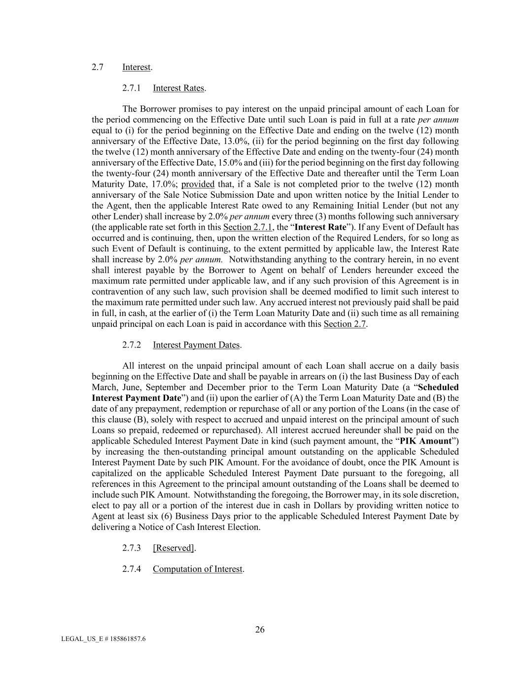 26 LEGAL_US_E # 185861857.6 2.7 Interest. 2.7.1 Interest Rates. The Borrower promises to pay interest on the unpaid principal amount of each Loan for the period commencing on the Effective Date until such Loan is paid in full at a rate per annum equal to (i) for the period beginning on the Effective Date and ending on the twelve (12) month anniversary of the Effective Date, 13.0%, (ii) for the period beginning on the first day following the twelve (12) month anniversary of the Effective Date and ending on the twenty-four (24) month anniversary of the Effective Date, 15.0% and (iii) for the period beginning on the first day following the twenty-four (24) month anniversary of the Effective Date and thereafter until the Term Loan Maturity Date, 17.0%; provided that, if a Sale is not completed prior to the twelve (12) month anniversary of the Sale Notice Submission Date and upon written notice by the Initial Lender to the Agent, then the applicable Interest Rate owed to any Remaining Initial Lender (but not any other Lender) shall increase by 2.0% per annum every three (3) months following such anniversary (the applicable rate set forth in this Section 2.7.1, the “Interest Rate”). If any Event of Default has occurred and is continuing, then, upon the written election of the Required Lenders, for so long as such Event of Default is continuing, to the extent permitted by applicable law, the Interest Rate shall increase by 2.0% per annum. Notwithstanding anything to the contrary herein, in no event shall interest payable by the Borrower to Agent on behalf of Lenders hereunder exceed the maximum rate permitted under applicable law, and if any such provision of this Agreement is in contravention of any such law, such provision shall be deemed modified to limit such interest to the maximum rate permitted under such law. Any accrued interest not previously paid shall be paid in full, in cash, at the earlier of (i) the Term Loan Maturity Date and (ii) such time as all remaining unpaid principal on each Loan is paid in accordance with this Section 2.7. 2.7.2 Interest Payment Dates. All interest on the unpaid principal amount of each Loan shall accrue on a daily basis beginning on the Effective Date and shall be payable in arrears on (i) the last Business Day of each March, June, September and December prior to the Term Loan Maturity Date (a “Scheduled Interest Payment Date”) and (ii) upon the earlier of (A) the Term Loan Maturity Date and (B) the date of any prepayment, redemption or repurchase of all or any portion of the Loans (in the case of this clause (B), solely with respect to accrued and unpaid interest on the principal amount of such Loans so prepaid, redeemed or repurchased). All interest accrued hereunder shall be paid on the applicable Scheduled Interest Payment Date in kind (such payment amount, the “PIK Amount”) by increasing the then-outstanding principal amount outstanding on the applicable Scheduled Interest Payment Date by such PIK Amount. For the avoidance of doubt, once the PIK Amount is capitalized on the applicable Scheduled Interest Payment Date pursuant to the foregoing, all references in this Agreement to the principal amount outstanding of the Loans shall be deemed to include such PIK Amount. Notwithstanding the foregoing, the Borrower may, in its sole discretion, elect to pay all or a portion of the interest due in cash in Dollars by providing written notice to Agent at least six (6) Business Days prior to the applicable Scheduled Interest Payment Date by delivering a Notice of Cash Interest Election. 2.7.3 [Reserved]. 2.7.4 Computation of Interest.