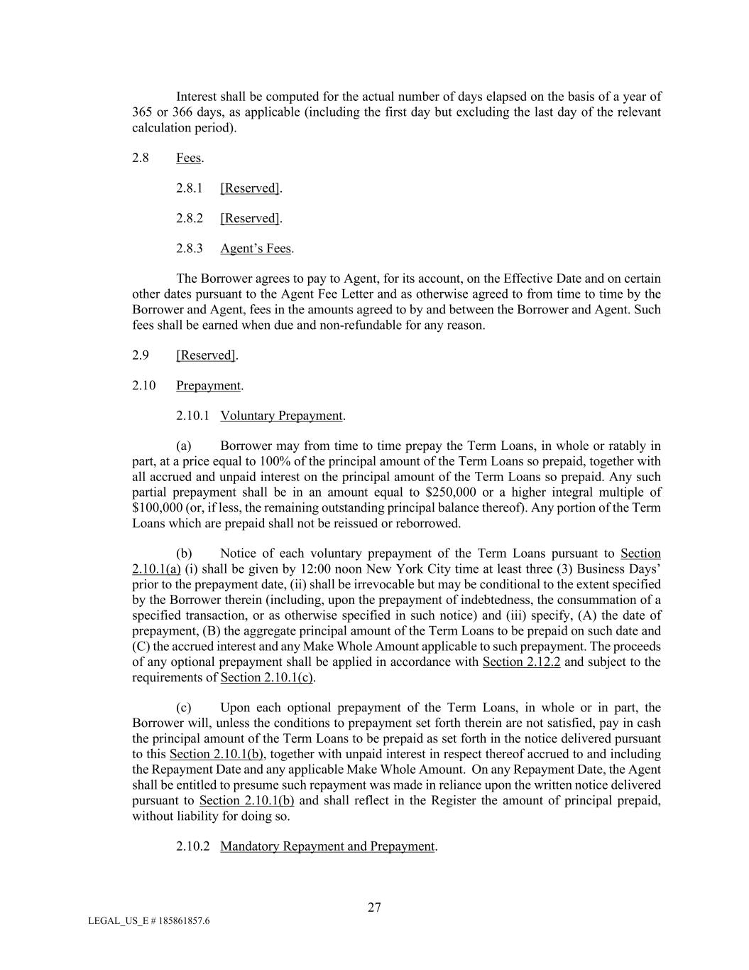 27 LEGAL_US_E # 185861857.6 Interest shall be computed for the actual number of days elapsed on the basis of a year of 365 or 366 days, as applicable (including the first day but excluding the last day of the relevant calculation period). 2.8 Fees. 2.8.1 [Reserved]. 2.8.2 [Reserved]. 2.8.3 Agent’s Fees. The Borrower agrees to pay to Agent, for its account, on the Effective Date and on certain other dates pursuant to the Agent Fee Letter and as otherwise agreed to from time to time by the Borrower and Agent, fees in the amounts agreed to by and between the Borrower and Agent. Such fees shall be earned when due and non-refundable for any reason. 2.9 [Reserved]. 2.10 Prepayment. 2.10.1 Voluntary Prepayment. (a) Borrower may from time to time prepay the Term Loans, in whole or ratably in part, at a price equal to 100% of the principal amount of the Term Loans so prepaid, together with all accrued and unpaid interest on the principal amount of the Term Loans so prepaid. Any such partial prepayment shall be in an amount equal to $250,000 or a higher integral multiple of $100,000 (or, if less, the remaining outstanding principal balance thereof). Any portion of the Term Loans which are prepaid shall not be reissued or reborrowed. (b) Notice of each voluntary prepayment of the Term Loans pursuant to Section 2.10.1(a) (i) shall be given by 12:00 noon New York City time at least three (3) Business Days’ prior to the prepayment date, (ii) shall be irrevocable but may be conditional to the extent specified by the Borrower therein (including, upon the prepayment of indebtedness, the consummation of a specified transaction, or as otherwise specified in such notice) and (iii) specify, (A) the date of prepayment, (B) the aggregate principal amount of the Term Loans to be prepaid on such date and (C) the accrued interest and any Make Whole Amount applicable to such prepayment. The proceeds of any optional prepayment shall be applied in accordance with Section 2.12.2 and subject to the requirements of Section 2.10.1(c). (c) Upon each optional prepayment of the Term Loans, in whole or in part, the Borrower will, unless the conditions to prepayment set forth therein are not satisfied, pay in cash the principal amount of the Term Loans to be prepaid as set forth in the notice delivered pursuant to this Section 2.10.1(b), together with unpaid interest in respect thereof accrued to and including the Repayment Date and any applicable Make Whole Amount. On any Repayment Date, the Agent shall be entitled to presume such repayment was made in reliance upon the written notice delivered pursuant to Section 2.10.1(b) and shall reflect in the Register the amount of principal prepaid, without liability for doing so. 2.10.2 Mandatory Repayment and Prepayment.