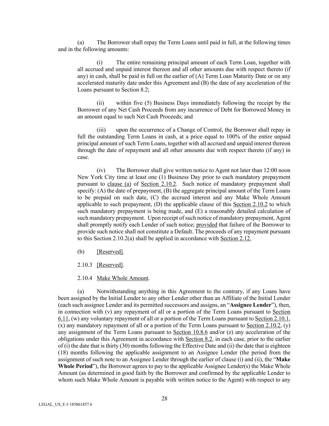 28 LEGAL_US_E # 185861857.6 (a) The Borrower shall repay the Term Loans until paid in full, at the following times and in the following amounts: (i) The entire remaining principal amount of each Term Loan, together with all accrued and unpaid interest thereon and all other amounts due with respect thereto (if any) in cash, shall be paid in full on the earlier of (A) Term Loan Maturity Date or on any accelerated maturity date under this Agreement and (B) the date of any acceleration of the Loans pursuant to Section 8.2; (ii) within five (5) Business Days immediately following the receipt by the Borrower of any Net Cash Proceeds from any incurrence of Debt for Borrowed Money in an amount equal to such Net Cash Proceeds; and (iii) upon the occurrence of a Change of Control, the Borrower shall repay in full the outstanding Term Loans in cash, at a price equal to 100% of the entire unpaid principal amount of such Term Loans, together with all accrued and unpaid interest thereon through the date of repayment and all other amounts due with respect thereto (if any) in case. (iv) The Borrower shall give written notice to Agent not later than 12:00 noon New York City time at least one (1) Business Day prior to each mandatory prepayment pursuant to clause (a) of Section 2.10.2. Such notice of mandatory prepayment shall specify: (A) the date of prepayment, (B) the aggregate principal amount of the Term Loans to be prepaid on such date, (C) the accrued interest and any Make Whole Amount applicable to such prepayment, (D) the applicable clause of this Section 2.10.2 to which such mandatory prepayment is being made, and (E) a reasonably detailed calculation of such mandatory prepayment. Upon receipt of such notice of mandatory prepayment, Agent shall promptly notify each Lender of such notice; provided that failure of the Borrower to provide such notice shall not constitute a Default. The proceeds of any repayment pursuant to this Section 2.10.2(a) shall be applied in accordance with Section 2.12. (b) [Reserved]. 2.10.3 [Reserved]. 2.10.4 Make Whole Amount. (a) Notwithstanding anything in this Agreement to the contrary, if any Loans have been assigned by the Initial Lender to any other Lender other than an Affiliate of the Initial Lender (each such assignee Lender and its permitted successors and assigns, an “Assignee Lender”), then, in connection with (v) any repayment of all or a portion of the Term Loans pursuant to Section 6.11, (w) any voluntary repayment of all or a portion of the Term Loans pursuant to Section 2.10.1, (x) any mandatory repayment of all or a portion of the Term Loans pursuant to Section 2.10.2, (y) any assignment of the Term Loans pursuant to Section 10.8.6 and/or (z) any acceleration of the obligations under this Agreement in accordance with Section 8.2, in each case, prior to the earlier of (i) the date that is thirty (30) months following the Effective Date and (ii) the date that is eighteen (18) months following the applicable assignment to an Assignee Lender (the period from the assignment of such note to an Assignee Lender through the earlier of clause (i) and (ii), the “Make Whole Period”), the Borrower agrees to pay to the applicable Assignee Lender(s) the Make Whole Amount (as determined in good faith by the Borrower and confirmed by the applicable Lender to whom such Make Whole Amount is payable with written notice to the Agent) with respect to any