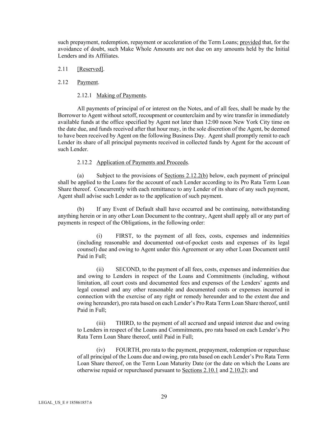 29 LEGAL_US_E # 185861857.6 such prepayment, redemption, repayment or acceleration of the Term Loans; provided that, for the avoidance of doubt, such Make Whole Amounts are not due on any amounts held by the Initial Lenders and its Affiliates. 2.11 [Reserved]. 2.12 Payment. 2.12.1 Making of Payments. All payments of principal of or interest on the Notes, and of all fees, shall be made by the Borrower to Agent without setoff, recoupment or counterclaim and by wire transfer in immediately available funds at the office specified by Agent not later than 12:00 noon New York City time on the date due, and funds received after that hour may, in the sole discretion of the Agent, be deemed to have been received by Agent on the following Business Day. Agent shall promptly remit to each Lender its share of all principal payments received in collected funds by Agent for the account of such Lender. 2.12.2 Application of Payments and Proceeds. (a) Subject to the provisions of Sections 2.12.2(b) below, each payment of principal shall be applied to the Loans for the account of each Lender according to its Pro Rata Term Loan Share thereof. Concurrently with each remittance to any Lender of its share of any such payment, Agent shall advise such Lender as to the application of such payment. (b) If any Event of Default shall have occurred and be continuing, notwithstanding anything herein or in any other Loan Document to the contrary, Agent shall apply all or any part of payments in respect of the Obligations, in the following order: (i) FIRST, to the payment of all fees, costs, expenses and indemnities (including reasonable and documented out-of-pocket costs and expenses of its legal counsel) due and owing to Agent under this Agreement or any other Loan Document until Paid in Full; (ii) SECOND, to the payment of all fees, costs, expenses and indemnities due and owing to Lenders in respect of the Loans and Commitments (including, without limitation, all court costs and documented fees and expenses of the Lenders’ agents and legal counsel and any other reasonable and documented costs or expenses incurred in connection with the exercise of any right or remedy hereunder and to the extent due and owing hereunder), pro rata based on each Lender’s Pro Rata Term Loan Share thereof, until Paid in Full; (iii) THIRD, to the payment of all accrued and unpaid interest due and owing to Lenders in respect of the Loans and Commitments, pro rata based on each Lender’s Pro Rata Term Loan Share thereof, until Paid in Full; (iv) FOURTH, pro rata to the payment, prepayment, redemption or repurchase of all principal of the Loans due and owing, pro rata based on each Lender’s Pro Rata Term Loan Share thereof, on the Term Loan Maturity Date (or the date on which the Loans are otherwise repaid or repurchased pursuant to Sections 2.10.1 and 2.10.2); and