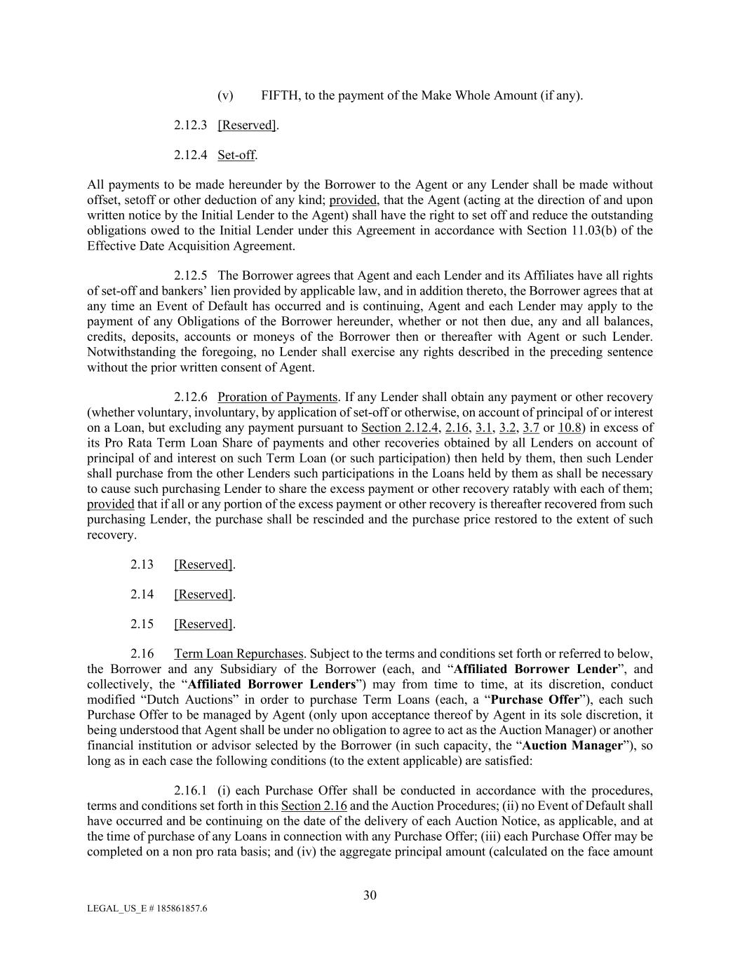30 LEGAL_US_E # 185861857.6 (v) FIFTH, to the payment of the Make Whole Amount (if any). 2.12.3 [Reserved]. 2.12.4 Set-off. All payments to be made hereunder by the Borrower to the Agent or any Lender shall be made without offset, setoff or other deduction of any kind; provided, that the Agent (acting at the direction of and upon written notice by the Initial Lender to the Agent) shall have the right to set off and reduce the outstanding obligations owed to the Initial Lender under this Agreement in accordance with Section 11.03(b) of the Effective Date Acquisition Agreement. 2.12.5 The Borrower agrees that Agent and each Lender and its Affiliates have all rights of set-off and bankers’ lien provided by applicable law, and in addition thereto, the Borrower agrees that at any time an Event of Default has occurred and is continuing, Agent and each Lender may apply to the payment of any Obligations of the Borrower hereunder, whether or not then due, any and all balances, credits, deposits, accounts or moneys of the Borrower then or thereafter with Agent or such Lender. Notwithstanding the foregoing, no Lender shall exercise any rights described in the preceding sentence without the prior written consent of Agent. 2.12.6 Proration of Payments. If any Lender shall obtain any payment or other recovery (whether voluntary, involuntary, by application of set-off or otherwise, on account of principal of or interest on a Loan, but excluding any payment pursuant to Section 2.12.4, 2.16, 3.1, 3.2, 3.7 or 10.8) in excess of its Pro Rata Term Loan Share of payments and other recoveries obtained by all Lenders on account of principal of and interest on such Term Loan (or such participation) then held by them, then such Lender shall purchase from the other Lenders such participations in the Loans held by them as shall be necessary to cause such purchasing Lender to share the excess payment or other recovery ratably with each of them; provided that if all or any portion of the excess payment or other recovery is thereafter recovered from such purchasing Lender, the purchase shall be rescinded and the purchase price restored to the extent of such recovery. 2.13 [Reserved]. 2.14 [Reserved]. 2.15 [Reserved]. 2.16 Term Loan Repurchases. Subject to the terms and conditions set forth or referred to below, the Borrower and any Subsidiary of the Borrower (each, and “Affiliated Borrower Lender”, and collectively, the “Affiliated Borrower Lenders”) may from time to time, at its discretion, conduct modified “Dutch Auctions” in order to purchase Term Loans (each, a “Purchase Offer”), each such Purchase Offer to be managed by Agent (only upon acceptance thereof by Agent in its sole discretion, it being understood that Agent shall be under no obligation to agree to act as the Auction Manager) or another financial institution or advisor selected by the Borrower (in such capacity, the “Auction Manager”), so long as in each case the following conditions (to the extent applicable) are satisfied: 2.16.1 (i) each Purchase Offer shall be conducted in accordance with the procedures, terms and conditions set forth in this Section 2.16 and the Auction Procedures; (ii) no Event of Default shall have occurred and be continuing on the date of the delivery of each Auction Notice, as applicable, and at the time of purchase of any Loans in connection with any Purchase Offer; (iii) each Purchase Offer may be completed on a non pro rata basis; and (iv) the aggregate principal amount (calculated on the face amount