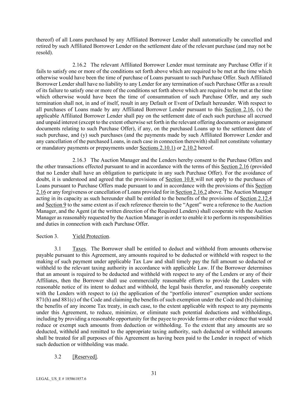 31 LEGAL_US_E # 185861857.6 thereof) of all Loans purchased by any Affiliated Borrower Lender shall automatically be cancelled and retired by such Affiliated Borrower Lender on the settlement date of the relevant purchase (and may not be resold). 2.16.2 The relevant Affiliated Borrower Lender must terminate any Purchase Offer if it fails to satisfy one or more of the conditions set forth above which are required to be met at the time which otherwise would have been the time of purchase of Loans pursuant to such Purchase Offer. Such Affiliated Borrower Lender shall have no liability to any Lender for any termination of such Purchase Offer as a result of its failure to satisfy one or more of the conditions set forth above which are required to be met at the time which otherwise would have been the time of consummation of such Purchase Offer, and any such termination shall not, in and of itself, result in any Default or Event of Default hereunder. With respect to all purchases of Loans made by any Affiliated Borrower Lender pursuant to this Section 2.16, (x) the applicable Affiliated Borrower Lender shall pay on the settlement date of each such purchase all accrued and unpaid interest (except to the extent otherwise set forth in the relevant offering documents or assignment documents relating to such Purchase Offer), if any, on the purchased Loans up to the settlement date of such purchase, and (y) such purchases (and the payments made by such Affiliated Borrower Lender and any cancellation of the purchased Loans, in each case in connection therewith) shall not constitute voluntary or mandatory payments or prepayments under Sections 2.10.1) or 2.10.2 hereof. 2.16.3 The Auction Manager and the Lenders hereby consent to the Purchase Offers and the other transactions effected pursuant to and in accordance with the terms of this Section 2.16 (provided that no Lender shall have an obligation to participate in any such Purchase Offer). For the avoidance of doubt, it is understood and agreed that the provisions of Section 10.8 will not apply to the purchases of Loans pursuant to Purchase Offers made pursuant to and in accordance with the provisions of this Section 2.16 or any forgiveness or cancellation of Loans provided for in Section 2.16.2 above. The Auction Manager acting in its capacity as such hereunder shall be entitled to the benefits of the provisions of Section 2.12.4 and Section 9 to the same extent as if each reference therein to the “Agent” were a reference to the Auction Manager, and the Agent (at the written direction of the Required Lenders) shall cooperate with the Auction Manager as reasonably requested by the Auction Manager in order to enable it to perform its responsibilities and duties in connection with each Purchase Offer. Section 3. Yield Protection. 3.1 Taxes. The Borrower shall be entitled to deduct and withhold from amounts otherwise payable pursuant to this Agreement, any amounts required to be deducted or withheld with respect to the making of such payment under applicable Tax Law and shall timely pay the full amount so deducted or withheld to the relevant taxing authority in accordance with applicable Law. If the Borrower determines that an amount is required to be deducted and withheld with respect to any of the Lenders or any of their Affiliates, then the Borrower shall use commercially reasonable efforts to provide the Lenders with reasonable notice of its intent to deduct and withhold, the legal basis therefor, and reasonably cooperate with the Lenders with respect to (a) the application of the “portfolio interest” exemption under sections 871(h) and 881(c) of the Code and claiming the benefits of such exemption under the Code and (b) claiming the benefits of any income Tax treaty, in each case, to the extent applicable with respect to any payments under this Agreement, to reduce, minimize, or eliminate such potential deductions and withholdings, including by providing a reasonable opportunity for the payee to provide forms or other evidence that would reduce or exempt such amounts from deduction or withholding. To the extent that any amounts are so deducted, withheld and remitted to the appropriate taxing authority, such deducted or withheld amounts shall be treated for all purposes of this Agreement as having been paid to the Lender in respect of which such deduction or withholding was made. 3.2 [Reserved].