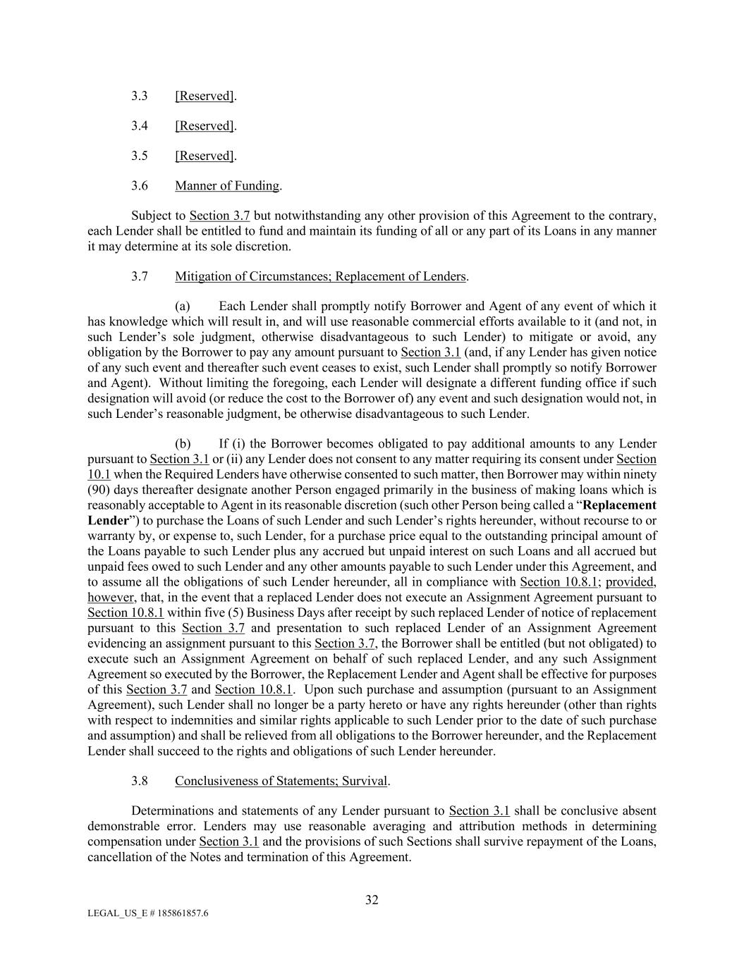 32 LEGAL_US_E # 185861857.6 3.3 [Reserved]. 3.4 [Reserved]. 3.5 [Reserved]. 3.6 Manner of Funding. Subject to Section 3.7 but notwithstanding any other provision of this Agreement to the contrary, each Lender shall be entitled to fund and maintain its funding of all or any part of its Loans in any manner it may determine at its sole discretion. 3.7 Mitigation of Circumstances; Replacement of Lenders. (a) Each Lender shall promptly notify Borrower and Agent of any event of which it has knowledge which will result in, and will use reasonable commercial efforts available to it (and not, in such Lender’s sole judgment, otherwise disadvantageous to such Lender) to mitigate or avoid, any obligation by the Borrower to pay any amount pursuant to Section 3.1 (and, if any Lender has given notice of any such event and thereafter such event ceases to exist, such Lender shall promptly so notify Borrower and Agent). Without limiting the foregoing, each Lender will designate a different funding office if such designation will avoid (or reduce the cost to the Borrower of) any event and such designation would not, in such Lender’s reasonable judgment, be otherwise disadvantageous to such Lender. (b) If (i) the Borrower becomes obligated to pay additional amounts to any Lender pursuant to Section 3.1 or (ii) any Lender does not consent to any matter requiring its consent under Section 10.1 when the Required Lenders have otherwise consented to such matter, then Borrower may within ninety (90) days thereafter designate another Person engaged primarily in the business of making loans which is reasonably acceptable to Agent in its reasonable discretion (such other Person being called a “Replacement Lender”) to purchase the Loans of such Lender and such Lender’s rights hereunder, without recourse to or warranty by, or expense to, such Lender, for a purchase price equal to the outstanding principal amount of the Loans payable to such Lender plus any accrued but unpaid interest on such Loans and all accrued but unpaid fees owed to such Lender and any other amounts payable to such Lender under this Agreement, and to assume all the obligations of such Lender hereunder, all in compliance with Section 10.8.1; provided, however, that, in the event that a replaced Lender does not execute an Assignment Agreement pursuant to Section 10.8.1 within five (5) Business Days after receipt by such replaced Lender of notice of replacement pursuant to this Section 3.7 and presentation to such replaced Lender of an Assignment Agreement evidencing an assignment pursuant to this Section 3.7, the Borrower shall be entitled (but not obligated) to execute such an Assignment Agreement on behalf of such replaced Lender, and any such Assignment Agreement so executed by the Borrower, the Replacement Lender and Agent shall be effective for purposes of this Section 3.7 and Section 10.8.1. Upon such purchase and assumption (pursuant to an Assignment Agreement), such Lender shall no longer be a party hereto or have any rights hereunder (other than rights with respect to indemnities and similar rights applicable to such Lender prior to the date of such purchase and assumption) and shall be relieved from all obligations to the Borrower hereunder, and the Replacement Lender shall succeed to the rights and obligations of such Lender hereunder. 3.8 Conclusiveness of Statements; Survival. Determinations and statements of any Lender pursuant to Section 3.1 shall be conclusive absent demonstrable error. Lenders may use reasonable averaging and attribution methods in determining compensation under Section 3.1 and the provisions of such Sections shall survive repayment of the Loans, cancellation of the Notes and termination of this Agreement.