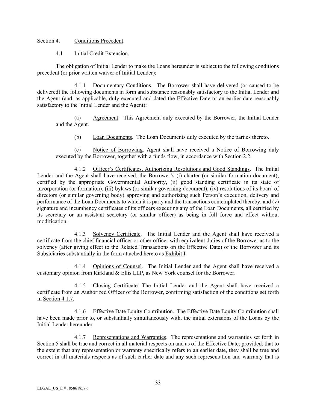 33 LEGAL_US_E # 185861857.6 Section 4. Conditions Precedent. 4.1 Initial Credit Extension. The obligation of Initial Lender to make the Loans hereunder is subject to the following conditions precedent (or prior written waiver of Initial Lender): 4.1.1 Documentary Conditions. The Borrower shall have delivered (or caused to be delivered) the following documents in form and substance reasonably satisfactory to the Initial Lender and the Agent (and, as applicable, duly executed and dated the Effective Date or an earlier date reasonably satisfactory to the Initial Lender and the Agent): (a) Agreement. This Agreement duly executed by the Borrower, the Initial Lender and the Agent. (b) Loan Documents. The Loan Documents duly executed by the parties thereto. (c) Notice of Borrowing. Agent shall have received a Notice of Borrowing duly executed by the Borrower, together with a funds flow, in accordance with Section 2.2. 4.1.2 Officer’s Certificates, Authorizing Resolutions and Good Standings. The Initial Lender and the Agent shall have received, the Borrower’s (i) charter (or similar formation document), certified by the appropriate Governmental Authority, (ii) good standing certificate in its state of incorporation (or formation), (iii) bylaws (or similar governing document), (iv) resolutions of its board of directors (or similar governing body) approving and authorizing such Person’s execution, delivery and performance of the Loan Documents to which it is party and the transactions contemplated thereby, and (v) signature and incumbency certificates of its officers executing any of the Loan Documents, all certified by its secretary or an assistant secretary (or similar officer) as being in full force and effect without modification. 4.1.3 Solvency Certificate. The Initial Lender and the Agent shall have received a certificate from the chief financial officer or other officer with equivalent duties of the Borrower as to the solvency (after giving effect to the Related Transactions on the Effective Date) of the Borrower and its Subsidiaries substantially in the form attached hereto as Exhibit I. 4.1.4 Opinions of Counsel. The Initial Lender and the Agent shall have received a customary opinion from Kirkland & Ellis LLP, as New York counsel for the Borrower. 4.1.5 Closing Certificate. The Initial Lender and the Agent shall have received a certificate from an Authorized Officer of the Borrower, confirming satisfaction of the conditions set forth in Section 4.1.7. 4.1.6 Effective Date Equity Contribution. The Effective Date Equity Contribution shall have been made prior to, or substantially simultaneously with, the initial extensions of the Loans by the Initial Lender hereunder. 4.1.7 Representations and Warranties. The representations and warranties set forth in Section 5 shall be true and correct in all material respects on and as of the Effective Date; provided, that to the extent that any representation or warranty specifically refers to an earlier date, they shall be true and correct in all materials respects as of such earlier date and any such representation and warranty that is