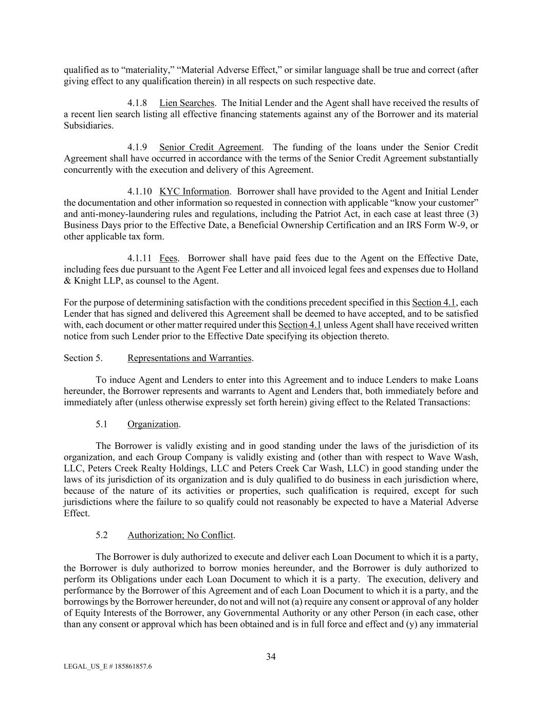 34 LEGAL_US_E # 185861857.6 qualified as to “materiality,” “Material Adverse Effect,” or similar language shall be true and correct (after giving effect to any qualification therein) in all respects on such respective date. 4.1.8 Lien Searches. The Initial Lender and the Agent shall have received the results of a recent lien search listing all effective financing statements against any of the Borrower and its material Subsidiaries. 4.1.9 Senior Credit Agreement. The funding of the loans under the Senior Credit Agreement shall have occurred in accordance with the terms of the Senior Credit Agreement substantially concurrently with the execution and delivery of this Agreement. 4.1.10 KYC Information. Borrower shall have provided to the Agent and Initial Lender the documentation and other information so requested in connection with applicable “know your customer” and anti-money-laundering rules and regulations, including the Patriot Act, in each case at least three (3) Business Days prior to the Effective Date, a Beneficial Ownership Certification and an IRS Form W-9, or other applicable tax form. 4.1.11 Fees. Borrower shall have paid fees due to the Agent on the Effective Date, including fees due pursuant to the Agent Fee Letter and all invoiced legal fees and expenses due to Holland & Knight LLP, as counsel to the Agent. For the purpose of determining satisfaction with the conditions precedent specified in this Section 4.1, each Lender that has signed and delivered this Agreement shall be deemed to have accepted, and to be satisfied with, each document or other matter required under this Section 4.1 unless Agent shall have received written notice from such Lender prior to the Effective Date specifying its objection thereto. Section 5. Representations and Warranties. To induce Agent and Lenders to enter into this Agreement and to induce Lenders to make Loans hereunder, the Borrower represents and warrants to Agent and Lenders that, both immediately before and immediately after (unless otherwise expressly set forth herein) giving effect to the Related Transactions: 5.1 Organization. The Borrower is validly existing and in good standing under the laws of the jurisdiction of its organization, and each Group Company is validly existing and (other than with respect to Wave Wash, LLC, Peters Creek Realty Holdings, LLC and Peters Creek Car Wash, LLC) in good standing under the laws of its jurisdiction of its organization and is duly qualified to do business in each jurisdiction where, because of the nature of its activities or properties, such qualification is required, except for such jurisdictions where the failure to so qualify could not reasonably be expected to have a Material Adverse Effect. 5.2 Authorization; No Conflict. The Borrower is duly authorized to execute and deliver each Loan Document to which it is a party, the Borrower is duly authorized to borrow monies hereunder, and the Borrower is duly authorized to perform its Obligations under each Loan Document to which it is a party. The execution, delivery and performance by the Borrower of this Agreement and of each Loan Document to which it is a party, and the borrowings by the Borrower hereunder, do not and will not (a) require any consent or approval of any holder of Equity Interests of the Borrower, any Governmental Authority or any other Person (in each case, other than any consent or approval which has been obtained and is in full force and effect and (y) any immaterial