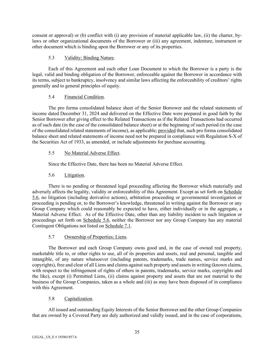 35 LEGAL_US_E # 185861857.6 consent or approval) or (b) conflict with (i) any provision of material applicable law, (ii) the charter, by- laws or other organizational documents of the Borrower or (iii) any agreement, indenture, instrument or other document which is binding upon the Borrower or any of its properties. 5.3 Validity; Binding Nature. Each of this Agreement and each other Loan Document to which the Borrower is a party is the legal, valid and binding obligation of the Borrower, enforceable against the Borrower in accordance with its terms, subject to bankruptcy, insolvency and similar laws affecting the enforceability of creditors’ rights generally and to general principles of equity. 5.4 Financial Condition. The pro forma consolidated balance sheet of the Senior Borrower and the related statements of income dated December 31, 2024 and delivered on the Effective Date were prepared in good faith by the Senior Borrower after giving effect to the Related Transactions as if the Related Transactions had occurred as of such date (in the case of the consolidated balance sheet) or at the beginning of such period (in the case of the consolidated related statements of income), as applicable; provided that, such pro forma consolidated balance sheet and related statements of income need not be prepared in compliance with Regulation S-X of the Securities Act of 1933, as amended, or include adjustments for purchase accounting. 5.5 No Material Adverse Effect. Since the Effective Date, there has been no Material Adverse Effect. 5.6 Litigation. There is no pending or threatened legal proceeding affecting the Borrower which materially and adversely affects the legality, validity or enforceability of this Agreement. Except as set forth on Schedule 5.6, no litigation (including derivative actions), arbitration proceeding or governmental investigation or proceeding is pending or, to the Borrower’s knowledge, threatened in writing against the Borrower or any Group Company which could reasonably be expected to have, either individually or in the aggregate, a Material Adverse Effect. As of the Effective Date, other than any liability incident to such litigation or proceedings set forth on Schedule 5.6, neither the Borrower nor any Group Company has any material Contingent Obligations not listed on Schedule 7.1. 5.7 Ownership of Properties; Liens. The Borrower and each Group Company owns good and, in the case of owned real property, marketable title to, or other rights to use, all of its properties and assets, real and personal, tangible and intangible, of any nature whatsoever (including patents, trademarks, trade names, service marks and copyrights), free and clear of all Liens and claims against such property and assets in writing (known claims, with respect to the infringement of rights of others in patents, trademarks, service marks, copyrights and the like), except (i) Permitted Liens, (ii) claims against property and assets that are not material to the business of the Group Companies, taken as a whole and (iii) as may have been disposed of in compliance with this Agreement. 5.8 Capitalization. All issued and outstanding Equity Interests of the Senior Borrower and the other Group Companies that are owned by a Covered Party are duly authorized and validly issued, and in the case of corporations,