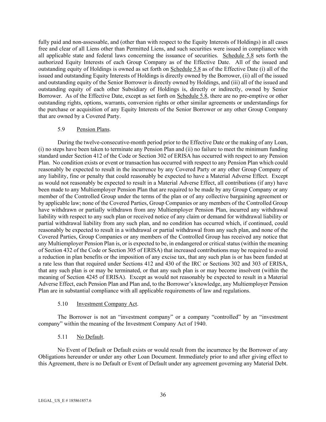 36 LEGAL_US_E # 185861857.6 fully paid and non-assessable, and (other than with respect to the Equity Interests of Holdings) in all cases free and clear of all Liens other than Permitted Liens, and such securities were issued in compliance with all applicable state and federal laws concerning the issuance of securities. Schedule 5.8 sets forth the authorized Equity Interests of each Group Company as of the Effective Date. All of the issued and outstanding equity of Holdings is owned as set forth on Schedule 5.8 as of the Effective Date (i) all of the issued and outstanding Equity Interests of Holdings is directly owned by the Borrower, (ii) all of the issued and outstanding equity of the Senior Borrower is directly owned by Holdings, and (iii) all of the issued and outstanding equity of each other Subsidiary of Holdings is, directly or indirectly, owned by Senior Borrower. As of the Effective Date, except as set forth on Schedule 5.8, there are no pre-emptive or other outstanding rights, options, warrants, conversion rights or other similar agreements or understandings for the purchase or acquisition of any Equity Interests of the Senior Borrower or any other Group Company that are owned by a Covered Party. 5.9 Pension Plans. During the twelve-consecutive-month period prior to the Effective Date or the making of any Loan, (i) no steps have been taken to terminate any Pension Plan and (ii) no failure to meet the minimum funding standard under Section 412 of the Code or Section 302 of ERISA has occurred with respect to any Pension Plan. No condition exists or event or transaction has occurred with respect to any Pension Plan which could reasonably be expected to result in the incurrence by any Covered Party or any other Group Company of any liability, fine or penalty that could reasonably be expected to have a Material Adverse Effect. Except as would not reasonably be expected to result in a Material Adverse Effect, all contributions (if any) have been made to any Multiemployer Pension Plan that are required to be made by any Group Company or any member of the Controlled Group under the terms of the plan or of any collective bargaining agreement or by applicable law; none of the Covered Parties, Group Companies or any members of the Controlled Group have withdrawn or partially withdrawn from any Multiemployer Pension Plan, incurred any withdrawal liability with respect to any such plan or received notice of any claim or demand for withdrawal liability or partial withdrawal liability from any such plan, and no condition has occurred which, if continued, could reasonably be expected to result in a withdrawal or partial withdrawal from any such plan, and none of the Covered Parties, Group Companies or any members of the Controlled Group has received any notice that any Multiemployer Pension Plan is, or is expected to be, in endangered or critical status (within the meaning of Section 432 of the Code or Section 305 of ERISA) that increased contributions may be required to avoid a reduction in plan benefits or the imposition of any excise tax, that any such plan is or has been funded at a rate less than that required under Sections 412 and 430 of the IRC or Sections 302 and 303 of ERISA, that any such plan is or may be terminated, or that any such plan is or may become insolvent (within the meaning of Section 4245 of ERISA). Except as would not reasonably be expected to result in a Material Adverse Effect, each Pension Plan and Plan and, to the Borrower’s knowledge, any Multiemployer Pension Plan are in substantial compliance with all applicable requirements of law and regulations. 5.10 Investment Company Act. The Borrower is not an “investment company” or a company “controlled” by an “investment company” within the meaning of the Investment Company Act of 1940. 5.11 No Default. No Event of Default or Default exists or would result from the incurrence by the Borrower of any Obligations hereunder or under any other Loan Document. Immediately prior to and after giving effect to this Agreement, there is no Default or Event of Default under any agreement governing any Material Debt.