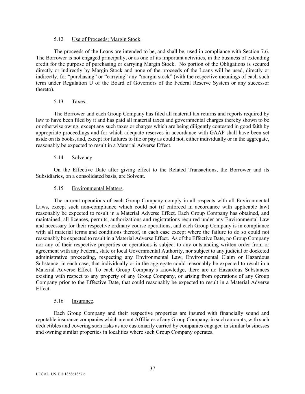 37 LEGAL_US_E # 185861857.6 5.12 Use of Proceeds; Margin Stock. The proceeds of the Loans are intended to be, and shall be, used in compliance with Section 7.6. The Borrower is not engaged principally, or as one of its important activities, in the business of extending credit for the purpose of purchasing or carrying Margin Stock. No portion of the Obligations is secured directly or indirectly by Margin Stock and none of the proceeds of the Loans will be used, directly or indirectly, for “purchasing” or “carrying” any “margin stock” (with the respective meanings of each such term under Regulation U of the Board of Governors of the Federal Reserve System or any successor thereto). 5.13 Taxes. The Borrower and each Group Company has filed all material tax returns and reports required by law to have been filed by it and has paid all material taxes and governmental charges thereby shown to be or otherwise owing, except any such taxes or charges which are being diligently contested in good faith by appropriate proceedings and for which adequate reserves in accordance with GAAP shall have been set aside on its books, and, except for failures to file or pay as could not, either individually or in the aggregate, reasonably be expected to result in a Material Adverse Effect. 5.14 Solvency. On the Effective Date after giving effect to the Related Transactions, the Borrower and its Subsidiaries, on a consolidated basis, are Solvent. 5.15 Environmental Matters. The current operations of each Group Company comply in all respects with all Environmental Laws, except such non-compliance which could not (if enforced in accordance with applicable law) reasonably be expected to result in a Material Adverse Effect. Each Group Company has obtained, and maintained, all licenses, permits, authorizations and registrations required under any Environmental Law and necessary for their respective ordinary course operations, and each Group Company is in compliance with all material terms and conditions thereof, in each case except where the failure to do so could not reasonably be expected to result in a Material Adverse Effect. As of the Effective Date, no Group Company nor any of their respective properties or operations is subject to any outstanding written order from or agreement with any Federal, state or local Governmental Authority, nor subject to any judicial or docketed administrative proceeding, respecting any Environmental Law, Environmental Claim or Hazardous Substance, in each case, that individually or in the aggregate could reasonably be expected to result in a Material Adverse Effect. To each Group Company’s knowledge, there are no Hazardous Substances existing with respect to any property of any Group Company, or arising from operations of any Group Company prior to the Effective Date, that could reasonably be expected to result in a Material Adverse Effect. 5.16 Insurance. Each Group Company and their respective properties are insured with financially sound and reputable insurance companies which are not Affiliates of any Group Company, in such amounts, with such deductibles and covering such risks as are customarily carried by companies engaged in similar businesses and owning similar properties in localities where such Group Company operates.