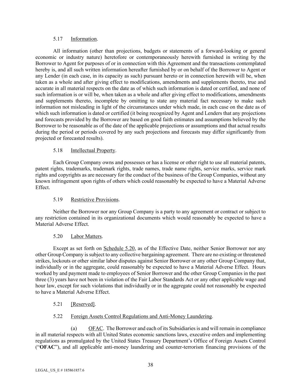 38 LEGAL_US_E # 185861857.6 5.17 Information. All information (other than projections, budgets or statements of a forward-looking or general economic or industry nature) heretofore or contemporaneously herewith furnished in writing by the Borrower to Agent for purposes of or in connection with this Agreement and the transactions contemplated hereby is, and all such written information hereafter furnished by or on behalf of the Borrower to Agent or any Lender (in each case, in its capacity as such) pursuant hereto or in connection herewith will be, when taken as a whole and after giving effect to modifications, amendments and supplements thereto, true and accurate in all material respects on the date as of which such information is dated or certified, and none of such information is or will be, when taken as a whole and after giving effect to modifications, amendments and supplements thereto, incomplete by omitting to state any material fact necessary to make such information not misleading in light of the circumstances under which made, in each case on the date as of which such information is dated or certified (it being recognized by Agent and Lenders that any projections and forecasts provided by the Borrower are based on good faith estimates and assumptions believed by the Borrower to be reasonable as of the date of the applicable projections or assumptions and that actual results during the period or periods covered by any such projections and forecasts may differ significantly from projected or forecasted results). 5.18 Intellectual Property. Each Group Company owns and possesses or has a license or other right to use all material patents, patent rights, trademarks, trademark rights, trade names, trade name rights, service marks, service mark rights and copyrights as are necessary for the conduct of the business of the Group Companies, without any known infringement upon rights of others which could reasonably be expected to have a Material Adverse Effect. 5.19 Restrictive Provisions. Neither the Borrower nor any Group Company is a party to any agreement or contract or subject to any restriction contained in its organizational documents which would reasonably be expected to have a Material Adverse Effect. 5.20 Labor Matters. Except as set forth on Schedule 5.20, as of the Effective Date, neither Senior Borrower nor any other Group Company is subject to any collective bargaining agreement. There are no existing or threatened strikes, lockouts or other similar labor disputes against Senior Borrower or any other Group Company that, individually or in the aggregate, could reasonably be expected to have a Material Adverse Effect. Hours worked by and payment made to employees of Senior Borrower and the other Group Companies in the past three (3) years have not been in violation of the Fair Labor Standards Act or any other applicable wage and hour law, except for such violations that individually or in the aggregate could not reasonably be expected to have a Material Adverse Effect. 5.21 [Reserved]. 5.22 Foreign Assets Control Regulations and Anti-Money Laundering. (a) OFAC. The Borrower and each of its Subsidiaries is and will remain in compliance in all material respects with all United States economic sanctions laws, executive orders and implementing regulations as promulgated by the United States Treasury Department’s Office of Foreign Assets Control (“OFAC”), and all applicable anti-money laundering and counter-terrorism financing provisions of the