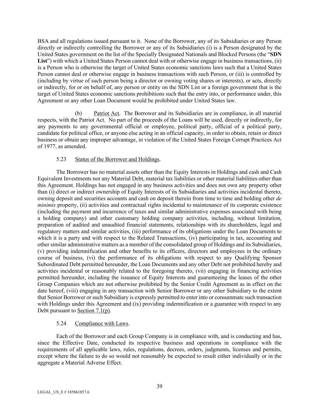 39 LEGAL_US_E # 185861857.6 BSA and all regulations issued pursuant to it. None of the Borrower, any of its Subsidiaries or any Person directly or indirectly controlling the Borrower or any of its Subsidiaries (i) is a Person designated by the United States government on the list of the Specially Designated Nationals and Blocked Persons (the “SDN List”) with which a United States Person cannot deal with or otherwise engage in business transactions, (ii) is a Person who is otherwise the target of United States economic sanctions laws such that a United States Person cannot deal or otherwise engage in business transactions with such Person, or (iii) is controlled by (including by virtue of such person being a director or owning voting shares or interests), or acts, directly or indirectly, for or on behalf of, any person or entity on the SDN List or a foreign government that is the target of United States economic sanctions prohibitions such that the entry into, or performance under, this Agreement or any other Loan Document would be prohibited under United States law. (b) Patriot Act. The Borrower and its Subsidiaries are in compliance, in all material respects, with the Patriot Act. No part of the proceeds of the Loans will be used, directly or indirectly, for any payments to any governmental official or employee, political party, official of a political party, candidate for political office, or anyone else acting in an official capacity, in order to obtain, retain or direct business or obtain any improper advantage, in violation of the United States Foreign Corrupt Practices Act of 1977, as amended. 5.23 Status of the Borrower and Holdings. The Borrower has no material assets other than the Equity Interests in Holdings and cash and Cash Equivalent Investments nor any Material Debt, material tax liabilities or other material liabilities other than this Agreement. Holdings has not engaged in any business activities and does not own any property other than (i) direct or indirect ownership of Equity Interests of its Subsidiaries and activities incidental thereto, owning deposit and securities accounts and cash on deposit therein from time to time and holding other de minimis property, (ii) activities and contractual rights incidental to maintenance of its corporate existence (including the payment and incurrence of taxes and similar administrative expenses associated with being a holding company) and other customary holding company activities, including, without limitation, preparation of audited and unaudited financial statements, relationships with its shareholders, legal and regulatory matters and similar activities, (iii) performance of its obligations under the Loan Documents to which it is a party and with respect to the Related Transactions, (iv) participating in tax, accounting and other similar administrative matters as a member of the consolidated group of Holdings and its Subsidiaries, (v) providing indemnification and other benefits to its officers, directors and employees in the ordinary course of business, (vi) the performance of its obligations with respect to any Qualifying Sponsor Subordinated Debt permitted hereunder, the Loan Documents and any other Debt not prohibited hereby and activities incidental or reasonably related to the foregoing thereto, (vii) engaging in financing activities permitted hereunder, including the issuance of Equity Interests and guaranteeing the leases of the other Group Companies which are not otherwise prohibited by the Senior Credit Agreement as in effect on the date hereof, (viii) engaging in any transaction with Senior Borrower or any other Subsidiary to the extent that Senior Borrower or such Subsidiary is expressly permitted to enter into or consummate such transaction with Holdings under this Agreement and (ix) providing indemnification or a guarantee with respect to any Debt pursuant to Section 7.1(p). 5.24 Compliance with Laws. Each of the Borrower and each Group Company is in compliance with, and is conducting and has, since the Effective Date, conducted its respective business and operations in compliance with the requirements of all applicable laws, rules, regulations, decrees, orders, judgments, licenses and permits, except where the failure to do so would not reasonably be expected to result either individually or in the aggregate a Material Adverse Effect.