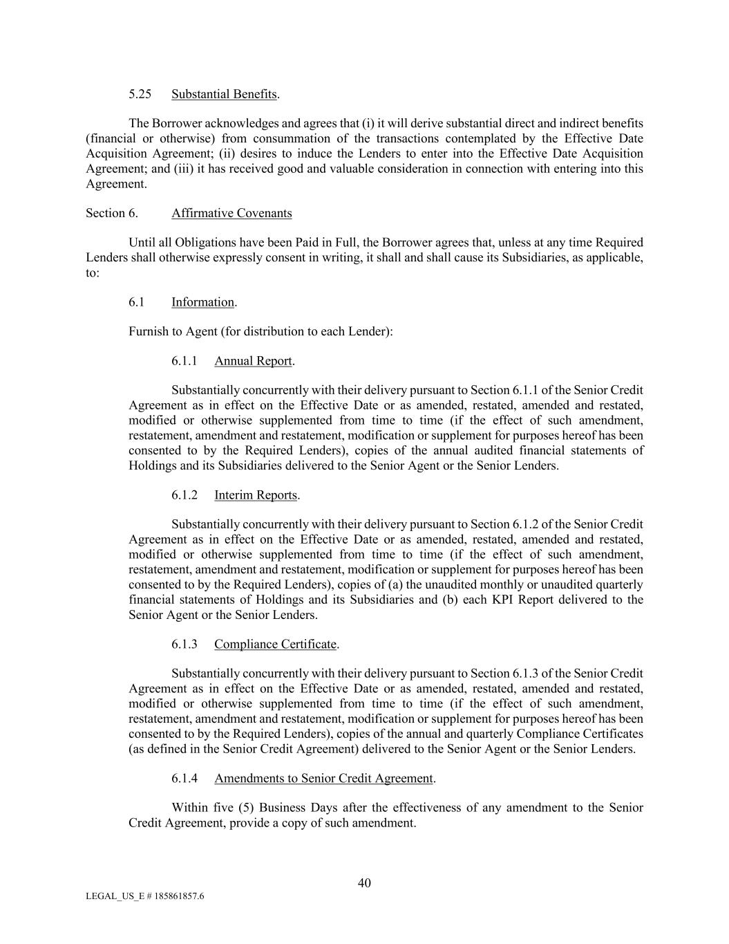 40 LEGAL_US_E # 185861857.6 5.25 Substantial Benefits. The Borrower acknowledges and agrees that (i) it will derive substantial direct and indirect benefits (financial or otherwise) from consummation of the transactions contemplated by the Effective Date Acquisition Agreement; (ii) desires to induce the Lenders to enter into the Effective Date Acquisition Agreement; and (iii) it has received good and valuable consideration in connection with entering into this Agreement. Section 6. Affirmative Covenants Until all Obligations have been Paid in Full, the Borrower agrees that, unless at any time Required Lenders shall otherwise expressly consent in writing, it shall and shall cause its Subsidiaries, as applicable, to: 6.1 Information. Furnish to Agent (for distribution to each Lender): 6.1.1 Annual Report. Substantially concurrently with their delivery pursuant to Section 6.1.1 of the Senior Credit Agreement as in effect on the Effective Date or as amended, restated, amended and restated, modified or otherwise supplemented from time to time (if the effect of such amendment, restatement, amendment and restatement, modification or supplement for purposes hereof has been consented to by the Required Lenders), copies of the annual audited financial statements of Holdings and its Subsidiaries delivered to the Senior Agent or the Senior Lenders. 6.1.2 Interim Reports. Substantially concurrently with their delivery pursuant to Section 6.1.2 of the Senior Credit Agreement as in effect on the Effective Date or as amended, restated, amended and restated, modified or otherwise supplemented from time to time (if the effect of such amendment, restatement, amendment and restatement, modification or supplement for purposes hereof has been consented to by the Required Lenders), copies of (a) the unaudited monthly or unaudited quarterly financial statements of Holdings and its Subsidiaries and (b) each KPI Report delivered to the Senior Agent or the Senior Lenders. 6.1.3 Compliance Certificate. Substantially concurrently with their delivery pursuant to Section 6.1.3 of the Senior Credit Agreement as in effect on the Effective Date or as amended, restated, amended and restated, modified or otherwise supplemented from time to time (if the effect of such amendment, restatement, amendment and restatement, modification or supplement for purposes hereof has been consented to by the Required Lenders), copies of the annual and quarterly Compliance Certificates (as defined in the Senior Credit Agreement) delivered to the Senior Agent or the Senior Lenders. 6.1.4 Amendments to Senior Credit Agreement. Within five (5) Business Days after the effectiveness of any amendment to the Senior Credit Agreement, provide a copy of such amendment.