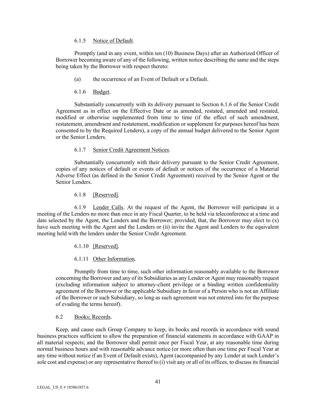 41 LEGAL_US_E # 185861857.6 6.1.5 Notice of Default. Promptly (and in any event, within ten (10) Business Days) after an Authorized Officer of Borrower becoming aware of any of the following, written notice describing the same and the steps being taken by the Borrower with respect thereto: (a) the occurrence of an Event of Default or a Default. 6.1.6 Budget. Substantially concurrently with its delivery pursuant to Section 6.1.6 of the Senior Credit Agreement as in effect on the Effective Date or as amended, restated, amended and restated, modified or otherwise supplemented from time to time (if the effect of such amendment, restatement, amendment and restatement, modification or supplement for purposes hereof has been consented to by the Required Lenders), a copy of the annual budget delivered to the Senior Agent or the Senior Lenders. 6.1.7 Senior Credit Agreement Notices. Substantially concurrently with their delivery pursuant to the Senior Credit Agreement, copies of any notices of default or events of default or notices of the occurrence of a Material Adverse Effect (as defined in the Senior Credit Agreement) received by the Senior Agent or the Senior Lenders. 6.1.8 [Reserved]. 6.1.9 Lender Calls. At the request of the Agent, the Borrower will participate in a meeting of the Lenders no more than once in any Fiscal Quarter, to be held via teleconference at a time and date selected by the Agent, the Lenders and the Borrower; provided, that, the Borrower may elect to (x) have such meeting with the Agent and the Lenders or (ii) invite the Agent and Lenders to the equivalent meeting held with the lenders under the Senior Credit Agreement. 6.1.10 [Reserved]. 6.1.11 Other Information. Promptly from time to time, such other information reasonably available to the Borrower concerning the Borrower and any of its Subsidiaries as any Lender or Agent may reasonably request (excluding information subject to attorney-client privilege or a binding written confidentiality agreement of the Borrower or the applicable Subsidiary in favor of a Person who is not an Affiliate of the Borrower or such Subsidiary, so long as such agreement was not entered into for the purpose of evading the terms hereof). 6.2 Books; Records. Keep, and cause each Group Company to keep, its books and records in accordance with sound business practices sufficient to allow the preparation of financial statements in accordance with GAAP in all material respects; and the Borrower shall permit once per Fiscal Year, at any reasonable time during normal business hours and with reasonable advance notice (or more often than one time per Fiscal Year at any time without notice if an Event of Default exists), Agent (accompanied by any Lender at such Lender’s sole cost and expense) or any representative thereof to (i) visit any or all of its offices, to discuss its financial