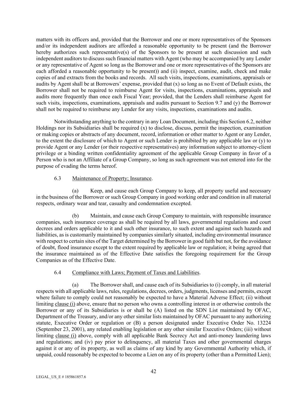 42 LEGAL_US_E # 185861857.6 matters with its officers and, provided that the Borrower and one or more representatives of the Sponsors and/or its independent auditors are afforded a reasonable opportunity to be present (and the Borrower hereby authorizes such representative(s) of the Sponsors to be present at such discussion and such independent auditors to discuss such financial matters with Agent (who may be accompanied by any Lender or any representative of Agent so long as the Borrower and one or more representatives of the Sponsors are each afforded a reasonable opportunity to be present)) and (ii) inspect, examine, audit, check and make copies of and extracts from the books and records. All such visits, inspections, examinations, appraisals or audits by Agent shall be at Borrowers’ expense, provided that (x) so long as no Event of Default exists, the Borrower shall not be required to reimburse Agent for visits, inspections, examinations, appraisals and audits more frequently than once each Fiscal Year; provided, that the Lenders shall reimburse Agent for such visits, inspections, examinations, appraisals and audits pursuant to Section 9.7 and (y) the Borrower shall not be required to reimburse any Lender for any visits, inspections, examinations and audits. Notwithstanding anything to the contrary in any Loan Document, including this Section 6.2, neither Holdings nor its Subsidiaries shall be required (x) to disclose, discuss, permit the inspection, examination or making copies or abstracts of any document, record, information or other matter to Agent or any Lender, to the extent the disclosure of which to Agent or such Lender is prohibited by any applicable law or (y) to provide Agent or any Lender (or their respective representatives) any information subject to attorney-client privilege or a binding written confidentiality agreement of the applicable Group Company in favor of a Person who is not an Affiliate of a Group Company, so long as such agreement was not entered into for the purpose of evading the terms hereof. 6.3 Maintenance of Property; Insurance. (a) Keep, and cause each Group Company to keep, all property useful and necessary in the business of the Borrower or such Group Company in good working order and condition in all material respects, ordinary wear and tear, casualty and condemnation excepted. (b) Maintain, and cause each Group Company to maintain, with responsible insurance companies, such insurance coverage as shall be required by all laws, governmental regulations and court decrees and orders applicable to it and such other insurance, to such extent and against such hazards and liabilities, as is customarily maintained by companies similarly situated, including environmental insurance with respect to certain sites of the Target determined by the Borrower in good faith but not, for the avoidance of doubt, flood insurance except to the extent required by applicable law or regulation; it being agreed that the insurance maintained as of the Effective Date satisfies the foregoing requirement for the Group Companies as of the Effective Date. 6.4 Compliance with Laws; Payment of Taxes and Liabilities. (a) The Borrower shall, and cause each of its Subsidiaries to (i) comply, in all material respects with all applicable laws, rules, regulations, decrees, orders, judgments, licenses and permits, except where failure to comply could not reasonably be expected to have a Material Adverse Effect; (ii) without limiting clause (i) above, ensure that no person who owns a controlling interest in or otherwise controls the Borrower or any of its Subsidiaries is or shall be (A) listed on the SDN List maintained by OFAC, Department of the Treasury, and/or any other similar lists maintained by OFAC pursuant to any authorizing statute, Executive Order or regulation or (B) a person designated under Executive Order No. 13224 (September 23, 2001), any related enabling legislation or any other similar Executive Orders; (iii) without limiting clause (i) above, comply with all applicable Bank Secrecy Act and anti-money laundering laws and regulations; and (iv) pay prior to delinquency, all material Taxes and other governmental charges against it or any of its property, as well as claims of any kind by any Governmental Authority which, if unpaid, could reasonably be expected to become a Lien on any of its property (other than a Permitted Lien);
