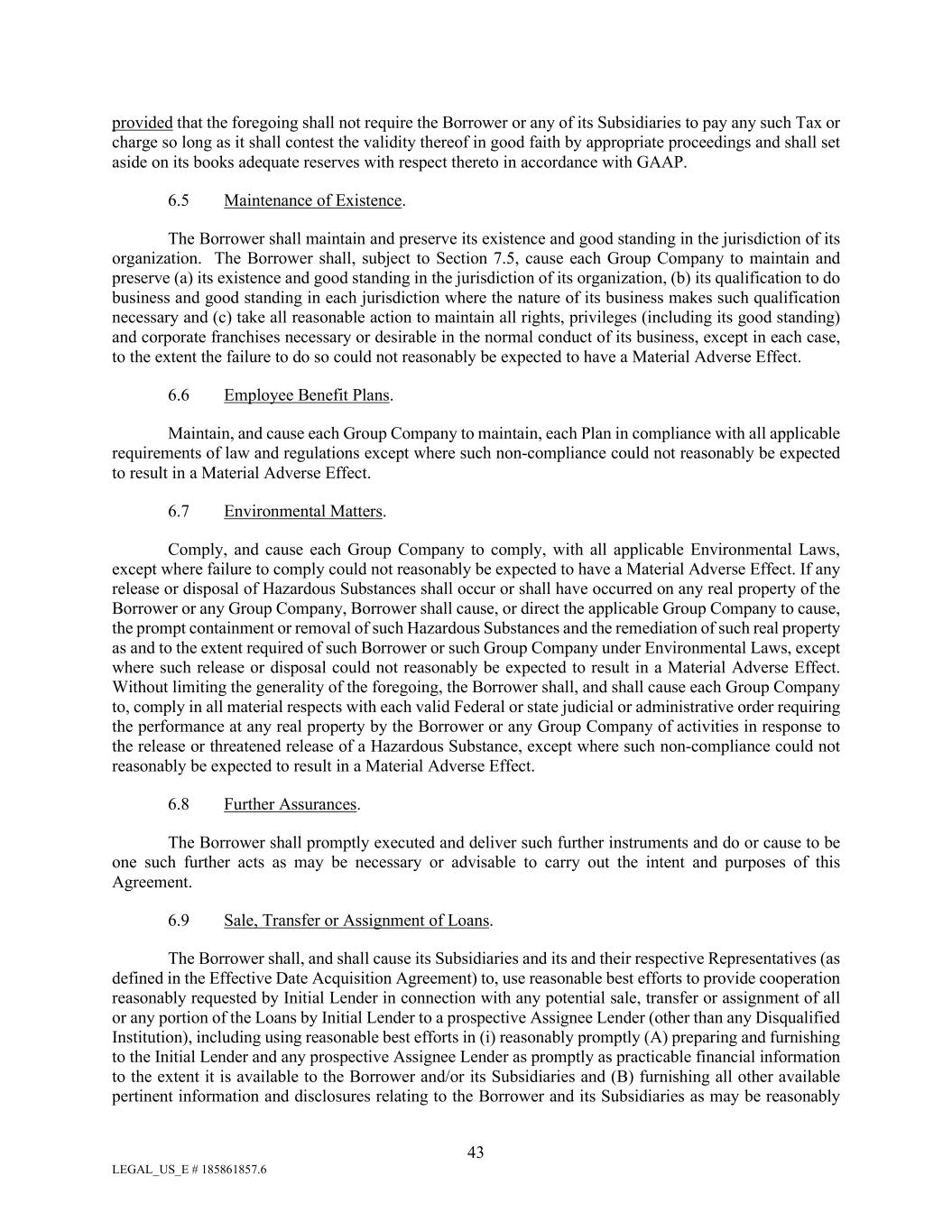 43 LEGAL_US_E # 185861857.6 provided that the foregoing shall not require the Borrower or any of its Subsidiaries to pay any such Tax or charge so long as it shall contest the validity thereof in good faith by appropriate proceedings and shall set aside on its books adequate reserves with respect thereto in accordance with GAAP. 6.5 Maintenance of Existence. The Borrower shall maintain and preserve its existence and good standing in the jurisdiction of its organization. The Borrower shall, subject to Section 7.5, cause each Group Company to maintain and preserve (a) its existence and good standing in the jurisdiction of its organization, (b) its qualification to do business and good standing in each jurisdiction where the nature of its business makes such qualification necessary and (c) take all reasonable action to maintain all rights, privileges (including its good standing) and corporate franchises necessary or desirable in the normal conduct of its business, except in each case, to the extent the failure to do so could not reasonably be expected to have a Material Adverse Effect. 6.6 Employee Benefit Plans. Maintain, and cause each Group Company to maintain, each Plan in compliance with all applicable requirements of law and regulations except where such non-compliance could not reasonably be expected to result in a Material Adverse Effect. 6.7 Environmental Matters. Comply, and cause each Group Company to comply, with all applicable Environmental Laws, except where failure to comply could not reasonably be expected to have a Material Adverse Effect. If any release or disposal of Hazardous Substances shall occur or shall have occurred on any real property of the Borrower or any Group Company, Borrower shall cause, or direct the applicable Group Company to cause, the prompt containment or removal of such Hazardous Substances and the remediation of such real property as and to the extent required of such Borrower or such Group Company under Environmental Laws, except where such release or disposal could not reasonably be expected to result in a Material Adverse Effect. Without limiting the generality of the foregoing, the Borrower shall, and shall cause each Group Company to, comply in all material respects with each valid Federal or state judicial or administrative order requiring the performance at any real property by the Borrower or any Group Company of activities in response to the release or threatened release of a Hazardous Substance, except where such non-compliance could not reasonably be expected to result in a Material Adverse Effect. 6.8 Further Assurances. The Borrower shall promptly executed and deliver such further instruments and do or cause to be one such further acts as may be necessary or advisable to carry out the intent and purposes of this Agreement. 6.9 Sale, Transfer or Assignment of Loans. The Borrower shall, and shall cause its Subsidiaries and its and their respective Representatives (as defined in the Effective Date Acquisition Agreement) to, use reasonable best efforts to provide cooperation reasonably requested by Initial Lender in connection with any potential sale, transfer or assignment of all or any portion of the Loans by Initial Lender to a prospective Assignee Lender (other than any Disqualified Institution), including using reasonable best efforts in (i) reasonably promptly (A) preparing and furnishing to the Initial Lender and any prospective Assignee Lender as promptly as practicable financial information to the extent it is available to the Borrower and/or its Subsidiaries and (B) furnishing all other available pertinent information and disclosures relating to the Borrower and its Subsidiaries as may be reasonably