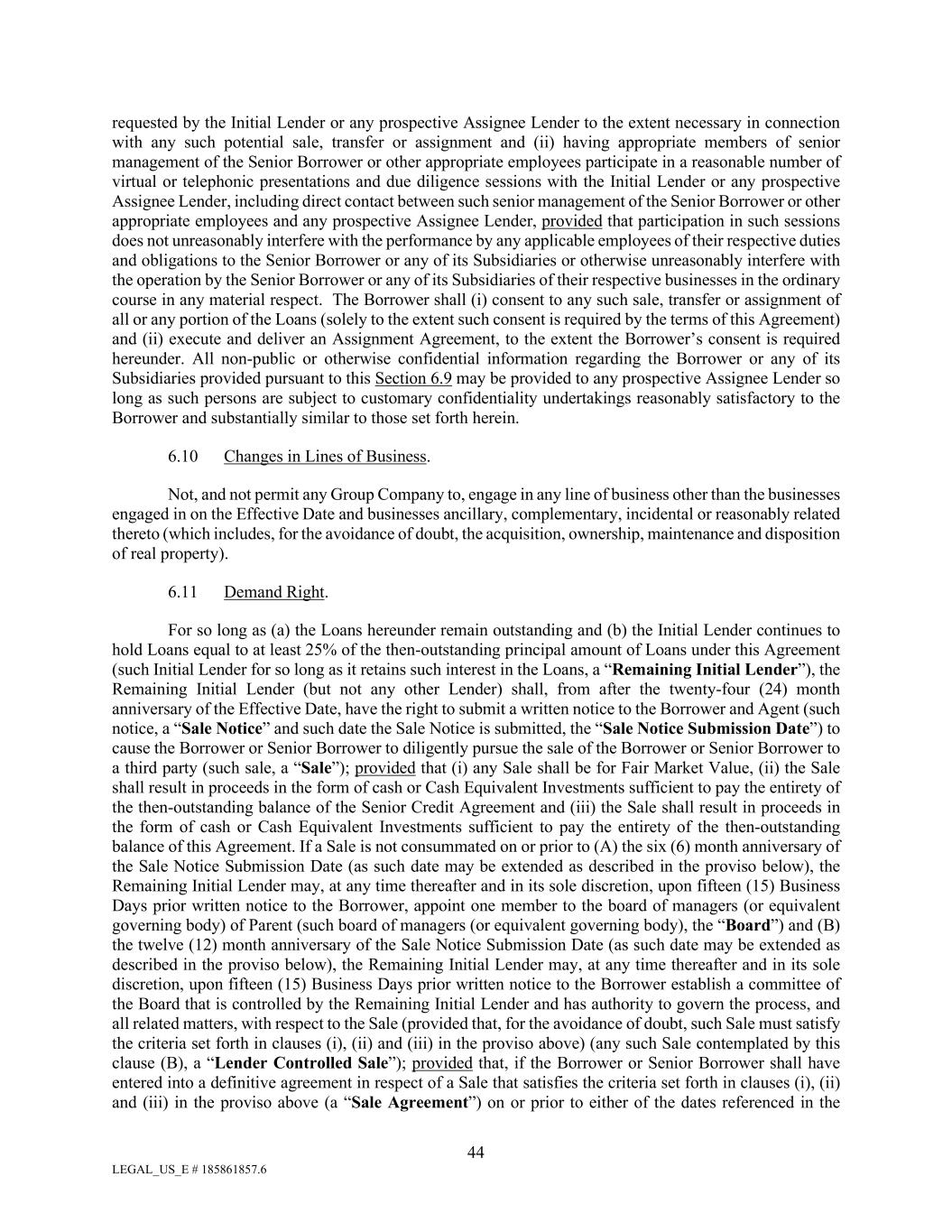 44 LEGAL_US_E # 185861857.6 requested by the Initial Lender or any prospective Assignee Lender to the extent necessary in connection with any such potential sale, transfer or assignment and (ii) having appropriate members of senior management of the Senior Borrower or other appropriate employees participate in a reasonable number of virtual or telephonic presentations and due diligence sessions with the Initial Lender or any prospective Assignee Lender, including direct contact between such senior management of the Senior Borrower or other appropriate employees and any prospective Assignee Lender, provided that participation in such sessions does not unreasonably interfere with the performance by any applicable employees of their respective duties and obligations to the Senior Borrower or any of its Subsidiaries or otherwise unreasonably interfere with the operation by the Senior Borrower or any of its Subsidiaries of their respective businesses in the ordinary course in any material respect. The Borrower shall (i) consent to any such sale, transfer or assignment of all or any portion of the Loans (solely to the extent such consent is required by the terms of this Agreement) and (ii) execute and deliver an Assignment Agreement, to the extent the Borrower’s consent is required hereunder. All non-public or otherwise confidential information regarding the Borrower or any of its Subsidiaries provided pursuant to this Section 6.9 may be provided to any prospective Assignee Lender so long as such persons are subject to customary confidentiality undertakings reasonably satisfactory to the Borrower and substantially similar to those set forth herein. 6.10 Changes in Lines of Business. Not, and not permit any Group Company to, engage in any line of business other than the businesses engaged in on the Effective Date and businesses ancillary, complementary, incidental or reasonably related thereto (which includes, for the avoidance of doubt, the acquisition, ownership, maintenance and disposition of real property). 6.11 Demand Right. For so long as (a) the Loans hereunder remain outstanding and (b) the Initial Lender continues to hold Loans equal to at least 25% of the then-outstanding principal amount of Loans under this Agreement (such Initial Lender for so long as it retains such interest in the Loans, a “Remaining Initial Lender”), the Remaining Initial Lender (but not any other Lender) shall, from after the twenty-four (24) month anniversary of the Effective Date, have the right to submit a written notice to the Borrower and Agent (such notice, a “Sale Notice” and such date the Sale Notice is submitted, the “Sale Notice Submission Date”) to cause the Borrower or Senior Borrower to diligently pursue the sale of the Borrower or Senior Borrower to a third party (such sale, a “Sale”); provided that (i) any Sale shall be for Fair Market Value, (ii) the Sale shall result in proceeds in the form of cash or Cash Equivalent Investments sufficient to pay the entirety of the then-outstanding balance of the Senior Credit Agreement and (iii) the Sale shall result in proceeds in the form of cash or Cash Equivalent Investments sufficient to pay the entirety of the then-outstanding balance of this Agreement. If a Sale is not consummated on or prior to (A) the six (6) month anniversary of the Sale Notice Submission Date (as such date may be extended as described in the proviso below), the Remaining Initial Lender may, at any time thereafter and in its sole discretion, upon fifteen (15) Business Days prior written notice to the Borrower, appoint one member to the board of managers (or equivalent governing body) of Parent (such board of managers (or equivalent governing body), the “Board”) and (B) the twelve (12) month anniversary of the Sale Notice Submission Date (as such date may be extended as described in the proviso below), the Remaining Initial Lender may, at any time thereafter and in its sole discretion, upon fifteen (15) Business Days prior written notice to the Borrower establish a committee of the Board that is controlled by the Remaining Initial Lender and has authority to govern the process, and all related matters, with respect to the Sale (provided that, for the avoidance of doubt, such Sale must satisfy the criteria set forth in clauses (i), (ii) and (iii) in the proviso above) (any such Sale contemplated by this clause (B), a “Lender Controlled Sale”); provided that, if the Borrower or Senior Borrower shall have entered into a definitive agreement in respect of a Sale that satisfies the criteria set forth in clauses (i), (ii) and (iii) in the proviso above (a “Sale Agreement”) on or prior to either of the dates referenced in the