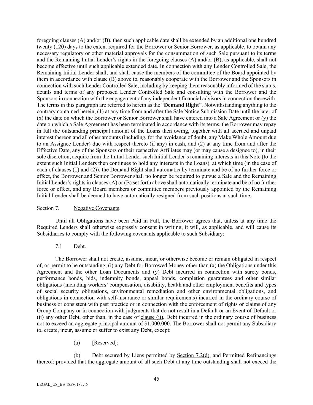 45 LEGAL_US_E # 185861857.6 foregoing clauses (A) and/or (B), then such applicable date shall be extended by an additional one hundred twenty (120) days to the extent required for the Borrower or Senior Borrower, as applicable, to obtain any necessary regulatory or other material approvals for the consummation of such Sale pursuant to its terms and the Remaining Initial Lender’s rights in the foregoing clauses (A) and/or (B), as applicable, shall not become effective until such applicable extended date. In connection with any Lender Controlled Sale, the Remaining Initial Lender shall, and shall cause the members of the committee of the Board appointed by them in accordance with clause (B) above to, reasonably cooperate with the Borrower and the Sponsors in connection with such Lender Controlled Sale, including by keeping them reasonably informed of the status, details and terms of any proposed Lender Controlled Sale and consulting with the Borrower and the Sponsors in connection with the engagement of any independent financial advisors in connection therewith. The terms in this paragraph are referred to herein as the “Demand Right”. Notwithstanding anything to the contrary contained herein, (1) at any time from and after the Sale Notice Submission Date until the later of (x) the date on which the Borrower or Senior Borrower shall have entered into a Sale Agreement or (y) the date on which a Sale Agreement has been terminated in accordance with its terms, the Borrower may repay in full the outstanding principal amount of the Loans then owing, together with all accrued and unpaid interest thereon and all other amounts (including, for the avoidance of doubt, any Make Whole Amount due to an Assignee Lender) due with respect thereto (if any) in cash, and (2) at any time from and after the Effective Date, any of the Sponsors or their respective Affiliates may (or may cause a designee to), in their sole discretion, acquire from the Initial Lender such Initial Lender’s remaining interests in this Note (to the extent such Initial Lenders then continues to hold any interests in the Loans), at which time (in the case of each of clauses (1) and (2)), the Demand Right shall automatically terminate and be of no further force or effect, the Borrower and Senior Borrower shall no longer be required to pursue a Sale and the Remaining Initial Lender’s rights in clauses (A) or (B) set forth above shall automatically terminate and be of no further force or effect, and any Board members or committee members previously appointed by the Remaining Initial Lender shall be deemed to have automatically resigned from such positions at such time. Section 7. Negative Covenants. Until all Obligations have been Paid in Full, the Borrower agrees that, unless at any time the Required Lenders shall otherwise expressly consent in writing, it will, as applicable, and will cause its Subsidiaries to comply with the following covenants applicable to such Subsidiary: 7.1 Debt. The Borrower shall not create, assume, incur, or otherwise become or remain obligated in respect of, or permit to be outstanding, (i) any Debt for Borrowed Money other than (x) the Obligations under this Agreement and the other Loan Documents and (y) Debt incurred in connection with surety bonds, performance bonds, bids, indemnity bonds, appeal bonds, completion guarantees and other similar obligations (including workers’ compensation, disability, health and other employment benefits and types of social security obligations, environmental remediation and other environmental obligations, and obligations in connection with self-insurance or similar requirements) incurred in the ordinary course of business or consistent with past practice or in connection with the enforcement of rights or claims of any Group Company or in connection with judgments that do not result in a Default or an Event of Default or (ii) any other Debt, other than, in the case of clause (ii), Debt incurred in the ordinary course of business not to exceed an aggregate principal amount of $1,000,000. The Borrower shall not permit any Subsidiary to, create, incur, assume or suffer to exist any Debt, except: (a) [Reserved]; (b) Debt secured by Liens permitted by Section 7.2(d), and Permitted Refinancings thereof; provided that the aggregate amount of all such Debt at any time outstanding shall not exceed the