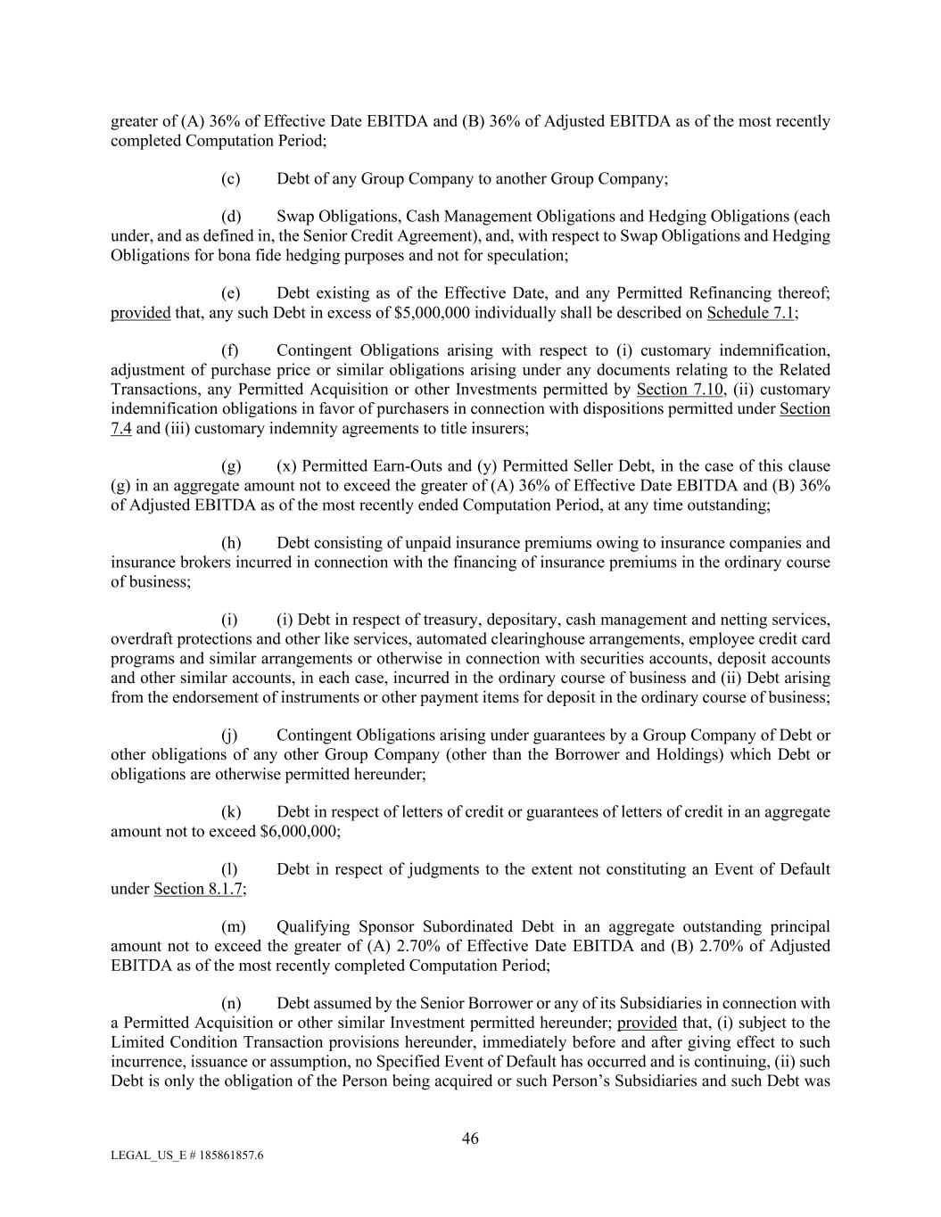 46 LEGAL_US_E # 185861857.6 greater of (A) 36% of Effective Date EBITDA and (B) 36% of Adjusted EBITDA as of the most recently completed Computation Period; (c) Debt of any Group Company to another Group Company; (d) Swap Obligations, Cash Management Obligations and Hedging Obligations (each under, and as defined in, the Senior Credit Agreement), and, with respect to Swap Obligations and Hedging Obligations for bona fide hedging purposes and not for speculation; (e) Debt existing as of the Effective Date, and any Permitted Refinancing thereof; provided that, any such Debt in excess of $5,000,000 individually shall be described on Schedule 7.1; (f) Contingent Obligations arising with respect to (i) customary indemnification, adjustment of purchase price or similar obligations arising under any documents relating to the Related Transactions, any Permitted Acquisition or other Investments permitted by Section 7.10, (ii) customary indemnification obligations in favor of purchasers in connection with dispositions permitted under Section 7.4 and (iii) customary indemnity agreements to title insurers; (g) (x) Permitted Earn-Outs and (y) Permitted Seller Debt, in the case of this clause (g) in an aggregate amount not to exceed the greater of (A) 36% of Effective Date EBITDA and (B) 36% of Adjusted EBITDA as of the most recently ended Computation Period, at any time outstanding; (h) Debt consisting of unpaid insurance premiums owing to insurance companies and insurance brokers incurred in connection with the financing of insurance premiums in the ordinary course of business; (i) (i) Debt in respect of treasury, depositary, cash management and netting services, overdraft protections and other like services, automated clearinghouse arrangements, employee credit card programs and similar arrangements or otherwise in connection with securities accounts, deposit accounts and other similar accounts, in each case, incurred in the ordinary course of business and (ii) Debt arising from the endorsement of instruments or other payment items for deposit in the ordinary course of business; (j) Contingent Obligations arising under guarantees by a Group Company of Debt or other obligations of any other Group Company (other than the Borrower and Holdings) which Debt or obligations are otherwise permitted hereunder; (k) Debt in respect of letters of credit or guarantees of letters of credit in an aggregate amount not to exceed $6,000,000; (l) Debt in respect of judgments to the extent not constituting an Event of Default under Section 8.1.7; (m) Qualifying Sponsor Subordinated Debt in an aggregate outstanding principal amount not to exceed the greater of (A) 2.70% of Effective Date EBITDA and (B) 2.70% of Adjusted EBITDA as of the most recently completed Computation Period; (n) Debt assumed by the Senior Borrower or any of its Subsidiaries in connection with a Permitted Acquisition or other similar Investment permitted hereunder; provided that, (i) subject to the Limited Condition Transaction provisions hereunder, immediately before and after giving effect to such incurrence, issuance or assumption, no Specified Event of Default has occurred and is continuing, (ii) such Debt is only the obligation of the Person being acquired or such Person’s Subsidiaries and such Debt was