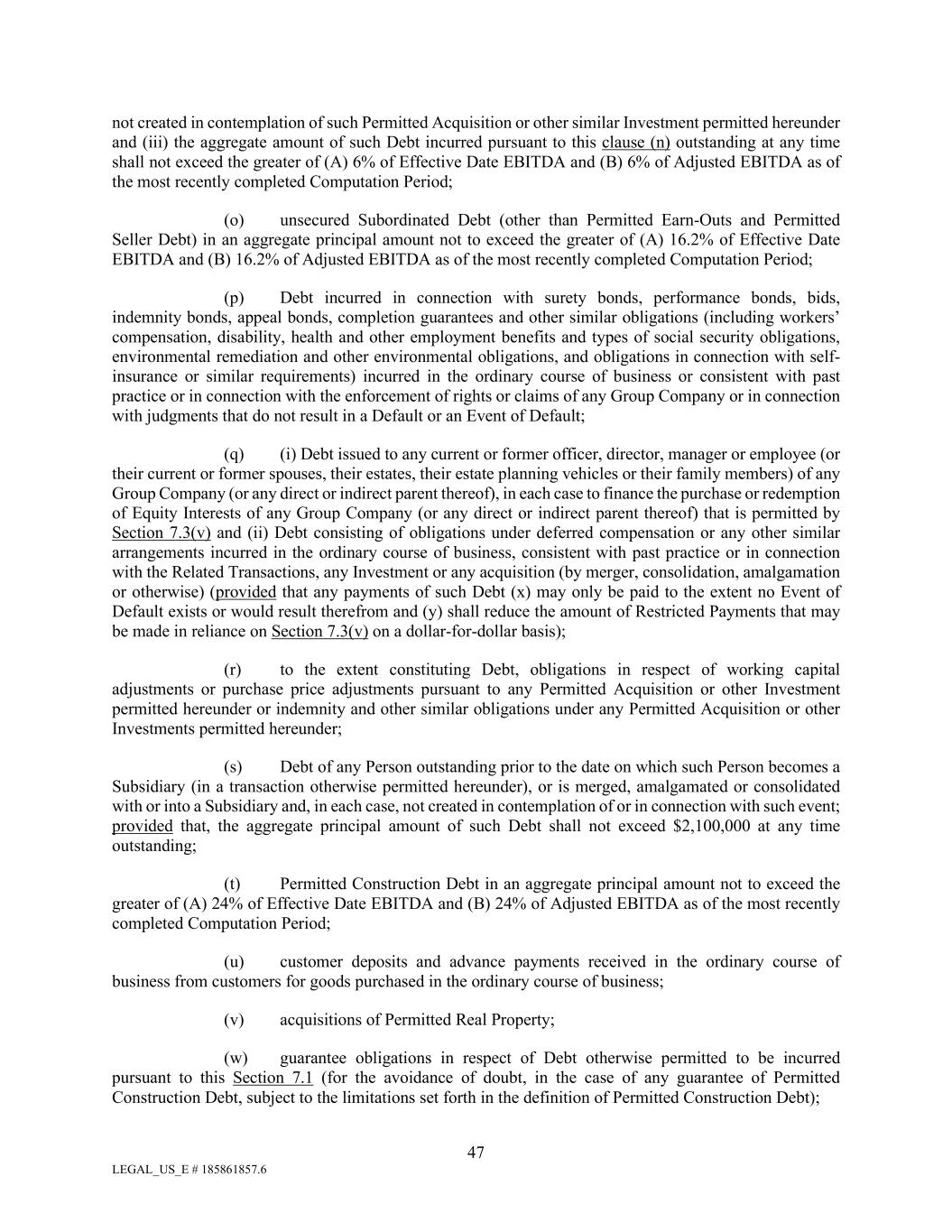 47 LEGAL_US_E # 185861857.6 not created in contemplation of such Permitted Acquisition or other similar Investment permitted hereunder and (iii) the aggregate amount of such Debt incurred pursuant to this clause (n) outstanding at any time shall not exceed the greater of (A) 6% of Effective Date EBITDA and (B) 6% of Adjusted EBITDA as of the most recently completed Computation Period; (o) unsecured Subordinated Debt (other than Permitted Earn-Outs and Permitted Seller Debt) in an aggregate principal amount not to exceed the greater of (A) 16.2% of Effective Date EBITDA and (B) 16.2% of Adjusted EBITDA as of the most recently completed Computation Period; (p) Debt incurred in connection with surety bonds, performance bonds, bids, indemnity bonds, appeal bonds, completion guarantees and other similar obligations (including workers’ compensation, disability, health and other employment benefits and types of social security obligations, environmental remediation and other environmental obligations, and obligations in connection with self- insurance or similar requirements) incurred in the ordinary course of business or consistent with past practice or in connection with the enforcement of rights or claims of any Group Company or in connection with judgments that do not result in a Default or an Event of Default; (q) (i) Debt issued to any current or former officer, director, manager or employee (or their current or former spouses, their estates, their estate planning vehicles or their family members) of any Group Company (or any direct or indirect parent thereof), in each case to finance the purchase or redemption of Equity Interests of any Group Company (or any direct or indirect parent thereof) that is permitted by Section 7.3(v) and (ii) Debt consisting of obligations under deferred compensation or any other similar arrangements incurred in the ordinary course of business, consistent with past practice or in connection with the Related Transactions, any Investment or any acquisition (by merger, consolidation, amalgamation or otherwise) (provided that any payments of such Debt (x) may only be paid to the extent no Event of Default exists or would result therefrom and (y) shall reduce the amount of Restricted Payments that may be made in reliance on Section 7.3(v) on a dollar-for-dollar basis); (r) to the extent constituting Debt, obligations in respect of working capital adjustments or purchase price adjustments pursuant to any Permitted Acquisition or other Investment permitted hereunder or indemnity and other similar obligations under any Permitted Acquisition or other Investments permitted hereunder; (s) Debt of any Person outstanding prior to the date on which such Person becomes a Subsidiary (in a transaction otherwise permitted hereunder), or is merged, amalgamated or consolidated with or into a Subsidiary and, in each case, not created in contemplation of or in connection with such event; provided that, the aggregate principal amount of such Debt shall not exceed $2,100,000 at any time outstanding; (t) Permitted Construction Debt in an aggregate principal amount not to exceed the greater of (A) 24% of Effective Date EBITDA and (B) 24% of Adjusted EBITDA as of the most recently completed Computation Period; (u) customer deposits and advance payments received in the ordinary course of business from customers for goods purchased in the ordinary course of business; (v) acquisitions of Permitted Real Property; (w) guarantee obligations in respect of Debt otherwise permitted to be incurred pursuant to this Section 7.1 (for the avoidance of doubt, in the case of any guarantee of Permitted Construction Debt, subject to the limitations set forth in the definition of Permitted Construction Debt);