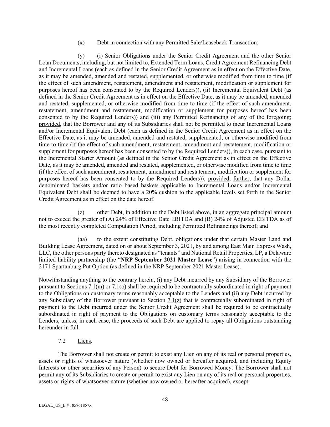 48 LEGAL_US_E # 185861857.6 (x) Debt in connection with any Permitted Sale/Leaseback Transaction; (y) (i) Senior Obligations under the Senior Credit Agreement and the other Senior Loan Documents, including, but not limited to, Extended Term Loans, Credit Agreement Refinancing Debt and Incremental Loans (each as defined in the Senior Credit Agreement as in effect on the Effective Date, as it may be amended, amended and restated, supplemented, or otherwise modified from time to time (if the effect of such amendment, restatement, amendment and restatement, modification or supplement for purposes hereof has been consented to by the Required Lenders)), (ii) Incremental Equivalent Debt (as defined in the Senior Credit Agreement as in effect on the Effective Date, as it may be amended, amended and restated, supplemented, or otherwise modified from time to time (if the effect of such amendment, restatement, amendment and restatement, modification or supplement for purposes hereof has been consented to by the Required Lenders)) and (iii) any Permitted Refinancing of any of the foregoing; provided, that the Borrower and any of its Subsidiaries shall not be permitted to incur Incremental Loans and/or Incremental Equivalent Debt (each as defined in the Senior Credit Agreement as in effect on the Effective Date, as it may be amended, amended and restated, supplemented, or otherwise modified from time to time (if the effect of such amendment, restatement, amendment and restatement, modification or supplement for purposes hereof has been consented to by the Required Lenders)), in each case, pursuant to the Incremental Starter Amount (as defined in the Senior Credit Agreement as in effect on the Effective Date, as it may be amended, amended and restated, supplemented, or otherwise modified from time to time (if the effect of such amendment, restatement, amendment and restatement, modification or supplement for purposes hereof has been consented to by the Required Lenders)); provided, further, that any Dollar denominated baskets and/or ratio based baskets applicable to Incremental Loans and/or Incremental Equivalent Debt shall be deemed to have a 20% cushion to the applicable levels set forth in the Senior Credit Agreement as in effect on the date hereof. (z) other Debt, in addition to the Debt listed above, in an aggregate principal amount not to exceed the greater of (A) 24% of Effective Date EBITDA and (B) 24% of Adjusted EBITDA as of the most recently completed Computation Period, including Permitted Refinancings thereof; and (aa) to the extent constituting Debt, obligations under that certain Master Land and Building Lease Agreement, dated on or about September 3, 2021, by and among East Main Express Wash, LLC, the other persons party thereto designated as “tenants” and National Retail Properties, LP, a Delaware limited liability partnership (the “NRP September 2021 Master Lease”) arising in connection with the 2171 Spartanburg Put Option (as defined in the NRP September 2021 Master Lease). Notwithstanding anything to the contrary herein, (i) any Debt incurred by any Subsidiary of the Borrower pursuant to Sections 7.1(m) or 7.1(o) shall be required to be contractually subordinated in right of payment to the Obligations on customary terms reasonably acceptable to the Lenders and (ii) any Debt incurred by any Subsidiary of the Borrower pursuant to Section 7.1(z) that is contractually subordinated in right of payment to the Debt incurred under the Senior Credit Agreement shall be required to be contractually subordinated in right of payment to the Obligations on customary terms reasonably acceptable to the Lenders, unless, in each case, the proceeds of such Debt are applied to repay all Obligations outstanding hereunder in full. 7.2 Liens. The Borrower shall not create or permit to exist any Lien on any of its real or personal properties, assets or rights of whatsoever nature (whether now owned or hereafter acquired, and including Equity Interests or other securities of any Person) to secure Debt for Borrowed Money. The Borrower shall not permit any of its Subsidiaries to create or permit to exist any Lien on any of its real or personal properties, assets or rights of whatsoever nature (whether now owned or hereafter acquired), except:
