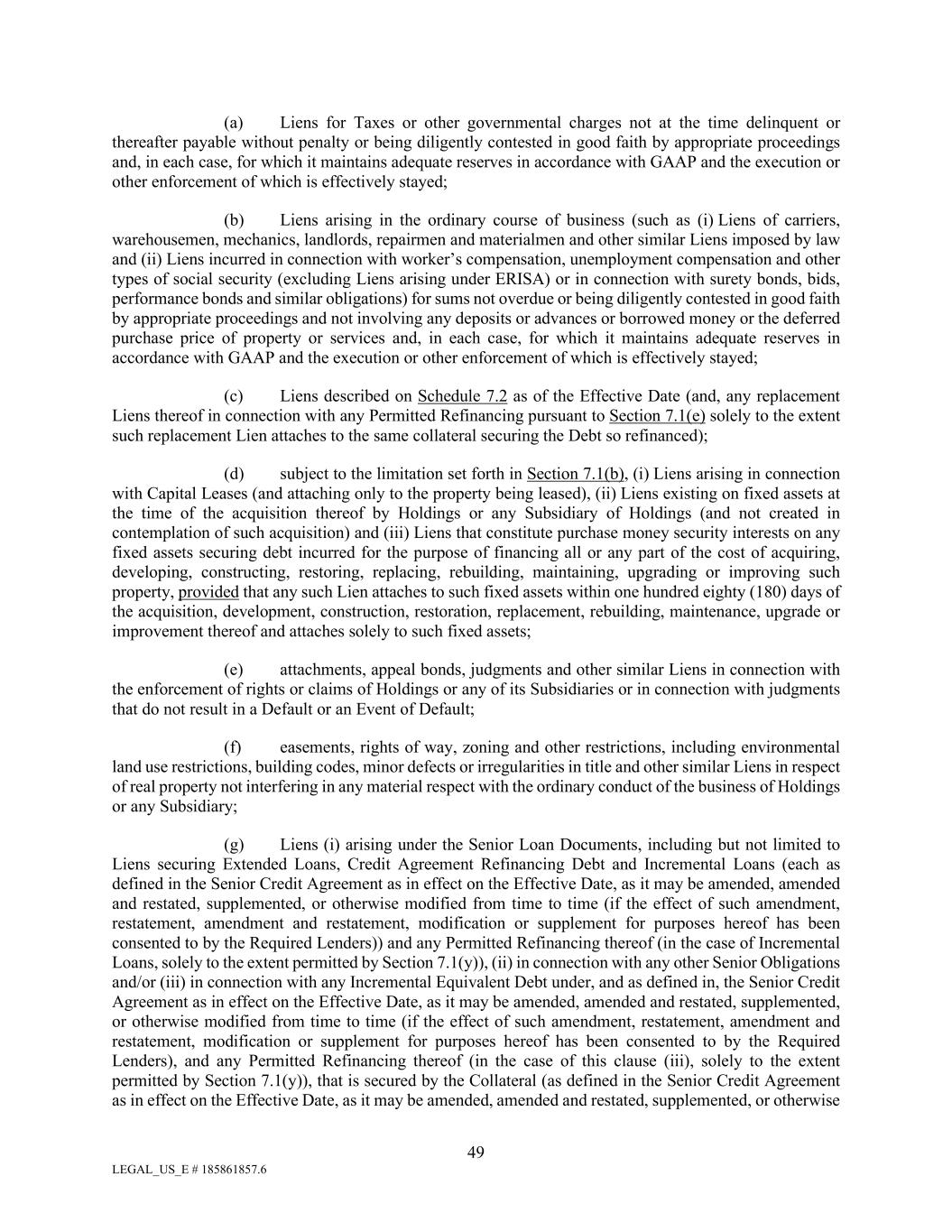 49 LEGAL_US_E # 185861857.6 (a) Liens for Taxes or other governmental charges not at the time delinquent or thereafter payable without penalty or being diligently contested in good faith by appropriate proceedings and, in each case, for which it maintains adequate reserves in accordance with GAAP and the execution or other enforcement of which is effectively stayed; (b) Liens arising in the ordinary course of business (such as (i) Liens of carriers, warehousemen, mechanics, landlords, repairmen and materialmen and other similar Liens imposed by law and (ii) Liens incurred in connection with worker’s compensation, unemployment compensation and other types of social security (excluding Liens arising under ERISA) or in connection with surety bonds, bids, performance bonds and similar obligations) for sums not overdue or being diligently contested in good faith by appropriate proceedings and not involving any deposits or advances or borrowed money or the deferred purchase price of property or services and, in each case, for which it maintains adequate reserves in accordance with GAAP and the execution or other enforcement of which is effectively stayed; (c) Liens described on Schedule 7.2 as of the Effective Date (and, any replacement Liens thereof in connection with any Permitted Refinancing pursuant to Section 7.1(e) solely to the extent such replacement Lien attaches to the same collateral securing the Debt so refinanced); (d) subject to the limitation set forth in Section 7.1(b), (i) Liens arising in connection with Capital Leases (and attaching only to the property being leased), (ii) Liens existing on fixed assets at the time of the acquisition thereof by Holdings or any Subsidiary of Holdings (and not created in contemplation of such acquisition) and (iii) Liens that constitute purchase money security interests on any fixed assets securing debt incurred for the purpose of financing all or any part of the cost of acquiring, developing, constructing, restoring, replacing, rebuilding, maintaining, upgrading or improving such property, provided that any such Lien attaches to such fixed assets within one hundred eighty (180) days of the acquisition, development, construction, restoration, replacement, rebuilding, maintenance, upgrade or improvement thereof and attaches solely to such fixed assets; (e) attachments, appeal bonds, judgments and other similar Liens in connection with the enforcement of rights or claims of Holdings or any of its Subsidiaries or in connection with judgments that do not result in a Default or an Event of Default; (f) easements, rights of way, zoning and other restrictions, including environmental land use restrictions, building codes, minor defects or irregularities in title and other similar Liens in respect of real property not interfering in any material respect with the ordinary conduct of the business of Holdings or any Subsidiary; (g) Liens (i) arising under the Senior Loan Documents, including but not limited to Liens securing Extended Loans, Credit Agreement Refinancing Debt and Incremental Loans (each as defined in the Senior Credit Agreement as in effect on the Effective Date, as it may be amended, amended and restated, supplemented, or otherwise modified from time to time (if the effect of such amendment, restatement, amendment and restatement, modification or supplement for purposes hereof has been consented to by the Required Lenders)) and any Permitted Refinancing thereof (in the case of Incremental Loans, solely to the extent permitted by Section 7.1(y)), (ii) in connection with any other Senior Obligations and/or (iii) in connection with any Incremental Equivalent Debt under, and as defined in, the Senior Credit Agreement as in effect on the Effective Date, as it may be amended, amended and restated, supplemented, or otherwise modified from time to time (if the effect of such amendment, restatement, amendment and restatement, modification or supplement for purposes hereof has been consented to by the Required Lenders), and any Permitted Refinancing thereof (in the case of this clause (iii), solely to the extent permitted by Section 7.1(y)), that is secured by the Collateral (as defined in the Senior Credit Agreement as in effect on the Effective Date, as it may be amended, amended and restated, supplemented, or otherwise