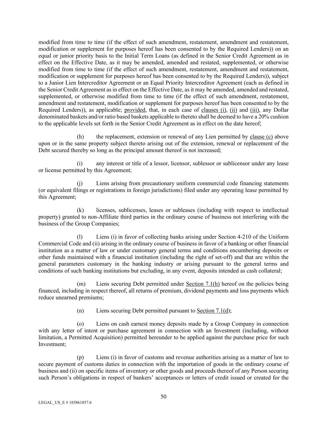 50 LEGAL_US_E # 185861857.6 modified from time to time (if the effect of such amendment, restatement, amendment and restatement, modification or supplement for purposes hereof has been consented to by the Required Lenders)) on an equal or junior priority basis to the Initial Term Loans (as defined in the Senior Credit Agreement as in effect on the Effective Date, as it may be amended, amended and restated, supplemented, or otherwise modified from time to time (if the effect of such amendment, restatement, amendment and restatement, modification or supplement for purposes hereof has been consented to by the Required Lenders)), subject to a Junior Lien Intercreditor Agreement or an Equal Priority Intercreditor Agreement (each as defined in the Senior Credit Agreement as in effect on the Effective Date, as it may be amended, amended and restated, supplemented, or otherwise modified from time to time (if the effect of such amendment, restatement, amendment and restatement, modification or supplement for purposes hereof has been consented to by the Required Lenders)), as applicable; provided, that, in each case of clauses (i), (ii) and (iii), any Dollar denominated baskets and/or ratio based baskets applicable to thereto shall be deemed to have a 20% cushion to the applicable levels set forth in the Senior Credit Agreement as in effect on the date hereof; (h) the replacement, extension or renewal of any Lien permitted by clause (c) above upon or in the same property subject thereto arising out of the extension, renewal or replacement of the Debt secured thereby so long as the principal amount thereof is not increased; (i) any interest or title of a lessor, licensor, sublessor or sublicensor under any lease or license permitted by this Agreement; (j) Liens arising from precautionary uniform commercial code financing statements (or equivalent filings or registrations in foreign jurisdictions) filed under any operating lease permitted by this Agreement; (k) licenses, sublicenses, leases or subleases (including with respect to intellectual property) granted to non-Affiliate third parties in the ordinary course of business not interfering with the business of the Group Companies; (l) Liens (i) in favor of collecting banks arising under Section 4-210 of the Uniform Commercial Code and (ii) arising in the ordinary course of business in favor of a banking or other financial institution as a matter of law or under customary general terms and conditions encumbering deposits or other funds maintained with a financial institution (including the right of set-off) and that are within the general parameters customary in the banking industry or arising pursuant to the general terms and conditions of such banking institutions but excluding, in any event, deposits intended as cash collateral; (m) Liens securing Debt permitted under Section 7.1(h) hereof on the policies being financed, including in respect thereof, all returns of premium, dividend payments and loss payments which reduce unearned premiums; (n) Liens securing Debt permitted pursuant to Section 7.1(d); (o) Liens on cash earnest money deposits made by a Group Company in connection with any letter of intent or purchase agreement in connection with an Investment (including, without limitation, a Permitted Acquisition) permitted hereunder to be applied against the purchase price for such Investment; (p) Liens (i) in favor of customs and revenue authorities arising as a matter of law to secure payment of customs duties in connection with the importation of goods in the ordinary course of business and (ii) on specific items of inventory or other goods and proceeds thereof of any Person securing such Person’s obligations in respect of bankers’ acceptances or letters of credit issued or created for the