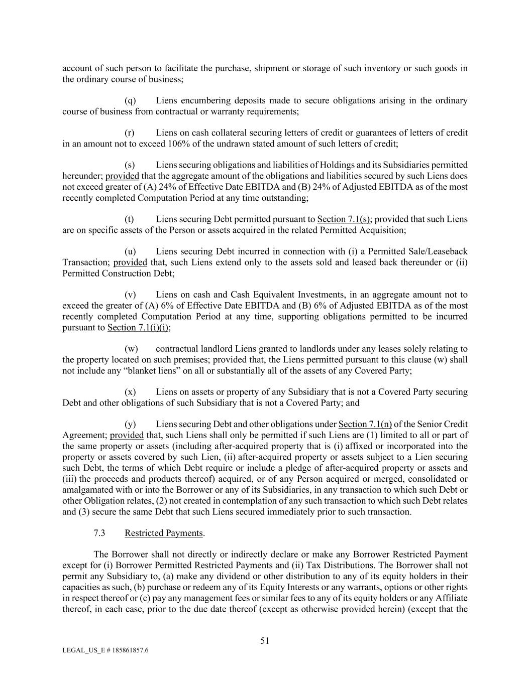 51 LEGAL_US_E # 185861857.6 account of such person to facilitate the purchase, shipment or storage of such inventory or such goods in the ordinary course of business; (q) Liens encumbering deposits made to secure obligations arising in the ordinary course of business from contractual or warranty requirements; (r) Liens on cash collateral securing letters of credit or guarantees of letters of credit in an amount not to exceed 106% of the undrawn stated amount of such letters of credit; (s) Liens securing obligations and liabilities of Holdings and its Subsidiaries permitted hereunder; provided that the aggregate amount of the obligations and liabilities secured by such Liens does not exceed greater of (A) 24% of Effective Date EBITDA and (B) 24% of Adjusted EBITDA as of the most recently completed Computation Period at any time outstanding; (t) Liens securing Debt permitted pursuant to Section 7.1(s); provided that such Liens are on specific assets of the Person or assets acquired in the related Permitted Acquisition; (u) Liens securing Debt incurred in connection with (i) a Permitted Sale/Leaseback Transaction; provided that, such Liens extend only to the assets sold and leased back thereunder or (ii) Permitted Construction Debt; (v) Liens on cash and Cash Equivalent Investments, in an aggregate amount not to exceed the greater of (A) 6% of Effective Date EBITDA and (B) 6% of Adjusted EBITDA as of the most recently completed Computation Period at any time, supporting obligations permitted to be incurred pursuant to Section 7.1(i)(i); (w) contractual landlord Liens granted to landlords under any leases solely relating to the property located on such premises; provided that, the Liens permitted pursuant to this clause (w) shall not include any “blanket liens” on all or substantially all of the assets of any Covered Party; (x) Liens on assets or property of any Subsidiary that is not a Covered Party securing Debt and other obligations of such Subsidiary that is not a Covered Party; and (y) Liens securing Debt and other obligations under Section 7.1(n) of the Senior Credit Agreement; provided that, such Liens shall only be permitted if such Liens are (1) limited to all or part of the same property or assets (including after-acquired property that is (i) affixed or incorporated into the property or assets covered by such Lien, (ii) after-acquired property or assets subject to a Lien securing such Debt, the terms of which Debt require or include a pledge of after-acquired property or assets and (iii) the proceeds and products thereof) acquired, or of any Person acquired or merged, consolidated or amalgamated with or into the Borrower or any of its Subsidiaries, in any transaction to which such Debt or other Obligation relates, (2) not created in contemplation of any such transaction to which such Debt relates and (3) secure the same Debt that such Liens secured immediately prior to such transaction. 7.3 Restricted Payments. The Borrower shall not directly or indirectly declare or make any Borrower Restricted Payment except for (i) Borrower Permitted Restricted Payments and (ii) Tax Distributions. The Borrower shall not permit any Subsidiary to, (a) make any dividend or other distribution to any of its equity holders in their capacities as such, (b) purchase or redeem any of its Equity Interests or any warrants, options or other rights in respect thereof or (c) pay any management fees or similar fees to any of its equity holders or any Affiliate thereof, in each case, prior to the due date thereof (except as otherwise provided herein) (except that the