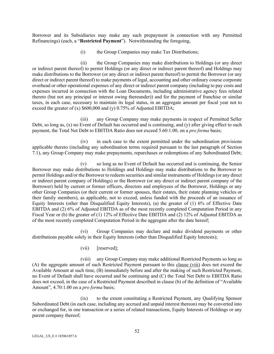52 LEGAL_US_E # 185861857.6 Borrower and its Subsidiaries may make any such prepayment in connection with any Permitted Refinancings) (each, a “Restricted Payment”). Notwithstanding the foregoing, (i) the Group Companies may make Tax Distributions; (ii) the Group Companies may make distributions to Holdings (or any direct or indirect parent thereof) to permit Holdings (or any direct or indirect parent thereof) and Holdings may make distributions to the Borrower (or any direct or indirect parent thereof) to permit the Borrower (or any direct or indirect parent thereof) to make payments of legal, accounting and other ordinary course corporate overhead or other operational expenses of any direct or indirect parent company (including to pay costs and expenses incurred in connection with the Loan Documents, including administrative agency fees related thereto (but not any principal or interest owing thereunder)) and for the payment of franchise or similar taxes, in each case, necessary to maintain its legal status, in an aggregate amount per fiscal year not to exceed the greater of (x) $600,000 and (y) 0.75% of Adjusted EBITDA; (iii) any Group Company may make payments in respect of Permitted Seller Debt, so long as, (x) no Event of Default has occurred and is continuing, and (y) after giving effect to such payment, the Total Net Debt to EBITDA Ratio does not exceed 5.60:1.00, on a pro forma basis; (iv) in each case to the extent permitted under the subordination provisions applicable thereto (including any subordination terms required pursuant to the last paragraph of Section 7.1), any Group Company may make prepayments, repurchases or redemptions of any Subordinated Debt; (v) so long as no Event of Default has occurred and is continuing, the Senior Borrower may make distributions to Holdings and Holdings may make distributions to the Borrower to permit Holdings and/or the Borrower to redeem securities and similar instruments of Holdings (or any direct or indirect parent company of Holdings) or the Borrower (or any direct or indirect parent company of the Borrower) held by current or former officers, directors and employees of the Borrower, Holdings or any other Group Companies (or their current or former spouses, their estates, their estate planning vehicles or their family members), as applicable, not to exceed, unless funded with the proceeds of an issuance of Equity Interests (other than Disqualified Equity Interests), (a) the greater of (1) 6% of Effective Date EBITDA and (2) 6% of Adjusted EBITDA as of the most recently completed Computation Period in any Fiscal Year or (b) the greater of (1) 12% of Effective Date EBITDA and (2) 12% of Adjusted EBITDA as of the most recently completed Computation Period in the aggregate after the date hereof; (vi) Group Companies may declare and make dividend payments or other distributions payable solely in their Equity Interests (other than Disqualified Equity Interests); (vii) [reserved]; (viii) any Group Company may make additional Restricted Payments so long as (A) the aggregate amount of such Restricted Payment pursuant to this clause (viii) does not exceed the Available Amount at such time, (B) immediately before and after the making of such Restricted Payment, no Event of Default shall have occurred and be continuing and (C) the Total Net Debt to EBITDA Ratio does not exceed, in the case of a Restricted Payment described in clause (b) of the definition of “Available Amount”, 4.70:1.00 on a pro forma basis; (ix) to the extent constituting a Restricted Payment, any Qualifying Sponsor Subordinated Debt (in each case, including any accrued and unpaid interest thereon) may be converted into or exchanged for, in one transaction or a series of related transactions, Equity Interests of Holdings or any parent company thereof;