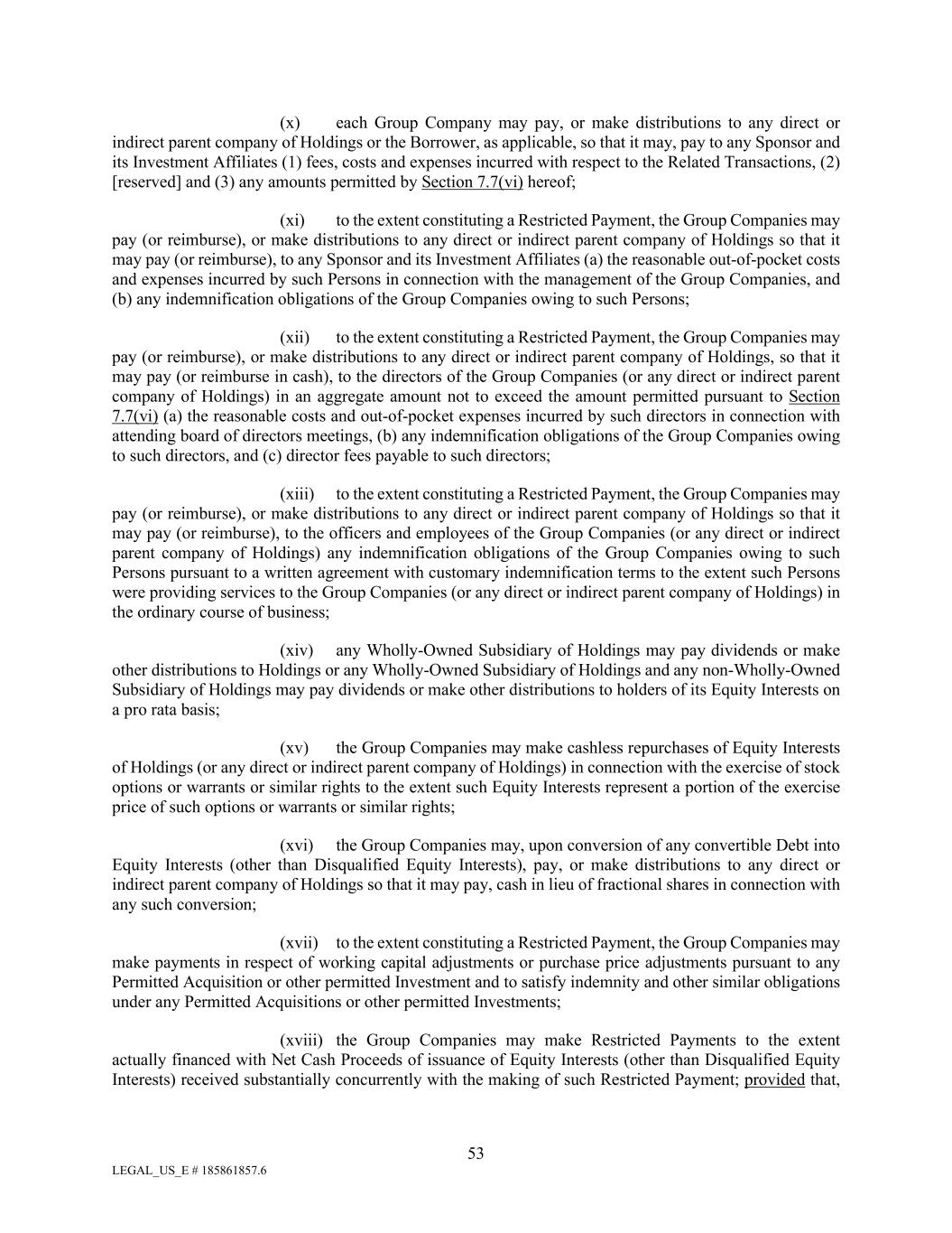 53 LEGAL_US_E # 185861857.6 (x) each Group Company may pay, or make distributions to any direct or indirect parent company of Holdings or the Borrower, as applicable, so that it may, pay to any Sponsor and its Investment Affiliates (1) fees, costs and expenses incurred with respect to the Related Transactions, (2) [reserved] and (3) any amounts permitted by Section 7.7(vi) hereof; (xi) to the extent constituting a Restricted Payment, the Group Companies may pay (or reimburse), or make distributions to any direct or indirect parent company of Holdings so that it may pay (or reimburse), to any Sponsor and its Investment Affiliates (a) the reasonable out-of-pocket costs and expenses incurred by such Persons in connection with the management of the Group Companies, and (b) any indemnification obligations of the Group Companies owing to such Persons; (xii) to the extent constituting a Restricted Payment, the Group Companies may pay (or reimburse), or make distributions to any direct or indirect parent company of Holdings, so that it may pay (or reimburse in cash), to the directors of the Group Companies (or any direct or indirect parent company of Holdings) in an aggregate amount not to exceed the amount permitted pursuant to Section 7.7(vi) (a) the reasonable costs and out-of-pocket expenses incurred by such directors in connection with attending board of directors meetings, (b) any indemnification obligations of the Group Companies owing to such directors, and (c) director fees payable to such directors; (xiii) to the extent constituting a Restricted Payment, the Group Companies may pay (or reimburse), or make distributions to any direct or indirect parent company of Holdings so that it may pay (or reimburse), to the officers and employees of the Group Companies (or any direct or indirect parent company of Holdings) any indemnification obligations of the Group Companies owing to such Persons pursuant to a written agreement with customary indemnification terms to the extent such Persons were providing services to the Group Companies (or any direct or indirect parent company of Holdings) in the ordinary course of business; (xiv) any Wholly-Owned Subsidiary of Holdings may pay dividends or make other distributions to Holdings or any Wholly-Owned Subsidiary of Holdings and any non-Wholly-Owned Subsidiary of Holdings may pay dividends or make other distributions to holders of its Equity Interests on a pro rata basis; (xv) the Group Companies may make cashless repurchases of Equity Interests of Holdings (or any direct or indirect parent company of Holdings) in connection with the exercise of stock options or warrants or similar rights to the extent such Equity Interests represent a portion of the exercise price of such options or warrants or similar rights; (xvi) the Group Companies may, upon conversion of any convertible Debt into Equity Interests (other than Disqualified Equity Interests), pay, or make distributions to any direct or indirect parent company of Holdings so that it may pay, cash in lieu of fractional shares in connection with any such conversion; (xvii) to the extent constituting a Restricted Payment, the Group Companies may make payments in respect of working capital adjustments or purchase price adjustments pursuant to any Permitted Acquisition or other permitted Investment and to satisfy indemnity and other similar obligations under any Permitted Acquisitions or other permitted Investments; (xviii) the Group Companies may make Restricted Payments to the extent actually financed with Net Cash Proceeds of issuance of Equity Interests (other than Disqualified Equity Interests) received substantially concurrently with the making of such Restricted Payment; provided that,