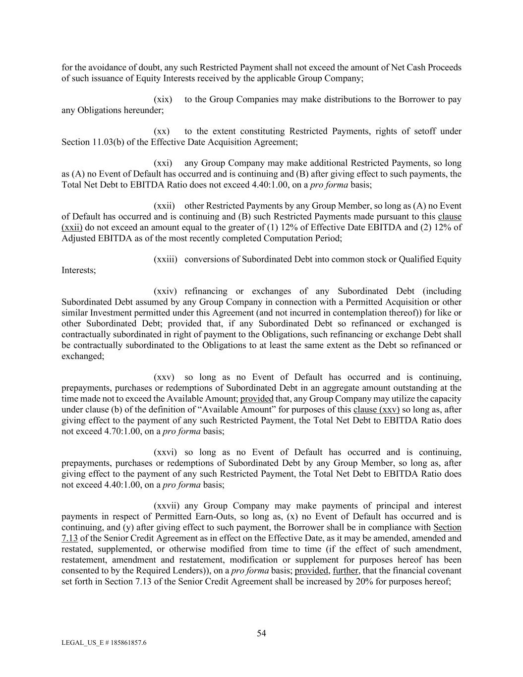 54 LEGAL_US_E # 185861857.6 for the avoidance of doubt, any such Restricted Payment shall not exceed the amount of Net Cash Proceeds of such issuance of Equity Interests received by the applicable Group Company; (xix) to the Group Companies may make distributions to the Borrower to pay any Obligations hereunder; (xx) to the extent constituting Restricted Payments, rights of setoff under Section 11.03(b) of the Effective Date Acquisition Agreement; (xxi) any Group Company may make additional Restricted Payments, so long as (A) no Event of Default has occurred and is continuing and (B) after giving effect to such payments, the Total Net Debt to EBITDA Ratio does not exceed 4.40:1.00, on a pro forma basis; (xxii) other Restricted Payments by any Group Member, so long as (A) no Event of Default has occurred and is continuing and (B) such Restricted Payments made pursuant to this clause (xxii) do not exceed an amount equal to the greater of (1) 12% of Effective Date EBITDA and (2) 12% of Adjusted EBITDA as of the most recently completed Computation Period; (xxiii) conversions of Subordinated Debt into common stock or Qualified Equity Interests; (xxiv) refinancing or exchanges of any Subordinated Debt (including Subordinated Debt assumed by any Group Company in connection with a Permitted Acquisition or other similar Investment permitted under this Agreement (and not incurred in contemplation thereof)) for like or other Subordinated Debt; provided that, if any Subordinated Debt so refinanced or exchanged is contractually subordinated in right of payment to the Obligations, such refinancing or exchange Debt shall be contractually subordinated to the Obligations to at least the same extent as the Debt so refinanced or exchanged; (xxv) so long as no Event of Default has occurred and is continuing, prepayments, purchases or redemptions of Subordinated Debt in an aggregate amount outstanding at the time made not to exceed the Available Amount; provided that, any Group Company may utilize the capacity under clause (b) of the definition of “Available Amount” for purposes of this clause (xxv) so long as, after giving effect to the payment of any such Restricted Payment, the Total Net Debt to EBITDA Ratio does not exceed 4.70:1.00, on a pro forma basis; (xxvi) so long as no Event of Default has occurred and is continuing, prepayments, purchases or redemptions of Subordinated Debt by any Group Member, so long as, after giving effect to the payment of any such Restricted Payment, the Total Net Debt to EBITDA Ratio does not exceed 4.40:1.00, on a pro forma basis; (xxvii) any Group Company may make payments of principal and interest payments in respect of Permitted Earn-Outs, so long as, (x) no Event of Default has occurred and is continuing, and (y) after giving effect to such payment, the Borrower shall be in compliance with Section 7.13 of the Senior Credit Agreement as in effect on the Effective Date, as it may be amended, amended and restated, supplemented, or otherwise modified from time to time (if the effect of such amendment, restatement, amendment and restatement, modification or supplement for purposes hereof has been consented to by the Required Lenders)), on a pro forma basis; provided, further, that the financial covenant set forth in Section 7.13 of the Senior Credit Agreement shall be increased by 20% for purposes hereof;
