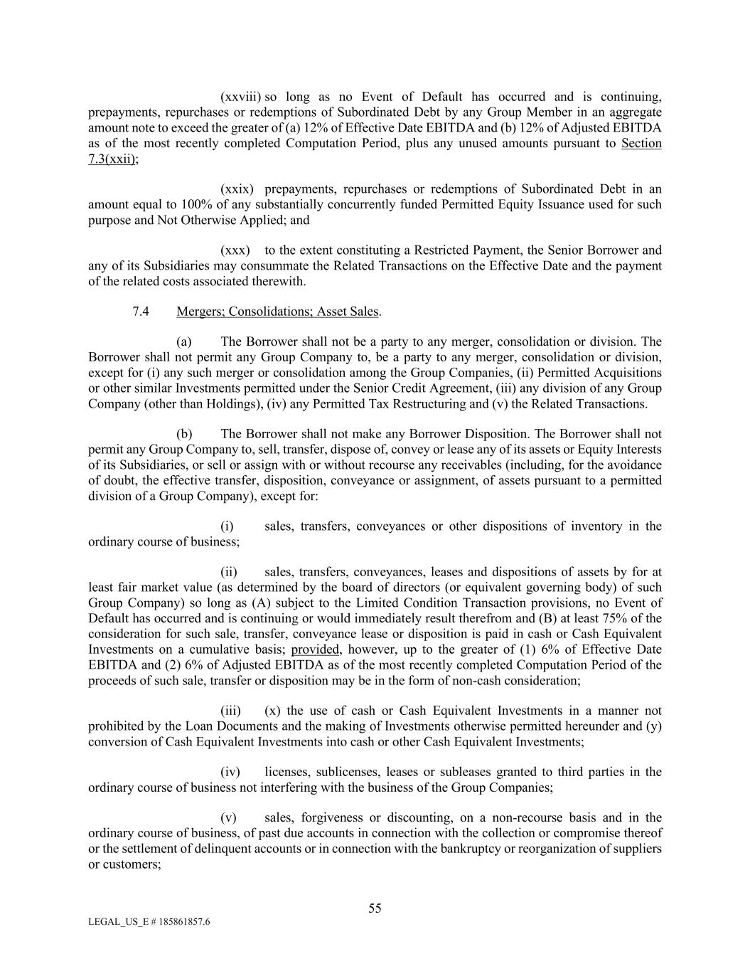 55 LEGAL_US_E # 185861857.6 (xxviii) so long as no Event of Default has occurred and is continuing, prepayments, repurchases or redemptions of Subordinated Debt by any Group Member in an aggregate amount note to exceed the greater of (a) 12% of Effective Date EBITDA and (b) 12% of Adjusted EBITDA as of the most recently completed Computation Period, plus any unused amounts pursuant to Section 7.3(xxii); (xxix) prepayments, repurchases or redemptions of Subordinated Debt in an amount equal to 100% of any substantially concurrently funded Permitted Equity Issuance used for such purpose and Not Otherwise Applied; and (xxx) to the extent constituting a Restricted Payment, the Senior Borrower and any of its Subsidiaries may consummate the Related Transactions on the Effective Date and the payment of the related costs associated therewith. 7.4 Mergers; Consolidations; Asset Sales. (a) The Borrower shall not be a party to any merger, consolidation or division. The Borrower shall not permit any Group Company to, be a party to any merger, consolidation or division, except for (i) any such merger or consolidation among the Group Companies, (ii) Permitted Acquisitions or other similar Investments permitted under the Senior Credit Agreement, (iii) any division of any Group Company (other than Holdings), (iv) any Permitted Tax Restructuring and (v) the Related Transactions. (b) The Borrower shall not make any Borrower Disposition. The Borrower shall not permit any Group Company to, sell, transfer, dispose of, convey or lease any of its assets or Equity Interests of its Subsidiaries, or sell or assign with or without recourse any receivables (including, for the avoidance of doubt, the effective transfer, disposition, conveyance or assignment, of assets pursuant to a permitted division of a Group Company), except for: (i) sales, transfers, conveyances or other dispositions of inventory in the ordinary course of business; (ii) sales, transfers, conveyances, leases and dispositions of assets by for at least fair market value (as determined by the board of directors (or equivalent governing body) of such Group Company) so long as (A) subject to the Limited Condition Transaction provisions, no Event of Default has occurred and is continuing or would immediately result therefrom and (B) at least 75% of the consideration for such sale, transfer, conveyance lease or disposition is paid in cash or Cash Equivalent Investments on a cumulative basis; provided, however, up to the greater of (1) 6% of Effective Date EBITDA and (2) 6% of Adjusted EBITDA as of the most recently completed Computation Period of the proceeds of such sale, transfer or disposition may be in the form of non-cash consideration; (iii) (x) the use of cash or Cash Equivalent Investments in a manner not prohibited by the Loan Documents and the making of Investments otherwise permitted hereunder and (y) conversion of Cash Equivalent Investments into cash or other Cash Equivalent Investments; (iv) licenses, sublicenses, leases or subleases granted to third parties in the ordinary course of business not interfering with the business of the Group Companies; (v) sales, forgiveness or discounting, on a non-recourse basis and in the ordinary course of business, of past due accounts in connection with the collection or compromise thereof or the settlement of delinquent accounts or in connection with the bankruptcy or reorganization of suppliers or customers;