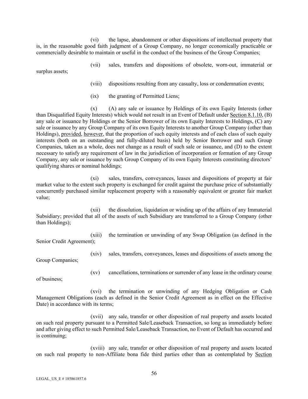 56 LEGAL_US_E # 185861857.6 (vi) the lapse, abandonment or other dispositions of intellectual property that is, in the reasonable good faith judgment of a Group Company, no longer economically practicable or commercially desirable to maintain or useful in the conduct of the business of the Group Companies; (vii) sales, transfers and dispositions of obsolete, worn-out, immaterial or surplus assets; (viii) dispositions resulting from any casualty, loss or condemnation events; (ix) the granting of Permitted Liens; (x) (A) any sale or issuance by Holdings of its own Equity Interests (other than Disqualified Equity Interests) which would not result in an Event of Default under Section 8.1.10, (B) any sale or issuance by Holdings or the Senior Borrower of its own Equity Interests to Holdings, (C) any sale or issuance by any Group Company of its own Equity Interests to another Group Company (other than Holdings), provided, however, that the proportion of such equity interests and of each class of such equity interests (both on an outstanding and fully-diluted basis) held by Senior Borrower and such Group Companies, taken as a whole, does not change as a result of such sale or issuance, and (D) to the extent necessary to satisfy any requirement of law in the jurisdiction of incorporation or formation of any Group Company, any sale or issuance by such Group Company of its own Equity Interests constituting directors’ qualifying shares or nominal holdings; (xi) sales, transfers, conveyances, leases and dispositions of property at fair market value to the extent such property is exchanged for credit against the purchase price of substantially concurrently purchased similar replacement property with a reasonably equivalent or greater fair market value; (xii) the dissolution, liquidation or winding up of the affairs of any Immaterial Subsidiary; provided that all of the assets of such Subsidiary are transferred to a Group Company (other than Holdings); (xiii) the termination or unwinding of any Swap Obligation (as defined in the Senior Credit Agreement); (xiv) sales, transfers, conveyances, leases and dispositions of assets among the Group Companies; (xv) cancellations, terminations or surrender of any lease in the ordinary course of business; (xvi) the termination or unwinding of any Hedging Obligation or Cash Management Obligations (each as defined in the Senior Credit Agreement as in effect on the Effective Date) in accordance with its terms; (xvii) any sale, transfer or other disposition of real property and assets located on such real property pursuant to a Permitted Sale/Leaseback Transaction, so long as immediately before and after giving effect to such Permitted Sale/Leaseback Transaction, no Event of Default has occurred and is continuing; (xviii) any sale, transfer or other disposition of real property and assets located on such real property to non-Affiliate bona fide third parties other than as contemplated by Section