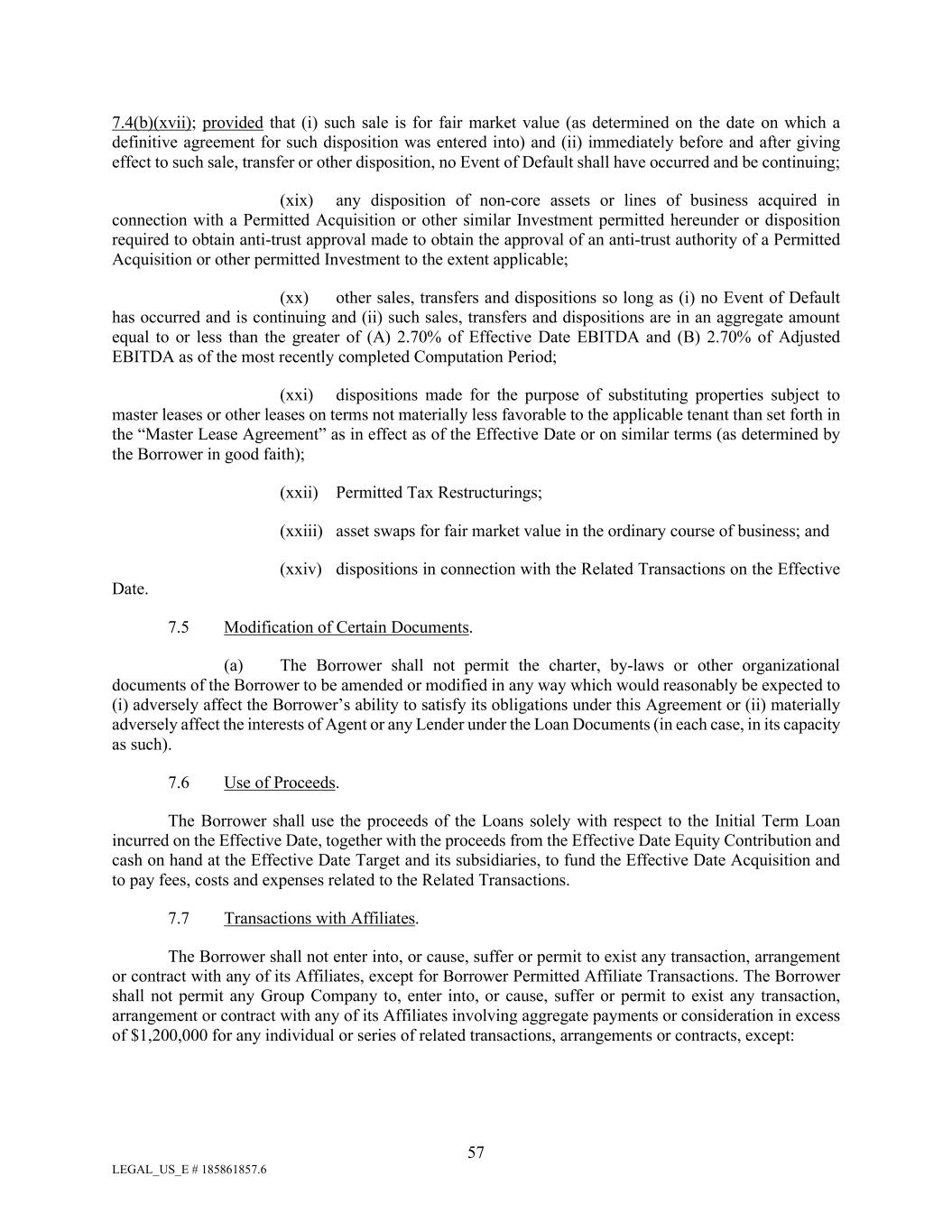57 LEGAL_US_E # 185861857.6 7.4(b)(xvii); provided that (i) such sale is for fair market value (as determined on the date on which a definitive agreement for such disposition was entered into) and (ii) immediately before and after giving effect to such sale, transfer or other disposition, no Event of Default shall have occurred and be continuing; (xix) any disposition of non-core assets or lines of business acquired in connection with a Permitted Acquisition or other similar Investment permitted hereunder or disposition required to obtain anti-trust approval made to obtain the approval of an anti-trust authority of a Permitted Acquisition or other permitted Investment to the extent applicable; (xx) other sales, transfers and dispositions so long as (i) no Event of Default has occurred and is continuing and (ii) such sales, transfers and dispositions are in an aggregate amount equal to or less than the greater of (A) 2.70% of Effective Date EBITDA and (B) 2.70% of Adjusted EBITDA as of the most recently completed Computation Period; (xxi) dispositions made for the purpose of substituting properties subject to master leases or other leases on terms not materially less favorable to the applicable tenant than set forth in the “Master Lease Agreement” as in effect as of the Effective Date or on similar terms (as determined by the Borrower in good faith); (xxii) Permitted Tax Restructurings; (xxiii) asset swaps for fair market value in the ordinary course of business; and (xxiv) dispositions in connection with the Related Transactions on the Effective Date. 7.5 Modification of Certain Documents. (a) The Borrower shall not permit the charter, by-laws or other organizational documents of the Borrower to be amended or modified in any way which would reasonably be expected to (i) adversely affect the Borrower’s ability to satisfy its obligations under this Agreement or (ii) materially adversely affect the interests of Agent or any Lender under the Loan Documents (in each case, in its capacity as such). 7.6 Use of Proceeds. The Borrower shall use the proceeds of the Loans solely with respect to the Initial Term Loan incurred on the Effective Date, together with the proceeds from the Effective Date Equity Contribution and cash on hand at the Effective Date Target and its subsidiaries, to fund the Effective Date Acquisition and to pay fees, costs and expenses related to the Related Transactions. 7.7 Transactions with Affiliates. The Borrower shall not enter into, or cause, suffer or permit to exist any transaction, arrangement or contract with any of its Affiliates, except for Borrower Permitted Affiliate Transactions. The Borrower shall not permit any Group Company to, enter into, or cause, suffer or permit to exist any transaction, arrangement or contract with any of its Affiliates involving aggregate payments or consideration in excess of $1,200,000 for any individual or series of related transactions, arrangements or contracts, except: