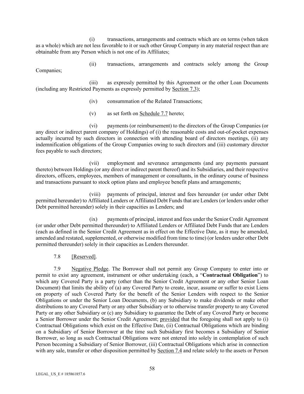 58 LEGAL_US_E # 185861857.6 (i) transactions, arrangements and contracts which are on terms (when taken as a whole) which are not less favorable to it or such other Group Company in any material respect than are obtainable from any Person which is not one of its Affiliates; (ii) transactions, arrangements and contracts solely among the Group Companies; (iii) as expressly permitted by this Agreement or the other Loan Documents (including any Restricted Payments as expressly permitted by Section 7.3); (iv) consummation of the Related Transactions; (v) as set forth on Schedule 7.7 hereto; (vi) payments (or reimbursement) to the directors of the Group Companies (or any direct or indirect parent company of Holdings) of (i) the reasonable costs and out-of-pocket expenses actually incurred by such directors in connection with attending board of directors meetings, (ii) any indemnification obligations of the Group Companies owing to such directors and (iii) customary director fees payable to such directors; (vii) employment and severance arrangements (and any payments pursuant thereto) between Holdings (or any direct or indirect parent thereof) and its Subsidiaries, and their respective directors, officers, employees, members of management or consultants, in the ordinary course of business and transactions pursuant to stock option plans and employee benefit plans and arrangements; (viii) payments of principal, interest and fees hereunder (or under other Debt permitted hereunder) to Affiliated Lenders or Affiliated Debt Funds that are Lenders (or lenders under other Debt permitted hereunder) solely in their capacities as Lenders; and (ix) payments of principal, interest and fees under the Senior Credit Agreement (or under other Debt permitted thereunder) to Affiliated Lenders or Affiliated Debt Funds that are Lenders (each as defined in the Senior Credit Agreement as in effect on the Effective Date, as it may be amended, amended and restated, supplemented, or otherwise modified from time to time) (or lenders under other Debt permitted thereunder) solely in their capacities as Lenders thereunder. 7.8 [Reserved]. 7.9 Negative Pledge. The Borrower shall not permit any Group Company to enter into or permit to exist any agreement, instrument or other undertaking (each, a “Contractual Obligation”) to which any Covered Party is a party (other than the Senior Credit Agreement or any other Senior Loan Document) that limits the ability of (a) any Covered Party to create, incur, assume or suffer to exist Liens on property of such Covered Party for the benefit of the Senior Lenders with respect to the Senior Obligations or under the Senior Loan Documents, (b) any Subsidiary to make dividends or make other distributions to any Covered Party or any other Subsidiary or to otherwise transfer property to any Covered Party or any other Subsidiary or (c) any Subsidiary to guarantee the Debt of any Covered Party or become a Senior Borrower under the Senior Credit Agreement; provided that the foregoing shall not apply to (i) Contractual Obligations which exist on the Effective Date, (ii) Contractual Obligations which are binding on a Subsidiary of Senior Borrower at the time such Subsidiary first becomes a Subsidiary of Senior Borrower, so long as such Contractual Obligations were not entered into solely in contemplation of such Person becoming a Subsidiary of Senior Borrower, (iii) Contractual Obligations which arise in connection with any sale, transfer or other disposition permitted by Section 7.4 and relate solely to the assets or Person