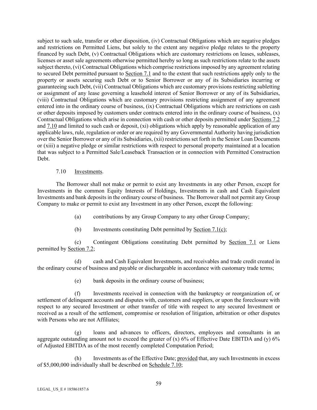 59 LEGAL_US_E # 185861857.6 subject to such sale, transfer or other disposition, (iv) Contractual Obligations which are negative pledges and restrictions on Permitted Liens, but solely to the extent any negative pledge relates to the property financed by such Debt, (v) Contractual Obligations which are customary restrictions on leases, subleases, licenses or asset sale agreements otherwise permitted hereby so long as such restrictions relate to the assets subject thereto, (vi) Contractual Obligations which comprise restrictions imposed by any agreement relating to secured Debt permitted pursuant to Section 7.1 and to the extent that such restrictions apply only to the property or assets securing such Debt or to Senior Borrower or any of its Subsidiaries incurring or guaranteeing such Debt, (vii) Contractual Obligations which are customary provisions restricting subletting or assignment of any lease governing a leasehold interest of Senior Borrower or any of its Subsidiaries, (viii) Contractual Obligations which are customary provisions restricting assignment of any agreement entered into in the ordinary course of business, (ix) Contractual Obligations which are restrictions on cash or other deposits imposed by customers under contracts entered into in the ordinary course of business, (x) Contractual Obligations which arise in connection with cash or other deposits permitted under Sections 7.2 and 7.10 and limited to such cash or deposit, (xi) obligations which apply by reasonable application of any applicable laws, rule, regulation or order or are required by any Governmental Authority having jurisdiction over the Senior Borrower or any of its Subsidiaries, (xii) restrictions set forth in the Senior Loan Documents or (xiii) a negative pledge or similar restrictions with respect to personal property maintained at a location that was subject to a Permitted Sale/Leaseback Transaction or in connection with Permitted Construction Debt. 7.10 Investments. The Borrower shall not make or permit to exist any Investments in any other Person, except for Investments in the common Equity Interests of Holdings, Investments in cash and Cash Equivalent Investments and bank deposits in the ordinary course of business. The Borrower shall not permit any Group Company to make or permit to exist any Investment in any other Person, except the following: (a) contributions by any Group Company to any other Group Company; (b) Investments constituting Debt permitted by Section 7.1(c); (c) Contingent Obligations constituting Debt permitted by Section 7.1 or Liens permitted by Section 7.2; (d) cash and Cash Equivalent Investments, and receivables and trade credit created in the ordinary course of business and payable or dischargeable in accordance with customary trade terms; (e) bank deposits in the ordinary course of business; (f) Investments received in connection with the bankruptcy or reorganization of, or settlement of delinquent accounts and disputes with, customers and suppliers, or upon the foreclosure with respect to any secured Investment or other transfer of title with respect to any secured Investment or received as a result of the settlement, compromise or resolution of litigation, arbitration or other disputes with Persons who are not Affiliates; (g) loans and advances to officers, directors, employees and consultants in an aggregate outstanding amount not to exceed the greater of (x) 6% of Effective Date EBITDA and (y) 6% of Adjusted EBITDA as of the most recently completed Computation Period; (h) Investments as of the Effective Date; provided that, any such Investments in excess of $5,000,000 individually shall be described on Schedule 7.10;