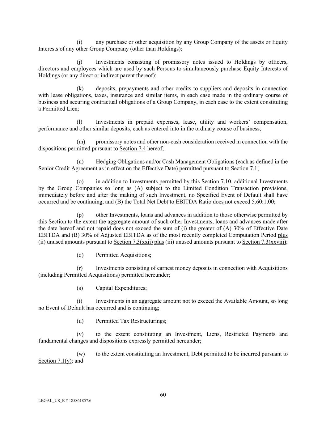 60 LEGAL_US_E # 185861857.6 (i) any purchase or other acquisition by any Group Company of the assets or Equity Interests of any other Group Company (other than Holdings); (j) Investments consisting of promissory notes issued to Holdings by officers, directors and employees which are used by such Persons to simultaneously purchase Equity Interests of Holdings (or any direct or indirect parent thereof); (k) deposits, prepayments and other credits to suppliers and deposits in connection with lease obligations, taxes, insurance and similar items, in each case made in the ordinary course of business and securing contractual obligations of a Group Company, in each case to the extent constituting a Permitted Lien; (l) Investments in prepaid expenses, lease, utility and workers’ compensation, performance and other similar deposits, each as entered into in the ordinary course of business; (m) promissory notes and other non-cash consideration received in connection with the dispositions permitted pursuant to Section 7.4 hereof; (n) Hedging Obligations and/or Cash Management Obligations (each as defined in the Senior Credit Agreement as in effect on the Effective Date) permitted pursuant to Section 7.1; (o) in addition to Investments permitted by this Section 7.10, additional Investments by the Group Companies so long as (A) subject to the Limited Condition Transaction provisions, immediately before and after the making of such Investment, no Specified Event of Default shall have occurred and be continuing, and (B) the Total Net Debt to EBITDA Ratio does not exceed 5.60:1.00; (p) other Investments, loans and advances in addition to those otherwise permitted by this Section to the extent the aggregate amount of such other Investments, loans and advances made after the date hereof and not repaid does not exceed the sum of (i) the greater of (A) 30% of Effective Date EBITDA and (B) 30% of Adjusted EBITDA as of the most recently completed Computation Period plus (ii) unused amounts pursuant to Section 7.3(xxii) plus (iii) unused amounts pursuant to Section 7.3(xxviii); (q) Permitted Acquisitions; (r) Investments consisting of earnest money deposits in connection with Acquisitions (including Permitted Acquisitions) permitted hereunder; (s) Capital Expenditures; (t) Investments in an aggregate amount not to exceed the Available Amount, so long no Event of Default has occurred and is continuing; (u) Permitted Tax Restructurings; (v) to the extent constituting an Investment, Liens, Restricted Payments and fundamental changes and dispositions expressly permitted hereunder; (w) to the extent constituting an Investment, Debt permitted to be incurred pursuant to Section 7.1(y); and